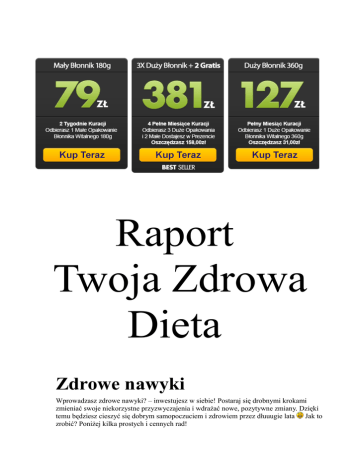 Raport Twoja Zdrowa Dieta Zdrowe nawyki Wprowadzasz zdrowe nawyki? – inwestujesz w siebie! Postaraj się drobnymi krokami zmieniać swoje niekorzystne przyzwyczajenia i wdrażać nowe, pozytywne zmiany. Dzięki temu będziesz cieszyć się dobrym samopoczuciem i zdrowiem przez dłuuugie lata Jak to zrobić? Poniżej kilka prostych i cennych rad! Zaczynaj dzień od śniadania Nie masz czasu? Głód rano Ci nie doskwiera? Pamiętaj, że śniadanie to jeden z najważniejszych posiłków w ciągu dnia! Absolutnie nie można go pomijać! Wbrew pozorom, powinno być też całkiem obfite. Warto, żeby nie składało się jedynie z kanapki, ale także ze szklanki mleka, kefiru czy porcji owoców. Jedz regularnie Dzięki temu Twój organizm przez cały dzień będzie mógł korzystać z dostarczanej mu energii! Ustal godziny posiłków i trzymaj się ich przez cały tydzień. Ważne jest, aby przerwy pomiędzy nimi nie były zbyt długie. Po dwóch, trzech godzinach od poprzedniego posiłku zacznij myśleć o następnym. Spożywaj różnorodne pokarmy Dlaczego? Żeby dostarczać organizmowi wszystkich niezbędnych substancji. Postaraj się, aby na obiad codziennie jeść coś innego. Prawie zawsze na drugie danie serwujesz ziemniaki? Wypróbuj kasze, makarony, ryże. Na rynku jest cała masa produktów, które warto przetestować. Bycie otwartym na nowe smaki popłaca Twojemu zdrowiu! Nie bój się wypróbować wasabi, pomelo czy soji. Nie zapominaj o napojach Zdrowa dieta to nie tylko jedzenie! To też picie Duże spożycie płynów to mus. Dziennie należy ich spożywać około 2-2,5 litra. Ogranicz kawę i mocną herbatę, a zamiast nich pij więcej wód mineralnych, soków owocowych i warzywnych. Zwracaj uwagę na ich skład! Szukaj soków 100%, bez dodatku cukru i słodzików. Masz czas i ochotę? Kupuj owoce i soki wyciskaj własnoręcznie! Zobaczysz, że tak zrobiony sok to coś zupełnie innego niż napój z kartonika. Mniam! Pamiętaj o sporcie Regularna aktywność fizyczna to klucz do zdrowia. Specjaliści zalecają zasadę „3x30x130”. Co ona oznacza? Sport uprawiany co najmniej „3 razy w tygodniu – przez 30 minut – z pracą serca około 130 uderzeń na minutę.” Wybierz taką formą ćwiczeń, która jest dla Ciebie łatwo dostępna i sprawia przyjemność. Tylko wtedy będziesz w stanie cieszyć się sportem regularnie i z uśmiechem na twarzy. Znajdź czas na relaks Ludzie zestresowani i zapracowani chorują częściej, ponieważ ich układ odpornościowy jest osłabiony. Pamiętaj, że weekend to weekend - czas, który trzeba poświęcić sobie, przyjaciołom i rodzinie. Może warto czasami zorganizować grilla dla najbliższych? Przejść się do kina, teatru? Zapisać na jogę albo kurs tańca? Nie zapominaj o badaniach kontrolnych Czy wiesz, ile chorób można łatwo wyleczyć, jeżeli zostaną szybko zdiagnozowane? Pamiętaj, że dbanie o siebie to przede wszystkim dbanie o własnej zdrowie! 1. Raz w roku wykonuj morfologię, a jej wynik konsultuj z lekarzem. 2. Korzystaj z programów profilaktycznych organizowanych w Twoim mieście/miejscu Twojego zamieszkania. 3. Nie zapominaj także o regularnych wizytach u stomatologa. W ramach świadczeń Narodowe Funduszu Zdrowia możesz raz na 12 miesięcy korzystać z bezpłatnego przeglądu zębów oraz usuwania kamienia nazębnego. Zdrowe nawyki zacznij wdrażać już teraz! Świadome odżywianie Hipokrates stwierdził, że jesteśmy tym, co spożywamy. Jednak czy w XXI wieku wiemy, co jemy? Co tak naprawdę znajduje się w produktach spożywczych? Postęp technologiczny i wymagania klienta sprawiły, że proces produkcji żywności wygląda zupełnie inaczej niż te paręnaście lat temu… Z czego naturalnie składa się żywność, a co dodają do niej producenci? Chemiczne zdrowie Z chemicznego punktu widzenia pokarmy, czy to pochodzenia roślinnego czy zwierzęcego, składają się z węglowodanów, tłuszczów i białek. Dodatkowo, znajdują się w nich witaminy, składniki mineralne, a także substancje biologiczne czynne, takie jak flawonoidy. Poszczególne produkty spożywcze różnią się składem. Co trzeba wiedzieć o węglowodanach? Przetwory zbożowe, takie jak pieczywo, makarony, ryże czy kasze są bogatym źródłem węglowodanów. To właśnie one powinny dostarczać ponad połowę dziennej wartości energetycznej diety! W wyraźny sposób widać to w piramidzie zdrowego żywienia, której stanowią podstawę. Ponadto, pokarmy zbożowe są bogate w składniki mineralne, szczególnie żelazo, magnez, cynk, miedź oraz witaminy z grupy B. … o białku? Z kolei najlepszymi źródłami białka są jaja, mleko i jego przetwory, sery twarogowe oraz żółte, drób i ryby. 1. Białko jest podstawowym budulcem organizmu. 2. Bierze udział w procesach związanych ze wzrostem organizmu oraz procesami obronnymi. 3. Pełni funkcję hormonów i enzymów. 4. Jest szczególnie ważne dla wzrostu i rozwoju, a także regeneracji organizmu osób chorujących. … o tłuszczach? Niezbędny składnik zdrowej diety. Panuje powszechna opinia, że trzeba ich unikać, ale chodzi jedynie o ograniczanie i dobór tych najzdrowszych. 1. W organizmie pełnią przede wszystkim funkcję skondensowanego źródła energii. 2. Tłuszcze chronią ważne dla życia narządy przed urazami, na przykład nerki. 3. Ich źródłem są oleje, masła, margaryny, nasiona roślin oleistych, mięso, wędliny i produkty mleczne. Trzeba pamiętać, że tylko część tłuszczy ma charakter widoczny – np. biała obwódka wędliny. Reszta jest zupełnie niezauważalna! Dla naszego zdrowia najcenniejsze są tłuszcze pochodzenia roślinnego, a więc oleje, szczególnie tłoczone na zimno, nasiona dyni, słonecznika czy sezamu oraz tłuszcze rybie. … o witaminach i minerałach? Mimo że, nie mają żadnej wartości energetycznej, pełnią w organizmie wiele funkcji, koniecznych dla zachowania zdrowia. Co produkt spożywczy, to inna mieszanka witami