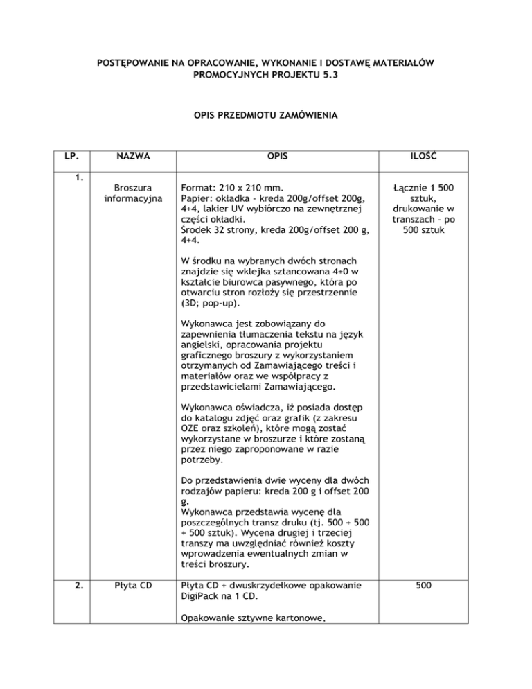 POSTĘPOWANIE NA OPRACOWANIE, WYKONANIE I DOSTAWĘ MATERIAŁÓW PROMOCYJNYCH PROJEKTU 5.3 OPIS PRZEDMIOTU ZAMÓWIENIA LP. NAZWA OPIS ILOŚĆ Broszura informacyjna Format: 210 x 210 mm. Papier: okładka - kreda 200g/offset 200g, 4+4, lakier UV wybiórczo na zewnętrznej części okładki. Środek 32 strony, kreda 200g/offset 200 g, 4+4. Łącznie 1 500 sztuk, drukowanie w transzach – po 500 sztuk 1. W środku na wybranych dwóch stronach znajdzie się wklejka sztancowana 4+0 w kształcie biurowca pasywnego, która po otwarciu stron rozłoży się przestrzennie (3D; pop-up). Wykonawca jest zobowiązany do zapewnienia tłumaczenia tekstu na język angielski, opracowania projektu graficznego broszury z wykorzystaniem otrzymanych od Zamawiającego treści i materiałów oraz we współpracy z przedstawicielami Zamawiającego. Wykonawca oświadcza, iż posiada dostęp do katalogu zdjęć oraz grafik (z zakresu OZE oraz szkoleń), które mogą zostać wykorzystane w broszurze i które zostaną przez niego zaproponowane w razie potrzeby. Do przedstawienia dwie wyceny dla dwóch rodzajów papieru: kreda 200 g i offset 200 g. Wykonawca przedstawia wycenę dla poszczególnych transz druku (tj. 500 + 500 + 500 sztuk). Wycena drugiej i trzeciej transzy ma uwzględniać również koszty wprowadzenia ewentualnych zmian w treści broszury. 2. Płyta CD Płyta CD + dwuskrzydełkowe opakowanie DigiPack na 1 CD. Opakowanie sztywne kartonowe, 500 obustronnie zadrukowane okładki, tray na 1 płytę CD plastikowy, przezroczysty. Nadruk na opakowaniu 4+4. Opakowanie pokryte folią mat 1/0. Na płycie CD druk cmyk. Projekt graficzny całości jest do opracowania według wskazań Zamawiającego. Zamówienie obejmuje też wgranie treści na płytę CD oraz konfekcjonowanie. 3. Ulotka szkoleń/ usług Projektu Format ulotki 210 mm x 630 mm (czyli 210 mm x 210 mm + 210 mm + 210 mm, podwójnie bigowana, składana w C). Format po złożeniu: 210 mm x 210 mm, Papier: kreda 200g/offset 200 g, 4+4 Łącznie 1 500 sztuk, drukowanie w transzach – po 500 sztuk Zamówienie obejmuje opracowanie projektu graficznego. Przy opracowaniu projektu ulotki Wykonawca będzie współpracować z przedstawicielami Zamawiającego i uwzględniać przekazywane uwagi. Do przedstawienia dwie wyceny dla dwóch rodzajów papieru – kreda 200 g i offset 200 g. Wykonawca przedstawia wycenę dla poszczególnych transz druku (tj. 500 + 500 + 500 sztuk). Wycena kolejnych transz ma uwzględniać koszty wprowadzenia ewentualnych zmian w treści ulotki. 4. Broszura biurowiec pasywny Format broszury 210 mm x 630 mm (czyli 210 mm x 210 mm + 210 mm + 210 mm, podwójnie bigowana, składana w C). Format po złożeniu: 210 mm x 210 mm, Papier: kreda 200g/offset 200 g, 4+4 Wykonawca jest zobowiązany do opracowania projektu graficznego broszury z wykorzystaniem otrzymanych od Zamawiającego treści oraz we współpracy z przedstawicielami Zamawiającego. Wykonawca przedstawia wycenę dla poszczególnych transz druku (500 sztuk + 500 sztuk + 500 sztuk). Możliwe 1 500 sztuk– druk w transzach po 500 sztuk wprowadzenie aktualizacji treści przy dodruku drugiej transzy. Wycena uwzględnia dwa rodzaje papieru - papieru – kreda 200 g i offset 200 g. 5. Teczka papierowa Format: A4 (210 x 297) z trzema skrzydłami i rzepem, folia mat + lakier UV wybiórczo na okładce (1/0). Kolor: 4+0 cmyk (jedna strona teczki pełen kolor, wnętrze teczki białe). 500 Wykonawca opracuje projekt graficzny teczki oraz wykrojnika, uwzględniając uwagi Zamawiającego. Po realizacji zamówienia Wykonawca przekazuje wykrojnik na własność zamawiającemu. 6. Plakat Wycena uwzględnia koszty druku transz oraz dwa rodzaje papieru – kredę 350 g i karton 300 g; Format B2 (480 mm x 680 mm), 4+0, kreda 135 g 300 Wykonawca opracuje jeden projekt plakatu z uwzględnieniem uwag i we współpracy z przedstawicielami Zamawiającego. 7. Roll – up 10 sztuk roll-up’ów + pokrowce. Format roll-up’a:1200 x 2150, zabezpieczenie: laminat mat; frontlit, pełen kolor. Kaseta z aluminium – najwyższej jakości, z 2 nogami, składany/e 3-częściowy/e maszt/y aluminiowy/e; aluminiowa górna listwa zatrzaskowa; mechanizm umożliwiający łatwą wymianę grafiki. Wykonawca przygotuje 5 projektów nadruku według wskazań i z wykorzystaniem materiałów przekazanych przez Zamawiającego. Wykonawca zapewnia 12 miesięczną gwarancję na mechanizm oraz wydruk. Pokrowce z uchwytami. Całość musi być produktem wysokiej jakości – trwałym i solidnym. 10 8. Długopis metalowy Długopis metalowy, srebrny. 1 000 + 1 000 Kolor wkładu: niebieski ,Typ wkładu: Elite – wymienny. Odblokowanie wkładu - przez wciśnięcie. Wykonawca zobowiązany jest przedstawić 5 rodzajów długopisów metalowych. Wyboru dokona Zamawiający. Sugerowane wzory: mumbei, cosmo, lotus, Olimpia, sarky, maestro, madrid. Na wybranym rodzaju długopisu, Wykonawca naniesie metodą grawera laserowego logotypy projektu. 9. Bloczek Wycena dla dwóch transz po 1000 sztuk. Format a5 (148 x 210), papier – offset 80 g; druk 4+0 (jednostronnie) lub 1+0; ilość kartek 32 i 50. 1500 Notes/ bloczek arkuszy z nadrukiem reklamowym. Wykonawca przedstawia 4 wyceny w zależności od ilości kartek i koloru wydruku. Do naniesienia logotypy unijne zgodnie z wskazaniami „Przewodnika po promocji projektów” 10. Długopis eco Długopis z materiału ekologicznego. Do wyboru: papier z surowców wtórnych (kolor makulaturowy), drewno lub plastik biodegradowalny. Wkład niebieski. 1500 Dopuszcza się długopis z elementami plastikowymi w kolorze jasnym zielonym. Wykonawca przedstawi do 5 wzorów długopisów według powyższej specyfikacji – Zamawiający wybierze jeden. W zależności od materiału, z którego wykonany będzie długopis, Wykonawca wykona na długopisie stosowna techniką nadruk zgodny ze wskazaniami „Przewodnika po promocji projektów”. 11. Pamięć USB Pamięć USB flash drive w obudowie plastikowej w kształcie 