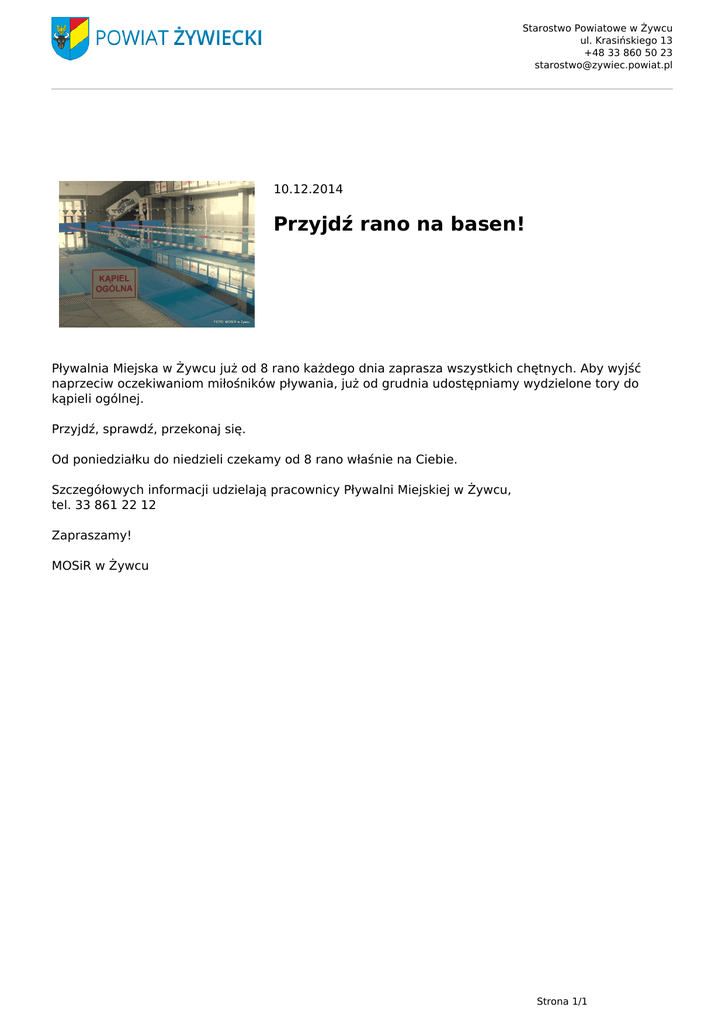 Starostwo Powiatowe w Żywcu ul. Krasińskiego 13 +48 33 860 50 23 [email protected] 10.12.2014 Przyjdź rano na basen! Pływalnia Miejska w Żywcu już od 8 rano każdego dnia zaprasza wszystkich chętnych. Aby wyjść naprzeciw oczekiwaniom miłośników pływania, już od grudnia udostępniamy wydzielone tory do kąpieli ogólnej. Przyjdź, sprawdź, przekonaj się. Od poniedziałku do niedzieli czekamy od 8 rano właśnie na Ciebie. Szczegółowych informacji udzielają pracownicy Pływalni Miejskiej w Żywcu, tel. 33 861 22 12 Zapraszamy! MOSiR w Żywcu Strona 1/1 Powered by TCPDF (www.tcpdf.org)