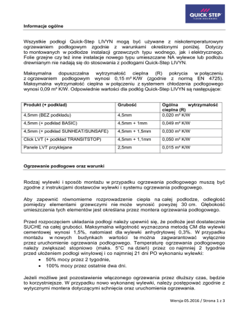 Informacje ogólne Wszystkie podłogi Quick-Step LIVYN mogą być używane z niskotemperaturowym ogrzewaniem podłogowym zgodnie z warunkami określonymi poniżej. Dotyczy to montowanych w podłodze instalacji grzewczych typu wodnego, jak i elektrycznego. Folie grzejne czy też inne instalacje nowego typu umieszczane NA wylewce lub podłożu drewnianym nie nadają się do stosowania z podłogami Quick-Step LIVYN. Maksymalna dopuszczalna wytrzymałość cieplna (R) pokrycia w połączeniu z ogrzewaniem podłogowym wynosi 0,15 m² K/W (zgodnie z normą EN 4725). Maksymalna wytrzymałość cieplna w połączeniu z systemem chłodzenia podłogowego wynosi 0,09 m² K/W. Odpowiednie wartości dla podłóg Quick-Step LIVYN są następujące: Produkt (+ podkład) Grubość 4,5mm (BEZ podkładu) 4,5mm Ogólna wytrzymałość cieplna (R) 0,020 m² K/W 4,5mm (+ podkład BASIC) 4,5mm + 1mm 0,049 m² K/W 4,5mm (+ podkład SUNHEAT/SUNSAFE) 4,5mm + 1,5mm 0,030 m² K/W Click LVT (+ podkład TRANSITSTOP) 4,5mm + 1,1mm 0,050 m² K/W Panele LVT przyklejane 2,5mm 0,015 m² K/W Ogrzewanie podłogowe oraz warunki Rodzaj wylewki i sposób montażu w przypadku ogrzewania podłogowego muszą być zgodne z instrukcjami dostawców wylewki i systemu ogrzewania podłogowego. Aby zapewnić równomierne rozprowadzenie ciepła na całej podłodze, odległość pomiędzy elementami grzewczymi nie może wynosić powyżej 30 cm. Głębokość umieszczenia tych elementów jest określana przez montera ogrzewania podłogowego. Przed rozpoczęciem układania podłogi należy upewnić się, że podłoże jest dostatecznie SUCHE na całej grubości. Maksymalna wilgotność wyznaczona metodą CM dla wylewki cementowej wynosi 1,5%, natomiast dla wylewki anhydrytowej 0,3%. W przypadku montażu w nowych budynkach wartości te można zagwarantować wyłącznie przez uruchomienie ogrzewania podłogowego. Temperaturę ogrzewania podłogowego należy zwiększać stopniowo (maks. 5°C na dzień) przez co najmniej 2 tygodnie przed ułożeniem podłogi winylowej i co najmniej 21 dni PO wykonaniu wylewki: 50% mocy przez 2 tygodnie, 100% mocy przez ostatnie dwa dni. Jeżeli możliwe jest pozostawienie włączonego ogrzewania przez dłuższy czas, będzie to korzystniejsze. W przypadku nowo wykonanej wylewki, należy postępować zgodnie z wytycznymi montera dotyczącymi schnięcia oraz uruchomienia ogrzewania. Wersja 05.2016 / Strona 1 z 3 Przedstawiony powinien zostać odpowiedni harmonogram. W razie potrzeby należy o niego poprosić. Instrukcje instalacji Temperatura w pomieszczeniu, w którym jest układana podłoga Quick-Step LIVYN musi wynosić co najmniej 18°C. Jeśli temperatura wynosi mniej niż 18°C, należy włączyć ogrzewanie podłogowe na 50% do chwili uzyskania w pokoju temperatury wynoszącej co najmniej 18°C Po uzyskaniu temperatury 18°C ogrzewanie może zostać wyłączone. Oczywiście ogólne instrukcje montażu podłóg Quick-Step LIVYN bez ogrzewania podłogowego również mają zastosowanie, o ile nie zostały wyłączone poniżej. Przy montażu podłóg LVT (zarówno przyklejanych, jak również nie) zaleca się pozostawienie 5 mm szczelin dylatacyjnych oraz montaż profilu pomiędzy obszarami ogrzewanymi oraz nieogrzewanymi, w związku ze zwiększonymi przesunięciami ogrzewanej podłogi w porównaniu do podłogi nieogrzewanej. PO ułożeniu podłogi należy odczekać co najmniej 48 godzin przed ponownym uruchomieniem ogrzewania. Temperaturę należy zwiększać stopniowo (tj. 5°C na dzień). Maksymalna dopuszczalna temperatura kontaktu podłogi Quick-Step LIVYN wynosi 27°C. Maksymalna temperatura gorącej wody z urządzenia grzewczego wynosi 45°C jednak zwykle jest ona niższa w większości nowych systemów. ZAWSZE zmieniać temperaturę stopniowo, rozpoczynając lub kończąc okres grzewczy. Temperatura w pokojach powinna być utrzymywana na poziomie 18-30°C. Nie dopuszczać do akumulacji ciepła przez dywany lub chodniki albo pozostawiając niedostateczną przestrzeń pomiędzy meblami a podłogą. Wahania temperatur w trakcie roku mogą spowodować zmianę wymiarów. Chłodzenie podłogowe Aby uniknąć uszkodzenia podłogi, temperatura wody zasilającej system chłodzenia nie może spaść poniżej wyznaczonego poziomu, tj. poniżej temperatury punktu rosy. Niskie temperatury powodują skraplanie i prowadzą do uszkodzenia konstrukcji podłogi. Termostatów znajdujących się w pomieszczeniu nigdy nie należy ustawiać na temperaturę niższą o 5°C od temperatury panującej w pomieszczeniu. A zatem przy temperaturze 25°C termostatu w pomieszczeniu nie należy ustawiać na wartość poniżej 20°C. Obwód chłodzący musi być wyposażony w sterownik, który zapobiega spadkowi temperatury cieczy chłodzącej poniżej 18-22°C. Dokładna wartość zależy od strefy klimatycznej, w której ułożona jest podłoga. W strefach o wysokiej wilgotności Wersja 05.2016 / Strona 2 z 3 względnej wartość minimalna wynosi 22°C. Przy średnim poziomie wilgotności i temperatury może sięgać nawet 18°C. Niezastosowanie się do tych instrukcji doprowadzi do unieważnienia gwarancji na podłogę Quick-Step LIVYN. W przypadku jakichkolwiek dalszych pytań lub problemów zachęcamy do kontaktu z działem technicznym: Unilin Flooring, Dział techniczny – Ooigemstraat 3 8710 Wielsbeke – Belgia, Europa E-mail: [email protected] Obsługa Klienta: +32 (0) 56 67 56 56 Wersja 05.2016 / Strona 3 z 3