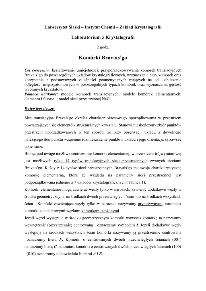 Uniwersytet Śląski – Instytut Chemii – Zakład Krystalografii Laboratorium z Krystalografii 2 godz. Komórki Bravais’go Cel ćwiczenia: kształtowanie umiejętności: przyporządkowywania komórek translacyjnych Bravais’go do poszczególnych układów krystalograficznych, wyznaczania bazy komórek oraz korzystania z podstawowych zależności geometrycznych mających na celu obliczenia odległości międzyatomowych w poszczególnych typach komórek oraz wyznaczania gęstość wybranych kryształów. Pomoce naukowe: modele komórek translacyjnych; modele komórek elementarnych: diamentu i fluorytu; model sieci przestrzennej NaCl. Wstęp teoretyczny Sieć translacyjna Bravais'go określa charakter okresowego uporządkowania w przestrzeni powtarzających się elementów strukturalnych kryształu. Stanowi nieskończony zbiór punktów przestrzeni uporządkowanych w ten sposób, że przy obserwacji układu z dowolnego należącego doń punktu wzajemne rozmieszczenie punktów układu i jego orientacja są zawsze takie same. Biorąc pod uwagę możliwe centrowanie komórki elementarnej, w przestrzeni trójwymiarowej jest możliwych tylko 14 typów translacyjnych sieci przestrzennych zwanych sieciami Bravais'go. Każdy z 14 typów sieci przestrzennych Bravais'go ma swoją charakterystyczną komórkę elementarną, która ze względu na parametry sieci przestrzennej jest podporządkowana jednemu z 7 układów krystalograficznych (Tablica 1). Komórki elementarne mogą zawierać węzły tylko w narożach, zawierać dodatkowe węzły w środku geometrycznym, na środkach dwóch przeciwległych ścian lub na środkach wszystkich ścian . Komórki zawierające węzły tylko w narożach nazywamy prymitywnymi, natomiast komórki z dodatkowymi węzłami komórkami złożonymi. Jeżeli węzeł występuje w środku geometrycznym komórki wówczas komórkę tą nazywamy wewnętrznie (przestrzennie) centrowaną i oznaczamy symbolem I. Jeżeli dodatkowe węzły występują na środkach wszystkich ścian komórki nazywamy ją przestrzennie centrowaną i oznaczamy literą F. Komórki o centrowanych dwóch przeciwległych ścianach (001) oznaczamy literą C, natomiast komórki o centrowanych dwóch przeciwległych ścianach (100) i (010) oznaczamy odpowiednio literami A i B. Tablica 1. Typy komórek Bravais'go w poszczególnych układach Układ krystalograficzny Prymitywna P Wewnętrznie centrowana I Przestrzennie Centrowana F Centrowana na podstawach C (001) Trójskośny baza: 0, 0, 0 Jednoskośny baza: 0, 0, 0 baza: 0, 0, 0 ½, ½, 0 Rombowy baza: 0, 0, 0 baza: 0, 0, 0; ½,½, ½ baza: 0, 0, 0 baza: 0, 0, 0; ½ , ½, ½ baza: 0, 0, 0 baza: 0, 0, 0; ½, ½, ½ baza: 0, 0, 0; 0, ½, ½; ½, 0, ½; ½, ½, 0 Tetragonalny Regularny baza: 0, 0, 0; 0, ½, ½; ½, 0, ½; ½, ½, 0 Heksagonalny z trygonalnym baza: 0, 0, 0 Romboedryczny baza: 0, 0, 0 Baza komórki – współrzędne węzłów komórki elementarnej. baza: 0, 0, 0; ½, ½, 0 We wszystkich układach krystalograficznych występują komórki prymitywne (P). Tylko w układzie rombowym występują wszystkie typy sieci brawesowskich, w pozostałych obok sieci prymitywnej występują jedna lub dwie sieci centrowane. Powodem jest możliwość sprowadzania sieci centrowanych do prymitywnej (o najmniejszej objętości) lub sieci centrowanej w inny sposób. Rys. 1. Przekształcenie komórki jednoskośnej typu B (010) w komórkę typu P. Rys. 2. Przekształcenie komórki jednoskośnej z typu F w komórkę typu C. Gęstość kryształu - w odniesieniu do jednej komórki elementarnej gęstość kryształu określa zależność: gdzie: Z – liczba cząsteczek (atomów) w komórce elementarnej, m - masa molowa, V – objętość komórki elementarnej, NA – liczba Avogadro (6,023·1023 molekuł/mol) Przykład Obliczyć gęstość kryształu KCl Z ClK+ Y X Z = 4 dla K+ i 4 dla ClV = a3 (układ regularny) dla KCl a = 6.293 Å (6,293×10-8 cm) d= , , , , 1,988 / Wykonanie ćwiczeń: Ćwiczenie 1 Przyporządkować podane modele komórek translacyjnych Bravais’go do poszczególnych układów krystalograficznych. Ćwiczenie 2 Korzystając z modeli komórek translacyjnych podać liczbę węzłów przypadających na jedną komórkę oraz wyznaczyć bazę komórki. Ćwiczenie 3 Korzystając z modeli komórek translacyjnych wykazać, że w układzie regularnym nie występują komórki typu C, a w układzie jednoskośnym nie mogą występować komórki typu F i typu I. Ćwiczenie 4 Korzystając z modelu komórki elementarnej diamentu i grafitu oznaczyć gęstość teoretyczną obu odmian alotropowych węgla. Ćwiczenie 5 Posługując się modelem sieci przestrzennej NaCl, podać typ komórki translacyjnej tego związku i wyznaczyć gęstość kryształu. Parametr sieci NaCl wynosi a0 = 5,6402 Å Ćwiczenie 7 Korzystając z modelu fluorytu, znając gęstość kryształu CaF2 ρ = 3,184 g/cm3, obliczyć parametr sieci a0. __________________________________________________________________________ Literatura: 1. Z. Kosturkiewicz, Metody krystalografii, Wydawnictwo Naukowe UAM, Poznań 2004. 2. Z. Trzaska-Durski i H. Trzaska-Durska, Podstawy krystalografii, Oficyna Wydawnicza Politechniki Warszawskiej, Warszawa 2003. 3. Z. Trzaska-Durski i H. Trzaska-Durska, Podstawy krystalografii strukturalnej i rentgenowskiej, PWN, Warszawa 1994. 4. Z. Bojarski, M. Gigla, K. Stróż i M. Surowiec, Krystalografia. Podręcznik wspomagany komputerowo, PWN, Warszawa 2001. 5. Z. Bojarski, M. Gigla, K. Stróż i M. Surowiec, Krystalografia, PWN, Warszawa 2007.