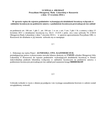 UCHWAŁA 498/2016/P Prezydium Okręgowej Rady Lekarskiej w Rzeszowie z dnia 13 września 2016 r. W sprawie wpisu do rejestru podmiotów wykonujących działalność leczniczą wyłącznie w zakładzie leczniczym na podstawie umowy z podmiotem leczniczym prowadzącym ten zakład na podstawie art. 106 ust. 1 pkt 2 , art. 104 ust. 1 w zw. z art. 5 ust. 2 pkt 1 lit. a ustawy z dnia 15 kwietnia 2011 o działaności leczniczej (t.j. Dz.U. 15.618 z późn. zm.) oraz uchwały Nr 2/2014 Okręgowej Rady Lekarskiej z dnia 7 stycznia 2014 r. w sprawie upoważnienia Prezydium ORL w Rzeszowie do działania w jej imieniu uchwala się co następuje: §1 1. Dokonuje się wpisu Pana/i AGNIESZKA EWA KAZIMIERCZUK posiadającej/go prawo wykonywania zawodu lekarza dentysty nr 2749199 członka Okręgowej Izby Lekarskiej w Rzeszowie do rejestru podmiotów wykonujących działalność leczniczą w formie indywidualnej praktyki lekarskiej wyłącznie w zakładzie leczniczym na podstawie umowy z podmiotem leczniczym prowadzącym ten zakład pod numerem księgi 000000186109 §2 Uchwała wchodzi w życie z dniem jej podjęcia i nie wymaga uzasadnienia bowiem w całości został uwzględniony wniosek. UCHWAŁA 499/2016/P Prezydium Okręgowej Rady Lekarskiej w Rzeszowie z dnia 13 września 2016 r. W sprawie wpisu do rejestru podmiotów wykonujących działalność leczniczą wyłącznie w zakładzie leczniczym na podstawie umowy z podmiotem leczniczym prowadzącym ten zakład na podstawie art. 106 ust. 1 pkt 2 , art. 104 ust. 1 w zw. z art. 5 ust. 2 pkt 1 lit. a ustawy z dnia 15 kwietnia 2011 o działaności leczniczej (t.j. Dz.U. 15.618 z późn. zm.) oraz uchwały Nr 2/2014 Okręgowej Rady Lekarskiej z dnia 7 stycznia 2014 r. w sprawie upoważnienia Prezydium ORL w Rzeszowie do działania w jej imieniu uchwala się co następuje: §1 1. Dokonuje się wpisu Pana/i ADRIAN WALCZAK posiadającej/go prawo wykonywania zawodu lekarza nr 1163241 członka Okręgowej Izby Lekarskiej w Tarnowie do rejestru podmiotów wykonujących działalność leczniczą w formie indywidualnej praktyki lekarskiej wyłącznie w zakładzie leczniczym na podstawie umowy z podmiotem leczniczym prowadzącym ten zakład pod numerem księgi 000000186005 §2 Uchwała wchodzi w życie z dniem jej podjęcia i nie wymaga uzasadnienia bowiem w całości został uwzględniony wniosek. UCHWAŁA 500/2016/P Prezydium Okręgowej Rady Lekarskiej w Rzeszowie z dnia 13 września 2016 r. W sprawie wpisu do rejestru podmiotów wykonujących działalność leczniczą wyłącznie w zakładzie leczniczym na podstawie umowy z podmiotem leczniczym prowadzącym ten zakład na podstawie art. 106 ust. 1 pkt 2 , art. 104 ust. 1 w zw. z art. 5 ust. 2 pkt 1 lit. a ustawy z dnia 15 kwietnia 2011 o działaności leczniczej (t.j. Dz.U. 15.618 z późn. zm.) oraz uchwały Nr 2/2014 Okręgowej Rady Lekarskiej z dnia 7 stycznia 2014 r. w sprawie upoważnienia Prezydium ORL w Rzeszowie do działania w jej imieniu uchwala się co następuje: §1 1. Dokonuje się wpisu Pana/i ANDRZEJ MARIA BIENIARZ posiadającej/go prawo wykonywania zawodu lekarza nr 3121593 członka Okręgowej Izby Lekarskiej w Rzeszowie do rejestru podmiotów wykonujących działalność leczniczą w formie indywidualnej praktyki lekarskiej wyłącznie w zakładzie leczniczym na podstawie umowy z podmiotem leczniczym prowadzącym ten zakład pod numerem księgi 000000185921 §2 Uchwała wchodzi w życie z dniem jej podjęcia i nie wymaga uzasadnienia bowiem w całości został uwzględniony wniosek. UCHWAŁA 501/2016/P Prezydium Okręgowej Rady Lekarskiej w Rzeszowie z dnia 13 września 2016 r. W sprawie wpisu do rejestru podmiotów wykonujących działalność leczniczą wyłącznie w zakładzie leczniczym na podstawie umowy z podmiotem leczniczym prowadzącym ten zakład na podstawie art. 106 ust. 1 pkt 2 , art. 104 ust. 1 w zw. z art. 5 ust. 2 pkt 1 lit. a ustawy z dnia 15 kwietnia 2011 o działaności leczniczej (t.j. Dz.U. 15.618 z późn. zm.) oraz uchwały Nr 2/2014 Okręgowej Rady Lekarskiej z dnia 7 stycznia 2014 r. w sprawie upoważnienia Prezydium ORL w Rzeszowie do działania w jej imieniu uchwala się co następuje: §1 1. Dokonuje się wpisu Pana/i NATALIA TASIOR posiadającej/go prawo wykonywania zawodu lekarza dentysty nr 1138083 członka Okręgowej Izby Lekarskiej w Rzeszowie do rejestru podmiotów wykonujących działalność leczniczą w formie indywidualnej praktyki lekarskiej wyłącznie w zakładzie leczniczym na podstawie umowy z podmiotem leczniczym prowadzącym ten zakład pod numerem księgi 000000186006 §2 Uchwała wchodzi w życie z dniem jej podjęcia i nie wymaga uzasadnienia bowiem w całości został uwzględniony wniosek. UCHWAŁA 502/2016/P Prezydium Okręgowej Rady Lekarskiej w Rzeszowie z dnia 13 września 2016 r. W sprawie wpisu do rejestru podmiotów wykonujących działalność leczniczą wyłącznie w zakładzie leczniczym na podstawie umowy z podmiotem leczniczym prowadzącym ten zakład na podstawie art. 106 ust. 1 pkt 2 , art. 104 ust. 1 w zw. z art. 5 ust. 2 pkt 1 lit. a ustawy z dnia 15 kwietnia 2011 o działaności leczniczej (t.j. Dz.U. 15.618 z późn. zm.) oraz uchwały Nr 2/2014 Okręgowej Rady Lekarskiej z dnia 7 stycznia 2014 r. w sprawie upoważnienia Prezydium ORL w Rzeszowie do działania w jej imieniu uchwala się co następuje: §1 1. Dokonuje się wpisu Pana/i ALICJA MILLER posiadającej/go prawo wykonywania zawodu lekarza nr 9001457 członka Okręgowej Izby Lekarskiej w Krakowie do rejestru podmiotów wykonujących działalność leczniczą w formie indywidualnej specjalistycznej praktyki lekarskiej wyłącznie w zakładzie leczniczym na podstawie umowy z podmiotem leczniczym prowadzącym ten zakład pod numerem księgi 000000058235 §2 Uchwała wchodzi w życie z dniem jej podjęcia i nie wymaga uzasadnienia bowiem w całości został uwzględniony wniosek. UCHWAŁA 503/2016/P Prezydium Okręgowej Rady Lekarskiej w Rzeszowie z dnia 13 września 2016 r. W