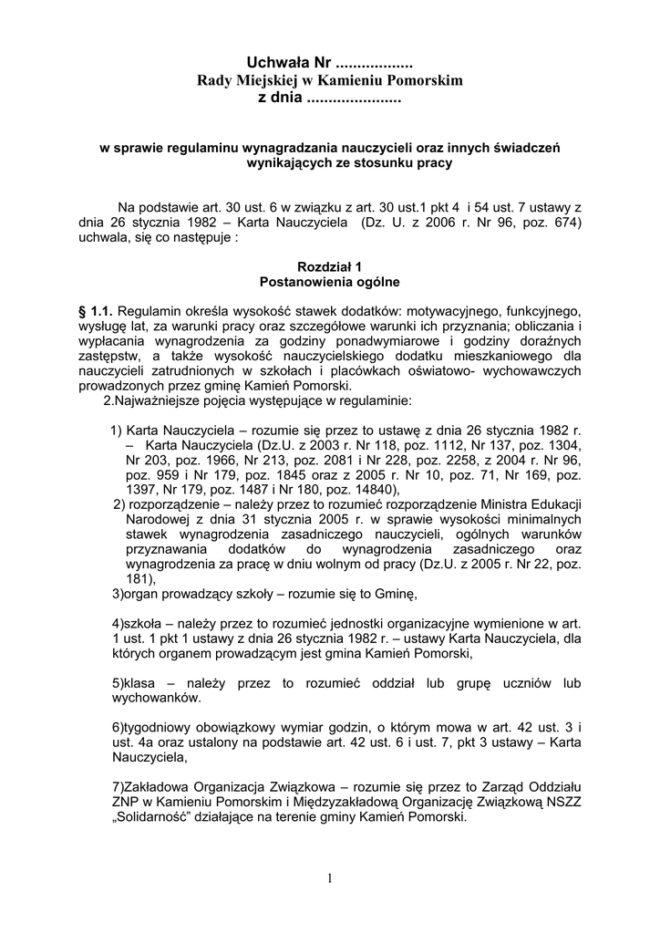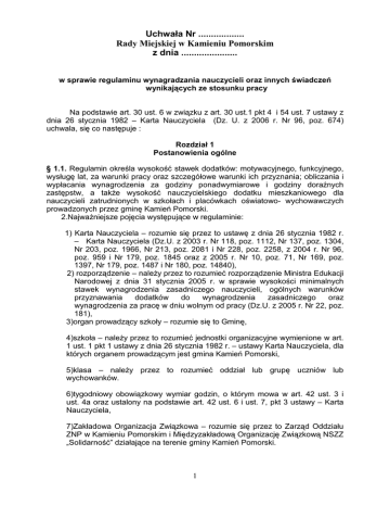 Uchwała Nr .................. Rady Miejskiej w Kamieniu Pomorskim z dnia ...................... w sprawie regulaminu wynagradzania nauczycieli oraz innych świadczeń wynikających ze stosunku pracy Na podstawie art. 30 ust. 6 w związku z art. 30 ust.1 pkt 4 i 54 ust. 7 ustawy z dnia 26 stycznia 1982 – Karta Nauczyciela (Dz. U. z 2006 r. Nr 96, poz. 674) uchwala, się co następuje : Rozdział 1 Postanowienia ogólne § 1.1. Regulamin określa wysokość stawek dodatków: motywacyjnego, funkcyjnego, wysługę lat, za warunki pracy oraz szczegółowe warunki ich przyznania; obliczania i wypłacania wynagrodzenia za godziny ponadwymiarowe i godziny doraźnych zastępstw, a takŜe wysokość nauczycielskiego dodatku mieszkaniowego dla nauczycieli zatrudnionych w szkołach i placówkach oświatowo- wychowawczych prowadzonych przez gminę Kamień Pomorski. 2.NajwaŜniejsze pojęcia występujące w regulaminie: 1) Karta Nauczyciela – rozumie się przez to ustawę z dnia 26 stycznia 1982 r. – Karta Nauczyciela (Dz.U. z 2003 r. Nr 118, poz. 1112, Nr 137, poz. 1304, Nr 203, poz. 1966, Nr 213, poz. 2081 i Nr 228, poz. 2258, z 2004 r. Nr 96, poz. 959 i Nr 179, poz. 1845 oraz z 2005 r. Nr 10, poz. 71, Nr 169, poz. 1397, Nr 179, poz. 1487 i Nr 180, poz. 14840), 2) rozporządzenie – naleŜy przez to rozumieć rozporządzenie Ministra Edukacji Narodowej z dnia 31 stycznia 2005 r. w sprawie wysokości minimalnych stawek wynagrodzenia zasadniczego nauczycieli, ogólnych warunków przyznawania dodatków do wynagrodzenia zasadniczego oraz wynagrodzenia za pracę w dniu wolnym od pracy (Dz.U. z 2005 r. Nr 22, poz. 181), 3)organ prowadzący szkoły – rozumie się to Gminę, 4)szkoła – naleŜy przez to rozumieć jednostki organizacyjne wymienione w art. 1 ust. 1 pkt 1 ustawy z dnia 26 stycznia 1982 r. – ustawy Karta Nauczyciela, dla których organem prowadzącym jest gmina Kamień Pomorski, 5)klasa – naleŜy przez to rozumieć oddział lub grupę uczniów lub wychowanków. 6)tygodniowy obowiązkowy wymiar godzin, o którym mowa w art. 42 ust. 3 i ust. 4a oraz ustalony na podstawie art. 42 ust. 6 i ust. 7, pkt 3 ustawy – Karta Nauczyciela, 7)Zakładowa Organizacja Związkowa – rozumie się przez to Zarząd Oddziału ZNP w Kamieniu Pomorskim i Międzyzakładową Organizację Związkową NSZZ „Solidarność” działające na terenie gminy Kamień Pomorski. 1 Rozdział 2 Dodatek za wysługę lat § 2.1. Nauczycielom przysługuje dodatek za wysługę lat w wysokości 1 % wynagrodzenia zasadniczego za kaŜdy rok pracy w okresach miesięcznych poczynając od czwartego roku pracy z tym, Ŝe dodatek ten nie moŜe przekroczyć 20 % wynagrodzenia zasadniczego. 2. Do okresów pracy uprawniających do dodatku za staŜ pracy wlicza się okresy poprzedniego zatrudnienia we wszystkich zakładach pracy, bez względu na sposób ustania stosunku pracy. 3. Nauczycielowi pozostającemu jednocześnie w więcej niŜ w jednym stosunku pracy, okresy uprawniające do dodatku za wysługę lat ustala się odrębnie dla kaŜdego stosunku pracy. Do okresu zatrudnienia uprawniającego do dodatku za wysługę lat nie wlicza się okresu pracy w innym zakładzie pracy, w którym pracownik jest lub był jednocześnie zatrudniony. Do okresu dodatkowego zatrudnienia nie podlegają zaliczeniu okresy podstawowego zatrudnienia. 4. Do okresów pracy uprawniających do dodatku za wysługę lat wlicza się takŜe inne okresy, jeŜeli z mocy odrębnych przepisów podlegają one wliczeniu do okresu pracy, od którego zaleŜą uprawnienia pracownicze. § 3 . Dodatek za wysługę lat przysługuje: 1) począwszy od pierwszego dnia miesiąca kalendarzowego następującego po miesiącu, w którym nauczyciel nabył prawo do dodatku lub do wyŜszej stawki dodatku, jeŜeli nabycie prawa nastąpiło w ciągu miesiąca, 2) za dany miesiąc, jeŜeli nabycie prawa do dodatku lub wyŜszej jego stawki nastąpiło od pierwszego dnia miesiąca. § 4. Dodatek za wysługę lat przysługuje nauczycielowi za okres urlopu dla poratowania zdrowia oraz za dni, za które otrzymuje wynagrodzenie chyba, Ŝe przepis szczególny stanowi inaczej. Dodatek ten przysługuje równieŜ za dni nieobecności w pracy z powodu niezdolności do pracy wskutek choroby bądź konieczności osobistego sprawowania opieki nad dzieckiem lub chorym członkiem rodziny, za które nauczyciel otrzymuje wynagrodzenie lub zasiłek z ubezpieczenia społecznego. § 5. Dodatek za wysługę lat wypłaca się z góry, w terminie wypłaty wynagrodzenia zasadniczego. Rozdział 3 Dodatek motywacyjny § 6. Nauczycielom moŜe być przyznany dodatek motywacyjny. § 7. Dodatek motywacyjny przyznaje się na czas określony, dwukrotnie w ciągu roku szkolnego na czas: 1) od 1 września do końca lutego 2) od 1 marca do 31 sierpnia 2 § 8.Tworzy się fundusz z przeznaczeniem na wypłatę dodatku motywacyjnego dla nauczycieli w wysokości 7% planowanych środków na wynagrodzenie zasadnicze dla nauczycieli. Dla dyrektorów w wysokości 40 % planowanych środków na wynagrodzenie zasadnicze dla dyrektorów w danej szkole. § 9. Dodatek motywacyjny dla nauczyciela nie moŜe być wyŜszy niŜ 40 %, a dla dyrektorów szkół i placówek nie wyŜszy niŜ 50 % wynagrodzenia zasadniczego. § 10. Podstawą przyznania nauczycielowi dodatku motywacyjnego są: 1) uzyskiwania przez uczniów, z uwzględnieniem ich moŜliwości oraz warunków pracy nauczyciela, dobrych osiągnięć dydaktycznych, w szczególności potwierdzonych wynikami klasyfikacji lub promocji. efektami egzaminów i sprawdzianów oraz sukcesami w konkursach, zawodach, olimpiadach; 2) umiejętne rozwiązywanie problemów wychowawczych uczniów we współpracy z ich rodzicami a w szczególności: a) skuteczne przeciwdziałanie agresji, patologiom i uzaleŜnieniom, b) aktywne i efektowne działania na rzecz uczniów potrzebujących opieki; 3) pełne rozpoznanie środowiska wychowawczego uczniów, aktywne działanie na ich rzecz; 4) systematyc