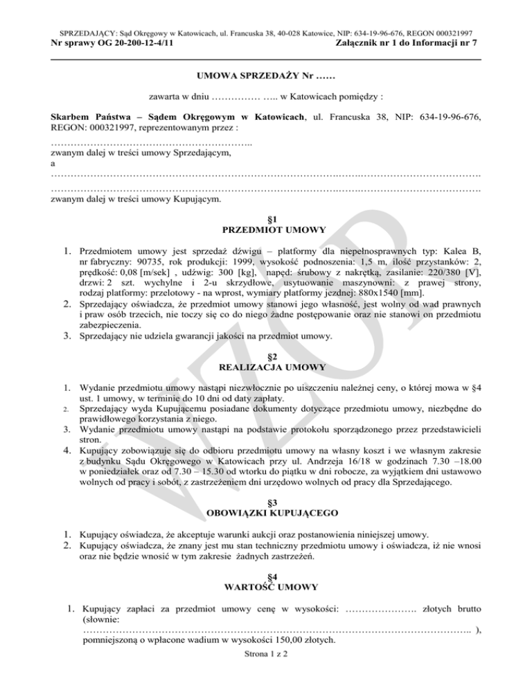 SPRZEDAJĄCY: Sąd Okręgowy w Katowicach, ul. Francuska 38, 40-028 Katowice, NIP: 634-19-96-676, REGON 000321997 Nr sprawy OG 20-200-12-4/11 Załącznik nr 1 do Informacji nr 7 UMOWA SPRZEDAŻY Nr …… zawarta w dniu …………… ….. w Katowicach pomiędzy : Skarbem Państwa – Sądem Okręgowym w Katowicach, ul. Francuska 38, NIP: 634-19-96-676, REGON: 000321997, reprezentowanym przez : …………………………………………………….. zwanym dalej w treści umowy Sprzedającym, a …………………………………………………………………………….…….………………………………. …………………………………………………………………………….…….………………………………. zwanym dalej w treści umowy Kupującym. §1 PRZEDMIOT UMOWY 1. Przedmiotem umowy jest sprzedaż dźwigu – platformy dla niepełnosprawnych typ: Kalea B, nr fabryczny: 90735, rok produkcji: 1999, wysokość podnoszenia: 1,5 m, ilość przystanków: 2, prędkość: 0,08 [m/sek] , udźwig: 300 [kg], napęd: śrubowy z nakrętką, zasilanie: 220/380 [V], drzwi: 2 szt. wychylne i 2-u skrzydłowe, usytuowanie maszynowni: z prawej strony, rodzaj platformy: przelotowy - na wprost, wymiary platformy jezdnej: 880x1540 [mm]. 2. Sprzedający oświadcza, że przedmiot umowy stanowi jego własność, jest wolny od wad prawnych i praw osób trzecich, nie toczy się co do niego żadne postępowanie oraz nie stanowi on przedmiotu zabezpieczenia. 3. Sprzedający nie udziela gwarancji jakości na przedmiot umowy. §2 REALIZACJA UMOWY 1. Wydanie przedmiotu umowy nastąpi niezwłocznie po uiszczeniu należnej ceny, o której mowa w §4 ust. 1 umowy, w terminie do 10 dni od daty zapłaty. 2. Sprzedający wyda Kupującemu posiadane dokumenty dotyczące przedmiotu umowy, niezbędne do prawidłowego korzystania z niego. 3. Wydanie przedmiotu umowy nastąpi na podstawie protokołu sporządzonego przez przedstawicieli stron. 4. Kupujący zobowiązuje się do odbioru przedmiotu umowy na własny koszt i we własnym zakresie z budynku Sądu Okręgowego w Katowicach przy ul. Andrzeja 16/18 w godzinach 7.30 –18.00 w poniedziałek oraz od 7.30 – 15.30 od wtorku do piątku w dni robocze, za wyjątkiem dni ustawowo wolnych od pracy i sobót, z zastrzeżeniem dni urzędowo wolnych od pracy dla Sprzedającego. §3 OBOWIĄZKI KUPUJĄCEGO 1. Kupujący oświadcza, że akceptuje warunki aukcji oraz postanowienia niniejszej umowy. 2. Kupujący oświadcza, że znany jest mu stan techniczny przedmiotu umowy i oświadcza, iż nie wnosi oraz nie będzie wnosić w tym zakresie żadnych zastrzeżeń. §4 WARTOŚĆ UMOWY 1. Kupujący zapłaci za przedmiot umowy cenę w wysokości: …………………. złotych brutto (słownie: ……………………………………………………………………………………………………….. ), pomniejszoną o wpłacone wadium w wysokości 150,00 złotych. Strona 1 z 2 SPRZEDAJĄCY: Sąd Okręgowy w Katowicach, ul. Francuska 38, 40-028 Katowice, NIP: 634-19-96-676, REGON 000321997 Nr sprawy OG 20-200-12-4/11 Załącznik nr 1 do Informacji nr 7 2. Zapłata ceny, o której mowa w ust. 1 powyżej nastąpi na rachunek bankowy Sprzedającego prowadzony przez NBP Oddział Okręgowy Katowice Nr: 13 1010 1212 0012 7022 3100 0000, w terminie do 7 dni od daty zawarcia umowy z dopiskiem „zbędny składnik majątku – aukcja”. 3. Za nieterminowe uregulowanie należności Sprzedający może naliczyć Kupującemu odsetki w ustawowej wysokości. §5 ODSTĄPIENIE OD UMOWY Sprzedającemu przysługuje prawo do odstąpienia od umowy w terminie 14 dni w razie niezapłacenia przez Kupującego ceny nabycia, o której mowa w §4 ust. 1 umowy. W takim przypadku Sprzedający może zatrzymać całość wadium. §6 KARY UMOWNE Kupujący zapłaci Sprzedającemu karę umowną w przypadku nieodebrania przedmiotu umowy w terminie, o którym mowa w §2 pkt 3 umowy w wysokości 30 złotych za każdy rozpoczęty dzień opóźnienia w odbiorze. §7 KLAUZULA DORĘCZENIOWA 1. Wykonawca zobowiązuje się do niezwłocznego pisemnego informowania o wszelkich zmianach dotyczących swojej nazwy, siedziby, sposobu reprezentacji, NIP, REGON, KRS lub Centralnej Ewidencji i Informacji o Działalności Gospodarczej. 2. Wszelkie zawiadomienia i oświadczenia, również faktury VAT, inne dokumenty finansowoksięgowe dotyczące lub związane z niniejsza umową będą dokonywane w formie pisemnej i dostarczone osobiście, pocztą poleconą lub kurierem na adres podany w komparycji umowy. W przypadku nie odebrania przesyłki przez Wykonawcę lub zmiany powyższego adresu i nie wskazania Zamawiającemu nowego adresu do doręczeń, przesyłka wysłana przez Zamawiającego na ostatni znany adres Wykonawcy i zwrócona z przyczyn wymienionych powyżej będzie uznana za skutecznie doręczoną. Strony ustalają, że doręczenie jest dokonane z chwilą upływu terminu do odebrania przesyłki awizowanej, a w przypadku nie dostarczenia przesyłki z uwagi na zmianę adresu, z chwilą zwrotu przesyłki do Zamawiającego. §8 POSTANOWIENIA KOŃCOWE 1. W sprawach nieuregulowanych niniejszą umową mają zastosowanie przepisy ustawy Kodeksu cywilnego. 2. Właściwym do rozpoznawania sporów wynikłych na tle realizacji niniejszej umowy jest Sąd właściwy dla siedziby Sprzedającego. 3. Wszelkie zmiany niniejszej umowy wymagają formy pisemnej pod rygorem nieważności. 4. Podtytuły zastosowane w niniejszej umowie nie wpływają na jej treść i interpretację, mają one jedynie charakter pomocniczy. 5. Umowę sporządzono w dwóch jednobrzmiących egzemplarzach, po jednym dla każdej ze stron. ………………………….. Sprzedający …………………………. Kupujący Strona 2 z 2