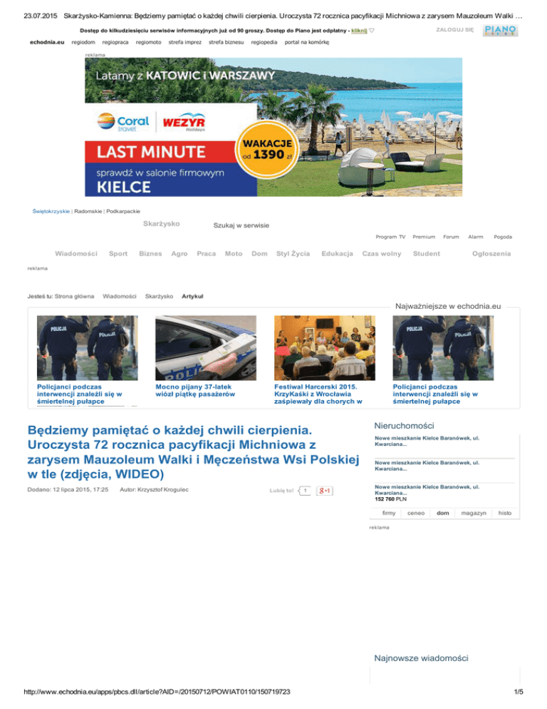23.07.2015 SkarżyskoKamienna: Będziemy pamiętać o każdej chwili cierpienia. Uroczysta 72 rocznica pacyfikacji Michniowa z zarysem Mauzoleum Walki … ZALOGUJ SIĘ Dostęp do kilkudziesięciu serwisów informacyjnych już od 90 groszy. Dostęp do Piano jest odpłatny kliknij echodnia.eu regiodom regiopraca regiomoto strefa imprez strefa biznesu regiopedia portal na komórkę reklama Świętokrzyskie | Radomskie | Podkarpackie Skarżysko Szukaj w serwisie Program TV Wiadomości Sport Biznes Agro Praca Moto Dom Styl Życia Edukacja Czas wolny Premium Forum Alarm Student Pogoda Ogłoszenia reklama Jesteś tu: Strona główna Wiadomości Skarżysko Artykuł Najważniejsze w echodnia.eu Policjanci podczas interwencji znaleźli się w śmiertelnej pułapce Mocno pijany 37latek wiózł piątkę pasażerów Festiwal Harcerski 2015. KrzyKaśki z Wrocławia zaśpiewały dla chorych w Kielcach (WIDEO, zdjęcia) Policjanci podczas interwencji znaleźli się w śmiertelnej pułapce Będziemy pamiętać o każdej chwili cierpienia. Uroczysta 72 rocznica pacyfikacji Michniowa z zarysem Mauzoleum Walki i Męczeństwa Wsi Polskiej w tle (zdjęcia, WIDEO) Nieruchomości Dodano: 12 lipca 2015, 17:25 Nowe mieszkanie Kielce Baranówek, ul. Kwarciana... 152 760 PLN Autor: Krzysztof Krogulec Lubię to! 1 Nowe mieszkanie Kielce Baranówek, ul. Kwarciana... Nowe mieszkanie Kielce Baranówek, ul. Kwarciana... firmy ceneo dom magazyn historia reklama Najnowsze wiadomości http://www.echodnia.eu/apps/pbcs.dll/article?AID=/20150712/POWIAT0110/150719723 1/5 23.07.2015 SkarżyskoKamienna: Będziemy pamiętać o każdej chwili cierpienia. Uroczysta 72 rocznica pacyfikacji Michniowa z zarysem Mauzoleum Walki … 8:00 Wybieramy najlepsze lodziarnie w Świętokrzyskiem! Nie zwlekaj i oddaj 6:00 Festiwal Harcerski 2015. KrzyKaśki z Wrocławia zaśpiewały dla chorych w Kielcach (WIDEO, zdjęcia) 22:00 Policjanci podczas interwencji znaleźli się w śmiertelnej pułapce 21:31 Powstaje unikatowy obiekt w skali Europy! Terma Słowacki zadziwi cudowną leczniczą wodą Strefa Biznesu następne wiadomości Muzeum im. Orła Białego w Skarżysku Kamiennej regiopedia Sprawdź gdzie otrzymasz najtańszy kredyt! Reklama alarm24 Kliknij i wyślij nam swojego newsa! reklama (fot. Aleksander Piekarski) Galeria: Uroczystości w Michniowie Ponad 200 osób – prawie całą wieś Michniów – bestialsko zamordowali Niemcy w dniach 12 i 13 lipca 1943 roku. W 72 rocznicę pacyfikacji tej świętokrzyskiej wioski odbyły się uroczystości przed zbiorową mogiłą. Przeczytaj więcej Najnowsze wideo Uroczyste obchody Święta Pułkowego Czwartaków na kieleckiej Bukówce Festiwal Harcerski 2015. KrzyKaśki z Wrocławia zaśpiewały dla chorych w Kielcach (WIDEO, zdjęcia) W Bodzentynie upamiętnili 39 mieszkańców miasteczka, zamordowanych przez niemieckich okupantów Sprzedano 2223 bilety na wielki mecz Vive Tauron Kielce – Paris Saint Germain. Ustalona godzina meczu – 29 sierpnia, godzina 15.15 [WIDEO] Wojewódzkie święto policji we Włoszczowie. Stróże prawa zapraszają mieszkańców na festyn pełen atrakcji [WIDEO] Artykuły premium Być tam, gdzie źle się dzieje historia o księdzu, który chciał być strażakiem Dyrektora perypetie z językiem, prezydenta z makijażem... Najciekawsze wydarzenia towarzyskie Po raz kolejny przypomniano tragiczne dni lipca przywołując relacje ocalałych świadków masowego mordu na ludności cywilnej. Będziemy Wielka akcja Kibicujemy Koronie Kielce. Zbierz fotosy, odbierz bilety na mecze! Zaprasza Kamil Sylwestrzak (WIDEO) pamiętać o każdej chwili cierpienia... mówił marszałek województwa świętokrzyskiego Adam Jarubas. Obecni byli parlamentarzyści, władze regionu. Po występach chóru "Senior z Suchedniowa” i złożenia na mogile w asyście pocztów sztandarowych wieńców i wiązanek kwiatów rozpoczęła się msza polowa.. Za zbiorową mogiłą pomordowanych widać już zarysy ogólnopolskiego Mauzoleum Walki i Męczeństwa Wsi Polskiej w czasie II wojny światowej, którego idea zrodziła się w 1979 roku, a całość ma być gotowa za dwa lata, w roiku 2017. Betonowe obiekty mauzoleum, które mają przypominać o tragicznych wydarzeniach z 1943 roku, są już gotowe w stanie surowym. Kształtem przypominają one chatę, której Policjanci podczas interwencji znaleźli się w śmiertelnej pułapce Najpopularniejsze Dzisiaj Tydzień Premium Wideo kolejne segmenty przechodzą od "normalności" do coraz bardziej zdeformowanych fragmentów, przy czym istotna jest gra świateł i cienia w tej niezwykłej konstrukcji. Choć wykonana z betonu, to z bliska widać na nim charakterystyczne słoje drewna. Wykonano je specjalnymi matrycami, odciskanymi w betonowych ścianach. Pierwsza część obiektu będzie pełnić funkcję kaplicy, dlatego na jednej z betonowych ścian pojawił się krzyż. Z nożem po pieniądze. 22latek tymczasowo aresztowany Muzeum Wsi Kieleckiej oraz Stowarzyszenie Pokolenie organizują wspólnie zbiórkę pamiątek dotyczących wsi i jej mieszkańców z okresu II wojny światowej. Trafią one jako eksponaty do wspomnianego Muzeum Martyrologii Wsi Polskich. Białorusin po alkoholu prowadził tira http://www.echodnia.eu/apps/pbcs.dll/article?AID=/20150712/POWIAT0110/150719723 Poznajmy się. Leszek Steć, dowódca XIII Świętokrzyskiego Korpusu Polskich Drużyn Strzeleckich Citroen w ogniu. Auto spłonęło niemal doszczętnie W Wojtyniowie jest nowy plac zabaw 2/5 23.07.2015 SkarżyskoKamienna: Będziemy pamiętać o każdej chwili cierpienia. Uroczysta 72 rocznica pacyfikacji Michniowa z zarysem Mauzoleum Walki … Organizatorom zbiórki zależy na dotarciu do dokumentów po ofiarach represji, świadectwach pacyfikacji skierowanej do mieszkańców polskich wsi, również z terenów tzw. Kresów Wschodnich, jak również na dokumentach świadczących o oporze wobec obu okupantów lekcjach tajnego nauczania, sabotażu, partyzantce. Zebrane pamiątki traf