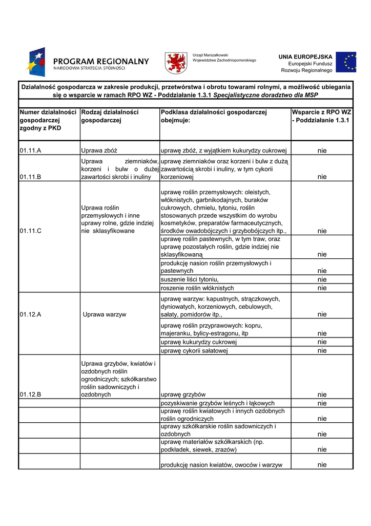 Urząd Marszałkowski Województwa Zachodniopomorskiego UNIA EUROPEJSKA Europejski Fundusz Rozwoju Regionalnego Działalność gospodarcza w zakresie produkcji, przetwórstwa i obrotu towarami rolnymi, a moŜliwość ubiegania się o wsparcie w ramach RPO WZ - Poddziałanie 1.3.1 Specjalistyczne doradztwo dla MSP Numer działalności Rodzaj działalności gospodarczej gospodarczej zgodny z PKD Podklasa działalności gospodarczej obejmuje: 01.11.A Uprawa zbóŜ uprawę zbóŜ, z wyjątkiem kukurydzy cukrowej nie 01.11.B Uprawa ziemniaków, uprawę ziemniaków oraz korzeni i bulw z duŜą korzeni i bulw o duŜej zawartością skrobi i inuliny, w tym cykorii zawartości skrobi i inuliny korzeniowej nie 01.11.C 01.12.A 01.12.B Uprawa roślin przemysłowych i inne uprawy rolne, gdzie indziej nie sklasyfikowane Uprawa warzyw uprawę roślin przemysłowych: oleistych, włóknistych, garbnikodajnych, buraków cukrowych, chmielu, tytoniu, roślin stosowanych przede wszystkim do wyrobu kosmetyków, preparatów farmaceutycznych, środków owadobójczych i grzybobójczych itp., uprawę roślin pastewnych, w tym traw, oraz uprawę pozostałych roślin, gdzie indziej nie sklasyfikowaną produkcję nasion roślin przemysłowych i pastewnych suszenie liści tytoniu, roszenie roślin włóknistych Wsparcie z RPO WZ - Poddziałanie 1.3.1 nie nie nie nie nie uprawę warzyw: kapustnych, strączkowych, dyniowatych, korzeniowych, cebulowych, sałaty, pomidorów itp., nie uprawę roślin przyprawowych: kopru, majeranku, bylicy-estragonu, itp uprawę kukurydzy cukrowej uprawę cykorii sałatowej nie nie nie Uprawa grzybów, kwiatów i ozdobnych roślin ogrodniczych; szkółkarstwo roślin sadowniczych i ozdobnych uprawę grzybów pozyskiwanie grzybów leśnych i łąkowych uprawę roślin kwiatowych i innych ozdobnych roślin ogrodniczych uprawy szkółkarskie roślin sadowniczych i ozdobnych uprawę materiałów szkółkarskich (np. podkładek, siewek, zrazów) produkcję nasion kwiatów, owoców i warzyw nie nie nie nie nie nie Numer działalności Rodzaj działalności gospodarczej gospodarczej zgodny z PKD 01.13.Z 01.21.Z 01.22.Z Produkcja owoców, orzechów oraz uprawa roślin wykorzystywanych do produkcję owoców: jabłek, gruszek, śliwek, produkcji napojów i wiśni, czereśni, moreli, brzoskwiń, porzeczek, przypraw agrestu, truskawek itp. produkcję winogron na wino i do bezpośredniego spoŜycia produkcję orzechów jadalnych Chów i hodowla bydła 01.23.Z 01.24.Z Chów i hodowla drobiu 01.25.Z Chów i hodowla zwierząt pozostałych Wsparcie z RPO WZ - Poddziałanie 1.3.1 nie nie nie uprawę roślin przyprawowych: anyŜku, bazylii, kolendry, kminku, gorczycy, goździków itp., nie uprawę roślin słuŜących do produkcji napojów (uprawy strefy międzyzwrotnikowej: kawy, herbaty, kakao), zbieranie jagód i orzechów leśnych produkcję surowego mleka krowiego produkcję Ŝywca wołowego hodowlę bydła zarodowego nie nie nie nie nie Chów i hodowla owiec, kóz, koni, osłów, mułów chów i hodowlę koni, osłów, mułów chów i hodowlę owiec i kóz produkcję surowej wełny Chów i hodowla trzody chlewnej 01.30.Z Podklasa działalności gospodarczej obejmuje: nie nie nie produkcję surowego mleka koziego i owczego nie chów i hodowlę loch i knurów, produkcję tuczników przeznaczonych na rzeź chów i hodowlę drobiu: kur, perliczek, indyków, kaczek, gęsi, strusi produkcję jaj ptasich chów i hodowlę pszczół; produkcję miodu oraz wosku pszczelego chów i hodowlę jedwabników; produkcję kokonów jedwabników chów i hodowlę królików chów i hodowlę gołębi chów i hodowlę zwierząt domowych chów i hodowlę Ŝab chów i hodowlę zwierząt futerkowych; produkcję skór zwierząt futerkowych nie nie chów i hodowlę dŜdŜownic, mięczaków i innych zwierząt, gdzie indziej nie sklasyfikowanych uprawy rolne połączone z chowem zwierząt w Uprawy rolne połączone z jednostkach prowadzących działalność chowem zwierząt mieszaną, w których stopień specjalizacji nie (działalność mieszana) przekracza 66% w jednej dziedzinie nie nie nie nie nie nie nie nie nie nie nie Numer działalności Rodzaj działalności gospodarczej gospodarczej zgodny z PKD 01.41.A Działalność usługowa związana z uprawami rolnymi - prowadzoną na zlecenie działalność usługową związaną z uprawami rolnymi, warzywnictwem i ogrodnictwem Podklasa działalności gospodarczej obejmuje: przygotowanie pól, ogrodów i sadów do uprawy zagospodarowanie trwałych rolniczo naturalnych uŜytków zielonych - łąk i pastwisk siew, sadzenie i prace pielęgnacyjne nawoŜenie i zraszanie oraz ochronę upraw przed szkodnikami i chorobami, w tym równieŜ usługi agrolotnicze sprzęt zbóŜ i innych upraw; zbiór warzyw i owoców przycinanie gałęzi drzew i krzewów owocowych przygotowanie zbiorów do sprzedaŜy przez: oczyszczanie, obcinanie, sortowanie, suszenie, wyłuskiwanie itp uruchamianie i obsługę systemów irygacyjnych dla celów rolniczych wynajem maszyn i urządzeń rolniczych z obsługą 01.41.B 01.42.Z Działalność usługowa związana z zagospodarowaniem terenów zieleni obejmująca prowadzoną na zlecenie działalność związaną z utrzymaniem ogrodów, parków, cmentarzy, sadzenie, uprawę i utrzymanie roślin (prace obiektów sportowych pielęgnacyjne) przycinanie Ŝywopłotów i gałęzi drzew Działalność usługowa krycie naturalne, sztuczne unasiennianie i związana z chowem i ocenę wartości uŜytkowej i hodowlanej hodowlą zwierząt zwierząt sterylizację i trzebienie zwierząt czyszczenie i sortowanie jaj, zdejmowanie skór zwierząt hodowlanych (zwierząt futerkowych, ptaków, gadów) prowadzenie schronisk dla zwierząt (przechowywanie zwierząt nie związane z opieką weterynaryjną), usługi pasterskie i strzyŜenie owiec usługi sanitarne w pomieszczeniach inwentarskich Wsparcie z RPO WZ - Poddziałanie 1.3.1 nie nie nie nie nie nie nie nie nie tak tak nie nie nie nie ta