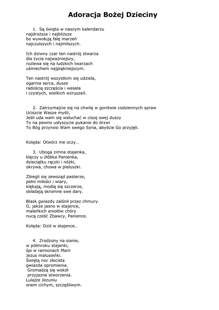 Adoracja Bożej Dzieciny 1. Są święta w naszym kalendarzu najdroższe i najbliższe bo wywołują falę marzeń najczulszych i najmilszych. Ich dziwny czar ten nastrój stwarza dla życia najważniejszy, rozlewa się na ludzkich twarzach uśmiechem najpiękniejszym. Ten nastrój wszystkim się udziela, ogarnia serca, dusze radością szczęścia i wesela i czystych, wielkich wzruszeń. 2. Zatrzymajcie się na chwilę w gonitwie codziennych spraw Uciszcie Wasze myśli, Jeśli uda wam się wsłuchać w ciszę swej duszy To na pewno usłyszycie pukanie do drzwi To Bóg przynosi Wam swego Syna, abyście Go przyjęli. Kolęda: Otwórz me oczy… 3. Uboga zimna stajenka, klęczy u żłóbka Panienka, dzieciątku rączki i nóżki, okrywa, chowa w pieluszki. Zbiegli się zewsząd pasterze, pełni miłości i wiary, klękają, modlą się szczerze, składają skromne swe dary. Blask gwiazdy zalśnił przez chmury. O, jakże jasno w stajence, maleńkich aniołów chóry nucą cześć Zbawcy, Panience. Kolęda: Dziś w stajence… 4. Zrodzony na sianie, w półmroku stajenki, śpi w ramionach Marii Jezus malusieńki. Świętą noc złocista gwiazda opromienia. Gromadzą się wokół przyjazne stworzenia. Lulajże Jezuniu snem cichym, szczęśliwym. Obdarz nas radością i szczęściem prawdziwym. Kolęda: I trzej królowie… 5. Nowa gwiazda błysnęła na niebie, nowym blaskiem jaśnieje już wschód… Mędrcy z trwoga spojrzeli na siebie: „Co oznacza kosmiczny ten cud?” Poszperali w swoich księgach starych, popatrzyli w niebo pełne gwiazd, i ruszyli w drogę pełną wiary, szukać Króla wśród dalekich miast. Nie znaleźli trzej mędrcy Dziecięcia w Jeruzalem, gdzie królewski tron do Betlejem gwiazda przyświeca, i w ubogi prowadzi ich dom. Niezrażeni ubogą prostotą, mędrcy kornie wchodzą w niski próg, dary swe: kadzidło, mirrę złoto, do Chłopięcia kładą bosych stóp. Kornie padli przed Nim na kolana, głowy chylą do Dziecięcia nóg: To Twe przyjście gwiazda zwiastowała, Tyś czekany z dawna Mesjasz – Bóg! Kolęda: Lulajże Jezuniu 6. Teraz już cichnę, by było słyszeć tylko modlitwy i Boga, który oddycha w tym, kto się modli. (chwila ciszy) zamykam oczy i myślę: jak dobrze, Panie, że tu jesteśmy. Wiesz Jezu, chcę się pomodlić – tak po swojemu porozmawiać z Tobą. Co ja Ci powiem, co dam? (chwila ciszy) Oddaję Ci te krótką chwilę, by po prostu być przed Tobą. Popatrz na mnie, ja też patrzę na ciebie. Przyjmij moje jasne, spokojne spojrzenie. Z głębi moich oczu wyczytasz: proste- dziękuję, szczere- przepraszam i ufne – proszę. 7. Panie Jezu, narodziłeś się w stajni, bo nie było miejsc dla Ciebie w gospodzie. My przyszliśmy, aby podziękować Ci za Twe narodzenie. Przyszliśmy z Pasterzami, aby powiedzieć Ci, jak bardzo Cię kochamy. Przyszliśmy z Aniołami, aby ucieszyć Cię naszym kolędowaniem. Niech nasze gorące serca Cię ogrzewają. Niech nasze śpiewy Cię radują. Prosimy Cię, Boże Dziecię, zostań z nami w kościele, w domu, w szkole i błogosław nam. Kolęda: Bóg się rodzi… Opr. Małgorzata Kasperowicz