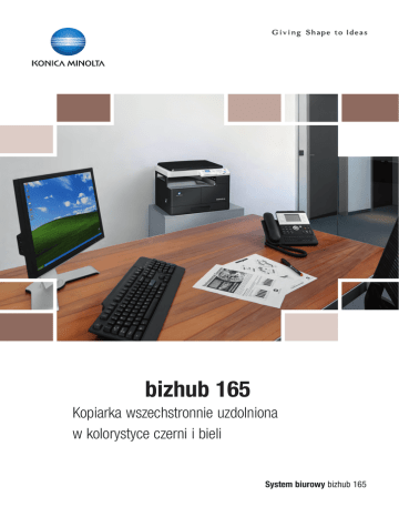 bizhub 165 Kopiarka wszechstronnie uzdolniona w kolorystyce czerni i bieli System biurowy bizhub 165 bizhub 165, system biurowy Więcej niż kopiarka Solidne urządzenie bizhub 165 sprawdza się w roli prostej w obsłudze kopiarki monochromatycznej podczas wykonywania rutynowych zadań kopiowania materiałów o formacie do A3 włącznie. Ale jest także czymś więcej! Wyjątkowa elastyczność działania, którą zapewniają standardowe funkcje drukowania i skanowania sprawia, że ta kopiarka to idealne urządzenie stworzone do pracy w warsztatach, magazynach, branży rolniczej i małych firmach, gdzie doceniona zostanie jej atrakcyjna cena. Prosta i bezproblemowa kopiarka stron na jednej, sortowanie, usuwanie oraz rozdzielanie książki). nWyświetlacz n statusu z diodami LED oraz wskaźnik Elastyczne urządzenie bizhub 165 sprawnie wykonuje usunięcia błędu — te funkcje nawet bez podchodzenia wszystkie typowe zadania kopiowania z prędkością 16 kopii do urządzenia dostarczają czytelną informację na temat na minutę. Drukuje pierwszą stronę już po 8 sekundach, statusu urządzenia, podczas gdy diody LED rozjaśniają obsługuje nawet oryginały w formacie A3 i kopiuje na arkusze o tym rozmiarze, co jest bardzo przydatne przy powielaniu schematów, czasopism i treści książek. nPrzejrzysty panel sterowania ułatwia korzystanie z urządzenia wyświetlacz. nDoskonała jakość kopii jest uzyskiwana dzięki niezawodnemu tonerowi firmy Konica Minolta, który wiernie odwzorowuje nawet najmniejsze litery. Toner bizhub 165. Łatwa obsługa i logiczne wskazówki dla okazuje się odporny na rozmazywanie również użytkownika pozwalają drukować proste kopie, ograniczając wtedy, gdy dokument jest wilgotny, co ma znaczenie przy tym czas, który należy poświęcić na konfigurację w typowym środowisku pracy w biurze. Ponadto toner i ustawienia. Urządzenie jest gotowe do pracy dosłownie znakomicie wytrzymuje nawet zginanie kopii, znacznie po rozpakowaniu i uruchomieniu, praktycznie bez zwiększając trwałość dokumentów. Kasetę z tonerem konieczności uczenia się jego obsługi, dlatego okazjonalni urządzenia bizhub 165 wymienia się łatwo i szybko. użytkownicy od razu uzyskują pożądane efekty. Wygodną funkcją dodatkową urządzenia jest powielanie dokumentów tożsamości, za pomocą której można np. skopiować na jeden arkusz obydwie strony dowodu osobistego, prawa jazdy lub podobnego dokumentu. nPanel sterujący został wyposażony w programowalny klawisz skrótu, który można z łatwością przypisać do jednej z często używanych funkcji kopiowania (łączenie oryginałów z dwóch Konfiguracje Elastyczność drukowania i skanowania Oszczędności finansowe i ochrona n Urządzenie środowiska bizhub 165 jest nie tylko kopiarką — z jego pomocą można skanować i drukować dokumenty nawet w formacie A3. Dzięki tym funkcjom można z niego korzystać n Urządzenie bizhub 165, wyposażone w liczne funkcje podczas realizacji różnorodnych zadań m.in. drukowania oszczędzające energię, jest idealnym rozwiązaniem dla ofert handlowych, faktur i cenników, skanowania broszur wszystkich, którzy chcą zmniejszyć koszty działalności. oraz dokumentacji technicznej. Takie funkcje, jak drukowanie dwóch lub czterech stron n Elastyczna obsługa papieru w szerokim zakresie gramatur na jednym arkuszu i kopiowanie dokumentów tożsamości pozwala na stosowanie wielu rodzajów nośników do zmniejszają zużycie papieru i tonera dzięki umieszczeniu drukowania oznaczeń, na przykład papieru makulaturowego kilku stron oryginału na jednym arkuszu papieru. albo papieru o dużej gramaturze. Tryby wstrzymania i uśpienia w jeszcze większym n Skanowanie w trybie TWAIN umożliwia prostą stopniu ograniczają pobór energii, przy jednoczesnym i bezproblemową archiwizację dokumentów. To funkcja zapewnieniu szybkiej gotowości kopiarki do pracy i bardzo przydatna zwłaszcza dla małych biur. Dzięki niej krótkiego czasu nagrzewania. Poza zmniejszeniem można uniknąć gromadzenia stosów papieru. Wszystkie kosztów eksploatacji przyczynia się to również do ważne dokumenty — umowy czy faktury — można natychmiast skanować i archiwizować, a później, w razie potrzeby, łatwo wyszukać i wydrukować ponownie. ochrony środowiska naturalnego. n Urządzenie bizhub 165 cechuje się trwałością podzespołów i wysoką jakością wykonania. Wydłużony czas eksploatacji tonera firmy Konica Minolta Simitri® HD oznacza, że kasetę z tonerem można wymieniać o wiele rzadziej. Jednocześnie niższa temperatura procesu utrwalania wpływa na zmniejszenie poboru energii a tym samym na ograniczenie kosztów eksploatacji. n Niski pobór energii jest rzeczywistą zaletą urządzenia bizhub 165 i został potwierdzony oznaczeniem Energy Star dla urządzeń szczególnie oszczędzających energię. W swoim segmencie rynkowym urządzenie bizhub 165 zajmuje czołowe miejsce i imponuje swoimi energooszczędnymi parametrami. Główne cechy Główne zalety Kopiarka o dużych Elastyczne funkcje kopiowania, możliwościach skanowania i drukowania nawet w formacie A3 z dodatkowymi funkcjami Prosta obsługa Urządzenie gotowe do użycia natychmiast po rozpakowaniu – bez żmudnej nauki Niski pobór energii Rozwiązanie ekologiczne i ekonomiczne w działaniu Kompaktowy rozmiar Niewiele potrzebnego miejsca i niewielka masa — możliwość ustawienia nawet w najmniejszym narożniku Parametry techniczne Parametry techniczne kopiarki Proces kopiowania Laser elektrofotograficzny System tonera Toner polimeryzowany Simitri HD Szybkość kopiowania/drukowania w formacie A4 Do 16 stron na minutę Szybkość kopiowania/drukowania w formacie A3 Do 9,1 strony na minutę Czas wydrukowania pierwszej kopii Do 8 sekund Czas nagrzewania Do 29 sekund Rozdzielczość kopiowania 600 x 600 dpi Stopniowanie 256 poziomów Procesor kontrolera 120 MHz Język opisu strony GDI, XPS Systemy operacyjne Window