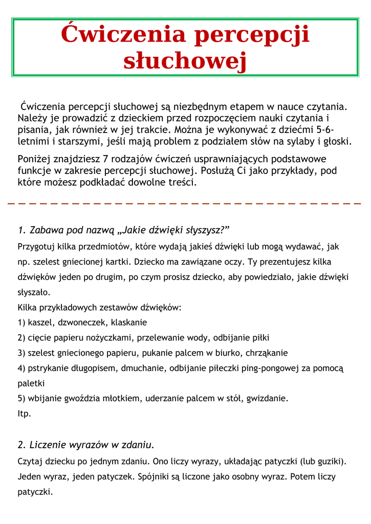 Ćwiczenia percepcji słuchowej Ćwiczenia percepcji słuchowej są niezbędnym etapem w nauce czytania. Należy je prowadzić z dzieckiem przed rozpoczęciem nauki czytania i pisania, jak również w jej trakcie. Można je wykonywać z dziećmi 5-6letnimi i starszymi, jeśli mają problem z podziałem słów na sylaby i głoski. Poniżej znajdziesz 7 rodzajów ćwiczeń usprawniających podstawowe funkcje w zakresie percepcji słuchowej. Posłużą Ci jako przykłady, pod które możesz podkładać dowolne treści. 1. Zabawa pod nazwą „Jakie dźwięki słyszysz?” Przygotuj kilka przedmiotów, które wydają jakieś dźwięki lub mogą wydawać, jak np. szelest gniecionej kartki. Dziecko ma zawiązane oczy. Ty prezentujesz kilka dźwięków jeden po drugim, po czym prosisz dziecko, aby powiedziało, jakie dźwięki słyszało. Kilka przykładowych zestawów dźwięków: 1) kaszel, dzwoneczek, klaskanie 2) cięcie papieru nożyczkami, przelewanie wody, odbijanie piłki 3) szelest gniecionego papieru, pukanie palcem w biurko, chrząkanie 4) pstrykanie długopisem, dmuchanie, odbijanie piłeczki ping-pongowej za pomocą paletki 5) wbijanie gwoździa młotkiem, uderzanie palcem w stół, gwizdanie. Itp. 2. Liczenie wyrazów w zdaniu. Czytaj dziecku po jednym zdaniu. Ono liczy wyrazy, układając patyczki (lub guziki). Jeden wyraz, jeden patyczek. Spójniki są liczone jako osobny wyraz. Potem liczy patyczki. - Jaś otworzył książkę. - Musiała wyjść z domu. - Potem podaje głośno trzy wyrazy. - To może być fajna zabawa. - Martynka skończyła czytać kolejną książkę. 3. Tworzenie zbiorów wyrazów Potrzebne będą 3 pudełka z naklejonymi obrazkami, które znajdują się poniżej. A także: guziki albo karteczki w dwóch kolorach (jeden kolor dla Ciebie, a jeden dla dziecka). Pierwszy obrazek symbolizuje „ŚRODKI TRANSPORTU”, czyli co nam służy do przemieszczania się ( w grę wchodzą również zwierzęta, narty, deskorolka itp.) Drugi obrazek – oznacza wszystko do jedzenia, a trzeci – wszystko z drewna. Raz odpowiada dziecko, raz Ty. Za każdą poprawną odpowiedź dostajecie karteczkę w swoim kolorze, którą wrzucacie do właściwego pudełka. Na koniec następuje zliczenie karteczek. 4. Naprzemienne opowiadanie Ty zaczynasz mówiąc pierwsze zdanie. Drugie zdanie mówi dziecko. I tak na przemian. Najlepiej wykorzystać znaną dziecku bajkę. Oczywiście opowiadanie może pójść w dowolnym kierunku. Nie musi być odzwierciedleniem treści oryginału. 5. Liczenie sylab w wyrazach. Wytnij poniższe paski z kratkami. Po kolei wymawiaj wyraźnie podane niżej wyrazy. Zadaniem dziecka jest podzielić je na sylaby. Jeśli nie rozumie, na czym takie dzielenie polega, powiedz mu, aby spróbowało zawołać dane słowo. Jeśli dziecko umie już podzielić słowo na sylaby, niech wskaże palcem, który pokratkowany pasek pasuje do danego słowa. Np. do słowa „lokomotywa” będzie pasował pasek nr 1, ponieważ ten wyraz składa się z 5 sylab. Oto wyrazy do ćwiczenia: pije, bajka, lubi, Calineczka, Jaś, motyle, pomidory, słodycze, marzenia, zabawki, ptyś, słowa, kolorowa, rysunek. 1 2 3 4 5 6. Liczenie głosek w wyrazach. Podobnie jak w poprzednim ćwiczeniu, dziecko liczy – tym razem głoski – i wskazuje odpowiedni pasek. Jeśli zna litery, może je nakładać na kratki wypowiadając jednocześnie głoski składające się na wyraz. Polecenie dla dziecka może brzmieć następująco: Wyraz „bal” można podzielić na pojedyncze głoski: b-a-l. Spróbuj sam to zrobić z wyrazem „mak”. Teraz poszukaj paska z taką ilością kratek, jak liczba liter w wyrazie „mak”. A teraz nałóż litery na kratki i jednocześnie głośno wymawiaj te litery. Oto wyrazy do ćwiczenia: mak, sok, wozy, pies, koty, cebula, kto, tulipan, kotek, mowa, worek Oto litery użyte w w/w wyrazach. A B C E I K L M O P S T U W Y Z N G 7. Rymowanki. Do podanego z lewej strony słowa dziecko dobiera słuchowo to, które się z im rymuje. Czytasz dziecku słowo zapisane po lewej stronie, a potem czytasz dwa zapisane po prawej i pytasz, które się z nim rymuje. kot płot czy smok sok krok czy woda fala kawa czy sala ryby grzyby czy mydło tran kran czy kram noce kluski czy koce mowa głowa czy mewa motyle żaby czy chwile chata baty czy łata kurtka furtka czy brama pije wije czy pyta wół muł czy bat kto ktoś czy motto bródka młoda czy krótka sos głos czy para mech złoty czy pech