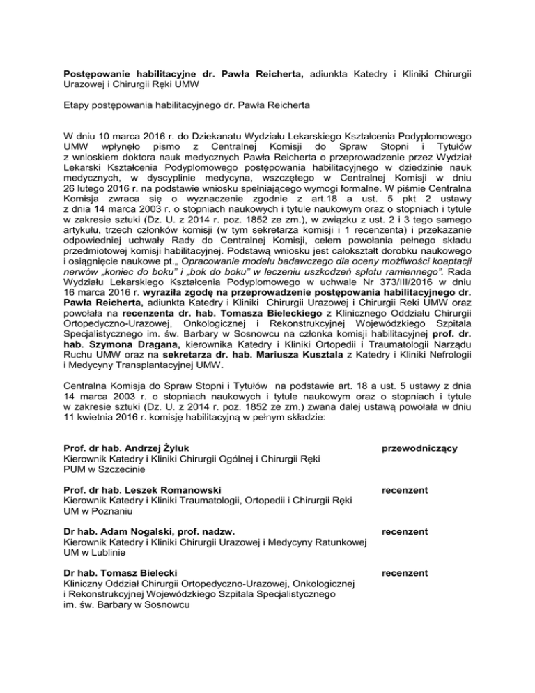 Postępowanie habilitacyjne dr. Pawła Reicherta, adiunkta Katedry i Kliniki Chirurgii Urazowej i Chirurgii Ręki UMW Etapy postępowania habilitacyjnego dr. Pawła Reicherta W dniu 10 marca 2016 r. do Dziekanatu Wydziału Lekarskiego Kształcenia Podyplomowego UMW wpłynęło pismo z Centralnej Komisji do Spraw Stopni i Tytułów z wnioskiem doktora nauk medycznych Pawła Reicherta o przeprowadzenie przez Wydział Lekarski Kształcenia Podyplomowego postępowania habilitacyjnego w dziedzinie nauk medycznych, w dyscyplinie medycyna, wszczętego w Centralnej Komisji w dniu 26 lutego 2016 r. na podstawie wniosku spełniającego wymogi formalne. W piśmie Centralna Komisja zwraca się o wyznaczenie zgodnie z art.18 a ust. 5 pkt 2 ustawy z dnia 14 marca 2003 r. o stopniach naukowych i tytule naukowym oraz o stopniach i tytule w zakresie sztuki (Dz. U. z 2014 r. poz. 1852 ze zm.), w związku z ust. 2 i 3 tego samego artykułu, trzech członków komisji (w tym sekretarza komisji i 1 recenzenta) i przekazanie odpowiedniej uchwały Rady do Centralnej Komisji, celem powołania pełnego składu przedmiotowej komisji habilitacyjnej. Podstawą wniosku jest całokształt dorobku naukowego i osiągnięcie naukowe pt.„ Opracowanie modelu badawczego dla oceny możliwości koaptacji nerwów „koniec do boku” i „bok do boku” w leczeniu uszkodzeń splotu ramiennego”. Rada Wydziału Lekarskiego Kształcenia Podyplomowego w uchwale Nr 373/III/2016 w dniu 16 marca 2016 r. wyraziła zgodę na przeprowadzenie postępowania habilitacyjnego dr. Pawła Reicherta, adiunkta Katedry i Kliniki Chirurgii Urazowej i Chirurgii Reki UMW oraz powołała na recenzenta dr. hab. Tomasza Bieleckiego z Klinicznego Oddziału Chirurgii Ortopedyczno-Urazowej, Onkologicznej i Rekonstrukcyjnej Wojewódzkiego Szpitala Specjalistycznego im. św. Barbary w Sosnowcu na członka komisji habilitacyjnej prof. dr. hab. Szymona Dragana, kierownika Katedry i Kliniki Ortopedii i Traumatologii Narządu Ruchu UMW oraz na sekretarza dr. hab. Mariusza Kusztala z Katedry i Kliniki Nefrologii i Medycyny Transplantacyjnej UMW. Centralna Komisja do Spraw Stopni i Tytułów na podstawie art. 18 a ust. 5 ustawy z dnia 14 marca 2003 r. o stopniach naukowych i tytule naukowym oraz o stopniach i tytule w zakresie sztuki (Dz. U. z 2014 r. poz. 1852 ze zm.) zwana dalej ustawą powołała w dniu 11 kwietnia 2016 r. komisję habilitacyjną w pełnym składzie: Prof. dr hab. Andrzej Żyluk Kierownik Katedry i Kliniki Chirurgii Ogólnej i Chirurgii Ręki PUM w Szczecinie przewodniczący Prof. dr hab. Leszek Romanowski Kierownik Katedry i Kliniki Traumatologii, Ortopedii i Chirurgii Ręki UM w Poznaniu recenzent Dr hab. Adam Nogalski, prof. nadzw. Kierownik Katedry i Kliniki Chirurgii Urazowej i Medycyny Ratunkowej UM w Lublinie recenzent Dr hab. Tomasz Bielecki Kliniczny Oddział Chirurgii Ortopedyczno-Urazowej, Onkologicznej i Rekonstrukcyjnej Wojewódzkiego Szpitala Specjalistycznego im. św. Barbary w Sosnowcu recenzent Prof. dr hab. Szymon Dragan Kierownik Katedry i Kliniki Ortopedii i Traumatologii Narządu Ruchu UMW członek komisji Dr hab. Marcin Domżalski Kierownik Katedry i Kliniki Ortopedii, Traumatologii i Rehabilitacji Pourazowej Uniwersyteckiego Szpitala Klinicznego im. Wojskowej Akademii Medycznej Centralnego Szpitala Weteranów w Łodzi członek komisji Dr hab. Mariusz Kusztal Katedra i Klinika Nefrologii i Medycyny Transplantacyjnej UMW sekretarz Zgodnie z Ustawą o Stopniach Naukowych i Tytule Naukowym z dnia 14 marca 2003 r. o stopniach naukowych i tytule naukowym oraz o stopniach i tytule w zakresie sztuki (Dz. U. z 2014 r. poz. 1852 ze zm.) harmonogram przebiegu przewodu habilitacyjnego dr. Pawła Reicherta jest następujący: Sporządzenie recenzji dorobku naukowego oraz osiągnięć naukowych będących podstawą wniosku o nadanie stopnia naukowego doktora habilitowanego : do 6 tygodni Sporządzenie przez komisję habilitacyjną wniosku do RW w sprawie nadania stopnia doktora habilitowanego: do 21 dni Podjęcie przez RW uchwały w sprawie nadania lub odmowy stopnia naukowego doktora habilitowanego do 1 miesiąca Uchwała staje się prawomocna z chwilą jej podjęcia.