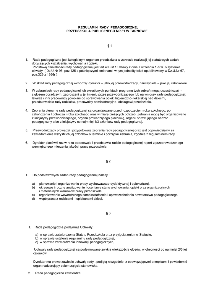 REGULAMIN RADY PEDAGOGICZNEJ PRZEDSZKOLA PUBLICZNEGO NR 31 W TARNOWIE §1 1. Rada pedagogiczna jest kolegialnym organem przedszkola w zakresie realizacji jej statutowych zadań dotyczących kształcenia, wychowania i opieki. Podstawą działalności rady pedagogicznej jest art.40 ust.1 Ustawy z dnia 7 września 1991r. o systemie oświaty ( Dz.U.Nr 95, poz.425 z późniejszymi zmianami, w tym jednolity tekst opublikowany w Dz.U.Nr 67, poz.329 z 1996r ) 2. W skład rady pedagogicznej wchodzą: dyrektor – jako jej przewodniczący, nauczyciele – jako jej członkowie. 3. W zebraniach rady pedagogicznej lub określonych punktach programu tych zebrań mogą uczestniczyć z głosem doradczym, zaproszeni w jej imieniu przez przewodniczącego lub na wniosek rady pedagogicznej: lekarze i inni pracownicy powołani do sprawowania opieki higieniczno- lekarskiej nad dziećmi, przedstawiciele rady rodziców, pracownicy administracyjno- obsługowi przedszkola. 4. Zebrania plenarne rady pedagogicznej są organizowane przed rozpoczęciem roku szkolnego, po zakończeniu I półrocza i roku szkolnego oraz w miarę bieżących potrzeb. Zebrania mogą być organizowane z inicjatywy przewodniczącego, organu prowadzącego placówkę, organu sprawującego nadzór pedagogiczny albo z inicjatywy co najmniej 1/3 członków rady pedagogicznej. 5. Przewodniczący prowadzi i przygotowuje zebrania rady pedagogicznej oraz jest odpowiedzialny za zawiadomienie wszystkich jej członków o terminie i porządku zebrania, zgodnie z regulaminem rady. 6. Dyrektor placówki raz w roku opracowuje i przedstawia radzie pedagogicznej raport z przeprowadzonego wewnętrznego mierzenia jakości pracy przedszkola. §2 1. Do podstawowych zadań rady pedagogicznej należy : a) b) c) d) planowanie i organizowanie pracy wychowawczo-dydaktycznej i opiekuńczej, okresowe i roczne analizowanie i ocenianie stanu wychowania, opieki oraz organizacyjnych i materialnych warunków pracy przedszkola, organizowanie wewnętrznego samokształcenia i upowszechniania nowatorstwa pedagogicznego, współpraca z rodzicami i opiekunami dzieci. §3 1. Rada pedagogiczna podejmuje Uchwały: a) w sprawie zatwierdzenia Statutu Przedszkola oraz przyjęcia zmian w Statucie, b) w sprawie ustalenia regulaminu rady pedagogicznej, c) w sprawie zatwierdzenia innowacji pedagogicznych, Uchwały rady pedagogicznej są podejmowane zwykłą większością głosów, w obecności co najmniej 2/3 jej członków. Dyrektor ma prawo zawiesić uchwałę rady , podjętą niezgodnie z obowiązującymi przepisami i powiadomić organ nadzorujący celem zajęcia stanowiska. 2. Rada pedagogiczna zatwierdza: a) b) c) d) e) 3. roczny plan pracy wychowawczo- dydaktycznej i opiekuńczej, wnioski doraźnych komisji powołanych przez radę, wnioski dyrektora dotyczące kryteriów oceny wyników pracy dla ustalenia wysokości elementów wynagrodzenia, założenia organizacyjne wewnętrznego samokształcenia, regulaminy o charakterze wewnętrznym. Rada pedagogiczna opiniuje: a) b) c) d) e) f) 3. organizację pracy placówki, w tym tygodniowy rozkład zajęć, projekt planu finansowego placówki, wnioski dyrektora o przyznanie nauczycielom odznaczeń, nagród innych wyróżnień, wnioski nauczycieli o podjęcie pracy w godzinach ponad wymiarowych, w wymiarze większym niż ½ obowiązującego wymiaru zajęć, propozycje dyrektora w sprawach przydziału nauczycielom stałych prac i zajęć w ramach wynagrodzenia zasadniczego, kandydatów do powierzenia im funkcji kierowniczych w placówce. Rada ma prawo: a) b) występowania z wnioskami w sprawach doskonalenia organizacji wychowania oraz w sprawach oceny pracy nauczyciela, eliminowania z programu wychowania zbędnej wiedzy oraz haseł programowych o charakterze uzupełniającym i pomocniczym. §4 1. Rada pedagogiczna przygotowuje projekt statutu placówki albo jej zmian i przedstawia do wglądu rady rodziców. 2. Rada może występować z wnioskiem do organu prowadzącego placówkę o odwołanie z funkcji dyrektora lub do dyrektora –o odwołanie nauczyciela z innej funkcji kierowniczej w placówce. 3. Rada może zgłosić w formie uchwały wotum nieufności w stosunku do każdego nauczyciela, jeżeli narusza on obowiązujące przepisy lub zaniedbuje swoje obowiązki. 4. W przypadku określonych w ust. 2, 3 organ prowadzący placówkę albo dyrektor są zobowiązani przeprowadzić postępowanie wyjaśniające w ciągu 14 dni od otrzymania uchwały rady pedagogicznej. §5 1 Zebrania rady są protokołowane w terminie do 7 dni od daty zebrania. 2. Protokół zebrania rady wraz z listą obecności jej członków, podpisuje przewodniczący obrad i protokolant. Członkowie rady zobowiązani są w terminie 14 dni do zapoznania się z jego treścią i zgłoszenia ewentualnych poprawek przewodniczącemu obrad. Rada na następnym zebraniu decyduje o wprowadzeniu zgłoszonych poprawek do protokołu. 3. Do sporządzania protokołów z rad pedagogicznych zobowiązani są wszyscy nauczyciele w ustalonej kolejności. 4. Treści wygłaszanych referatów, opracowań oraz inne materiały przygotowane na posiedzenie rady gromadzone są w formie załączników w osobnej teczce. 5. Księgi protokołów rady należy udostępnić na terenie placówki jej nauczycielom, oraz upoważnionym osobom pracujących w organach nadzorujących przedszkola. 6. 7. Nauczyciele są zobowiązani do nie ujawniania spraw poruszanych na posiedzeniu rady pedagogicznej, które mogą naruszać dobro osobiste wychowanków, a także nauczycieli i innych pracowników placówki. Członkowie rady zobowiązani są: a) b) c) d) e) 8. przestrzegać postanowień i zarządzeń dyrektora placówki, czynnie uczestniczyć we wszystkich zebraniach i pracach rady, oraz w wewnętrznym samokształceniu, realizować uchwały rady, składać przed radą sprawozdania z wykonania przydzielonych zadań, przestrzegać tajemnicy obrad rady. Rada wykonuje swoje zadania zgodnie z rocznym planem pracy przedszkola. 