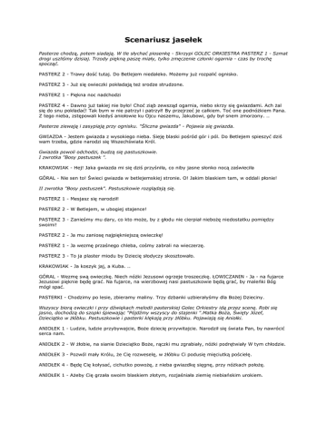 Scenariusz jasełek Pasterze chodzą, potem siadają. W tle słychać piosenkę - Skrzypi GOLEC ORKIESTRA PASTERZ 1 - Szmat drogi uszliśmy dzisiaj. Trzody piękną paszę miały, tylko zmęczenie członki ogarnia - czas by trochę spocząć. PASTERZ 2 - Trawy dość tutaj. Do Betlejem niedaleko. MoŜemy juŜ rozpalić ognisko. PASTERZ 3 - JuŜ się owieczki pokładają teŜ srodze strudzone. PASTERZ 1 - Piękna noc nadchodzi PASTERZ 4 - Dawno juŜ takiej nie było! Choć ziąb zewsząd ogarnia, niebo skrzy się gwiazdami. Ach Ŝal się do snu pokładać! Tak bym w nie patrzył i patrzył! By przejrzeć je całkiem. Toć one podnóŜkiem Pana. Z tego nieba, zstępowali kiedyś aniołowie ku Ojcu naszemu, Jakubowi, gdy był snem zmorzony. .. Pasterze ziewają i zasypiają przy ognisku. "Śliczna gwiazda" - Pojawia się gwiazda. GWIAZDA - Jestem gwiazda z wysokiego nieba. Sieję blaski pośród gór i pól. Do Betlejem spieszyć dziś wam trzeba, gdzie narodzi się Wszechświata Król. Gwiazda powoli odchodzi, budzą się pastuszkowie. I zwrotka "Bosy pastuszek ". KRAKOWIAK - Hej! Jaka gwiazda mi się dziś przyśniła, co niby jasne słonko nocą zaświeciła GÓRAL - Nie sen to! Świeci gwiazda w betlejemskiej stronie. O! Jakim blaskiem tam, w oddali płonie! II zwrotka "Bosy pastuszek". Pastuszkowie rozglądają się. PASTERZ 1 - Mesjasz się narodził! PASTERZ 2 - W Betlejem, w ubogiej stajence! PASTERZ 3 - Zanieśmy mu dary, co kto moŜe, by z głodu nie cierpiał nieboŜę niedostatku pomiędzy swoimi! PASTERZ 2 - Ja mu zaniosę najpiękniejszą owieczkę! PASTERZ 1 - Ja wezmę przaśnego chleba, cośmy zabrali na wieczerzę. PASTERZ 3 - To ja plaster miodu by Dziecię słodyczy skosztowało. KRAKOWIAK - Ja koszyk jaj, a Kuba. .. GÓRAL - Wezmę swą owieczkę. Niech nóŜki Jezusowi ogrzeje troszeczkę. ŁOWICZANIN - Ja - na fujarce Jezusowi pięknie będę grać. Na fujarce, na wierzbowej nasi pastuszkowie będą grać, by maleńki Bóg mógł spać. PASTERKI - Chodzimy po lesie, zbieramy maliny. Trzy dzbanki uzbierałyśmy dla BoŜej Dzieciny. Wszyscy biorą owieczki i przy dźwiękach melodii pasterskiej Golec Orkiestry idą przez scenę. Robi się jasno, dochodzą do szopki śpiewając "Pójdźmy wszyscy do stajenki ".Matka BoŜa, Święty Józef, Dzieciątko w Ŝłóbku. Pastuszkowie i pasterki klękają przy Ŝłóbku. Pojawiają się Aniołki. ANIOŁEK 1 - Ludzie, ludzie przybywajcie, BoŜe dziecię przywitajcie. Narodził się świata Pan, by nawrócić serca nam. ANIOŁEK 2 - W Ŝłobie, na sianie Dzieciątko BoŜe, rączki mu zgrabiały, nóŜki podrętwiały W tym chłodzie. ANIOŁEK 3 - Pozwól mały Królu, Ŝe Cię rozweselę, w Ŝłóbku Ci podusię mięciutką pościelę. ANIOŁEK 4 - Będę Cię kołysać, cichutko powoŜę, z nieba gwiazdkę sięgnę, przy nóŜkach połoŜę. ANIOŁEK 1 - AŜeby Cię grzała swoim blaskiem złotym, rozjaśniała ziemię niebiańskim urokiem. PASTERZ 3 - Słonko sponad chmury niech dla Ciebie świeci, byś w mrozie nie leŜał wśród śnieŜnej zamieci. PASTERZ 1 - Postawię bliziutko drzewko choinkowe, zawieszę aniołki i światełka nowe. Stawia choinkę przy Ŝłóbku. ANIOŁEK 3 - Powieszę cukierki, jabłuszka i bombki, Ŝebyś się uśmiechnął, gdy weźmiesz do rączki. ANIOŁEK 1 - Zaśpiewam Mu, zanucę kolędę. Przez pół nocy, moŜe dłuŜej tam będę. WSZYSCY RAZEM - śebyś Mały BoŜe nie płakał, nie szlochał, bo ja Cię najwięcej i naj- mocniej kocham. Kolęda -"Oj Maluśki, Maluśki. .." Wpada Diabełek zaplątany w sieć. DIABEŁEK - O Matko BoŜa! PoskarŜyć się muszę. Posłał mnie Szatan, łowić ludzkie dusze. Tą wielką siecią dusze łowić miałem, sieć zarzuciłem, sam się zaplą- tałem. Oj, nie wrócę juŜ do czarta! Zabije mnie, bo sieć podarta! Święty Józefie, pozwól, Ŝe zostanę, to Ci ustrzegę Dzieciątko kochane. Złego wilka przegnam w puszczę i Heroda nie dopuszczę. Pozwól zostać tu, strzec Dzieciątka snu. ANIOŁOWIE - Hej, cuda tej nocy się przydarzają, Ŝe nawet diablątka się nawracają. ŚWIĘTY JÓZEF Trzeba, byście białą szatę diabłu nałoŜyły, Ŝeby nie zląkł się kosmacza nasz syneczek miły. Aniołowie ubierają diabełka w komeŜkę. DIABEŁEK - (Oglądając się) A anielskie skrzydła gdzie? (Archanioł Michał wznosi miecz) ARCHANIOŁ - Patrzcie, czego mu się chce? Czy juŜ grzechów się pozbyłeś? Czy juŜ rogi Utraciłeś? Marsz! Za progiem stań nieboŜę! Marsz! Bo mieczem Ci przy - łoŜę! Diabełek smutny chowa się za szopką. Aniołowie śpiewają kolędę - "Śliczna panienka "- 1 zwrotka. Pasterki mówią kolejno: PIERWSZA - Gdybyś się w polskiej urodził ziemi, gdybyś świat ujrzał tu, utkałabym Ci dłońmi własnymi pieluszkę z białego lnu. DRUGA -W izdebce ciepłej miałbyś posłanie, z lipy kołyskę byś miał. Nie leŜałbyś juŜ na zwykłym sianie, na miękkim puchu byś spał. TRZECIA - By nie musiała Twoja mateczka rąbeczka z głowy brać, ciepłe by runo dała owieczka, by z niego kołdrę tkać. RAZEM - Szumiałyby ci sosenki w borze, świerszcze ćwierkały do snu. Czemu, ach czemu, Maleńki BoŜe, nie urodziłeś się tu? 11 zwrotka "Śliczna panienka". Anioły zasłaniają szopkę. Ustawiają się przed szopką. śołnierze ustawiają tron. Wychodzi gwiazda. Nadchodzą trzej królowie. GWIAZDA - Jestem gwiazdą z wysokiego nieba, sieję blaski pośród gór i pól. Do Betlejem spieszyć dziś wam trzeba, gdzie narodził się Wszechmogący Świata Król. KACPER - Wiemy o tym, gwiazdo, wiemy i z dalekich ziem idziemy, by odnaleźć Maleńkiego, W księgach zapowiedzianego. MELCHIOR - Z gór dalekich idzie nasza karawana, przez pustynię i przez Ŝyzne łany, Twoim blaskiem gwiazdo - kierowana, gdzie ten król z dawna oczekiwany? BALTAZAR - Wędrujemy - Trzej Mędrcy ze Wschodu. Kresu drogi szukamy z tęsknotą, Maleńkiemu Wyborcy Narodów niosąc mirrę, kadzidło i złoto. Nadchodzi wysłannik Heroda. Mówi 
