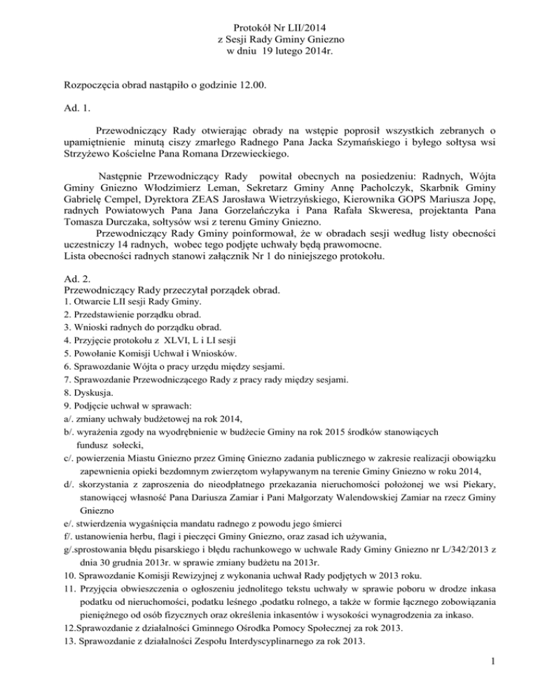 Protokół Nr LII/2014 z Sesji Rady Gminy Gniezno w dniu 19 lutego 2014r. Rozpoczęcia obrad nastąpiło o godzinie 12.00. Ad. 1. Przewodniczący Rady otwierając obrady na wstępie poprosił wszystkich zebranych o upamiętnienie minutą ciszy zmarłego Radnego Pana Jacka Szymańskiego i byłego sołtysa wsi Strzyżewo Kościelne Pana Romana Drzewieckiego. Następnie Przewodniczący Rady powitał obecnych na posiedzeniu: Radnych, Wójta Gminy Gniezno Włodzimierz Leman, Sekretarz Gminy Annę Pacholczyk, Skarbnik Gminy Gabrielę Cempel, Dyrektora ZEAS Jarosława Wietrzyńskiego, Kierownika GOPS Mariusza Jopę, radnych Powiatowych Pana Jana Gorzelańczyka i Pana Rafała Skweresa, projektanta Pana Tomasza Durczaka, sołtysów wsi z terenu Gminy Gniezno. Przewodniczący Rady Gminy poinformował, że w obradach sesji według listy obecności uczestniczy 14 radnych, wobec tego podjęte uchwały będą prawomocne. Lista obecności radnych stanowi załącznik Nr 1 do niniejszego protokołu. Ad. 2. Przewodniczący Rady przeczytał porządek obrad. 1. Otwarcie LII sesji Rady Gminy. 2. Przedstawienie porządku obrad. 3. Wnioski radnych do porządku obrad. 4. Przyjęcie protokołu z XLVI, L i LI sesji 5. Powołanie Komisji Uchwał i Wniosków. 6. Sprawozdanie Wójta o pracy urzędu między sesjami. 7. Sprawozdanie Przewodniczącego Rady z pracy rady między sesjami. 8. Dyskusja. 9. Podjęcie uchwał w sprawach: a/. zmiany uchwały budżetowej na rok 2014, b/. wyrażenia zgody na wyodrębnienie w budżecie Gminy na rok 2015 środków stanowiących fundusz sołecki, c/. powierzenia Miastu Gniezno przez Gminę Gniezno zadania publicznego w zakresie realizacji obowiązku zapewnienia opieki bezdomnym zwierzętom wyłapywanym na terenie Gminy Gniezno w roku 2014, d/. skorzystania z zaproszenia do nieodpłatnego przekazania nieruchomości położonej we wsi Piekary, stanowiącej własność Pana Dariusza Zamiar i Pani Małgorzaty Walendowskiej Zamiar na rzecz Gminy Gniezno e/. stwierdzenia wygaśnięcia mandatu radnego z powodu jego śmierci f/. ustanowienia herbu, flagi i pieczęci Gminy Gniezno, oraz zasad ich używania, g/.sprostowania błędu pisarskiego i błędu rachunkowego w uchwale Rady Gminy Gniezno nr L/342/2013 z dnia 30 grudnia 2013r. w sprawie zmiany budżetu na 2013r. 10. Sprawozdanie Komisji Rewizyjnej z wykonania uchwał Rady podjętych w 2013 roku. 11. Przyjęcia obwieszczenia o ogłoszeniu jednolitego tekstu uchwały w sprawie poboru w drodze inkasa podatku od nieruchomości, podatku leśnego ,podatku rolnego, a także w formie łącznego zobowiązania pieniężnego od osób fizycznych oraz określenia inkasentów i wysokości wynagrodzenia za inkaso. 12.Sprawozdanie z działalności Gminnego Ośrodka Pomocy Społecznej za rok 2013. 13. Sprawozdanie z działalności Zespołu Interdyscyplinarnego za rok 2013. 1 14.Sprawozdanie Przewodniczącej z działalności Gminnej Komisji Rozwiązywania Problemów Alkoholowych i Przeciwdziałaniu Narkomanii za rok 2013. 15. Interpelacje i zapytania radnych. 16. Odpowiedzi na zapytania radnych. 17. Wolne wnioski i informacje. 18. Zakończenie obrad LII sesji Rady Gminy. Ad.3 Radny Henryk Kryściak zgłosił uwagę do porządku obrad poprosił radę o przegłosowanie zdjęcia z porządku obrad punktu 9e – stwierdzenie wygaśnięcia mandatu radnego z powodu jego śmierci. Motywował to tym, że jeżeli ta uchwała byłaby podjęta na następnej sesji wówczas nie byłoby wyborów uzupełniających. Jesienią tego roku będą wybory samorządowe więc nowego radnego wybrano by na pół roku. Ponadto wybory uzupełniające pociągnęły by za sobą dodatkowe koszty, obawia się że będzie słaba frekwencja mieszkańców. Rada ma 3 miesiące na wygaszenie mandatu od chwili zdarzenia i nic się nie stanie jeżeli rada podejmie tą decyzję na następnej sesji i wówczas nie będzie wyborów uzupełniających. Przewodniczący Rady powiedział, że radny Kryściak próbuje zastąpić wojewodę, a nie ma do tego kompetencji, czy odbędą się wybory zdecyduje wojewoda. Przepis jest taki, że rada wygasza mandat nie późnij niż w ciągu 3 miesięcy. Sejm uchwalił ustawę i rada powinna się do niej stosować. Przewodniczący Rady poddał wniosek radnego pod głosowanie: za wnioskiem było 6 głosów, przeciw 6, wstrzymujące 2 głosy. Przewodniczący Rady stwierdził, że wniosek upadł ponieważ wniosek o wykreślenie punktu z porządku obrad musiał uzyskać bezwzględną większość, a takiej nie ma. Głosowanie bezwzględną większością w przypadku zmiany w porządku obrad głosy wstrzymujące liczą się do głosów przeciw. Radny Mariusz Nawrocki poprosił o wypowiedź radcy prawnego w powyższej sprawie oraz zapytał który protokół rada będzie głosowała, XLVI czy XLIX ponieważ na stronie internetowej urzędu był XLIX protokół. Przewodniczący Rady – rada będzie głosowała te protokoły, które są w porządku obrad. Radca prawny urzędu Pan Henryk Klich powiedział, że ustawa o samorządzie gminnym wyraźnie określa przypadki, gdzie jest potrzebna albo bezwzględna większość głosów lub większość głosów np. przy odwołaniu z funkcji przewodniczącego rady lub przy wyborze. Zwykła większość głosów oznacza, że przechodzi wniosek jeżeli za wnioskiem głosowało by więcej za chociaż o jeden głos niż przeciw. Jeśli chodzi o głosy wstrzymujące się to nie dolicza się ich do żadnej z grup. Jeśli chodzi o głosowanie bezwzględną większością głosów to przechodzi wniosek który uzyskał co najmniej jeden głos więcej od sumy pozostałych ważnie oddanych głosów. Czy radni zdejmują jakiś punkt z porządku obrad, czy nie głosuje się zwykłą większością głosów. W tym przypadku jeśli 6 głosów było przeciw, 6 za,2 wstrzymujące się tzn.że rada nie podjęła żadnej uchwały, czy zdjąć, czy nie zdjąć. Jeżeli Przewodniczący Rady ujął ten punkt w porządku obrad to musi być realizowany 