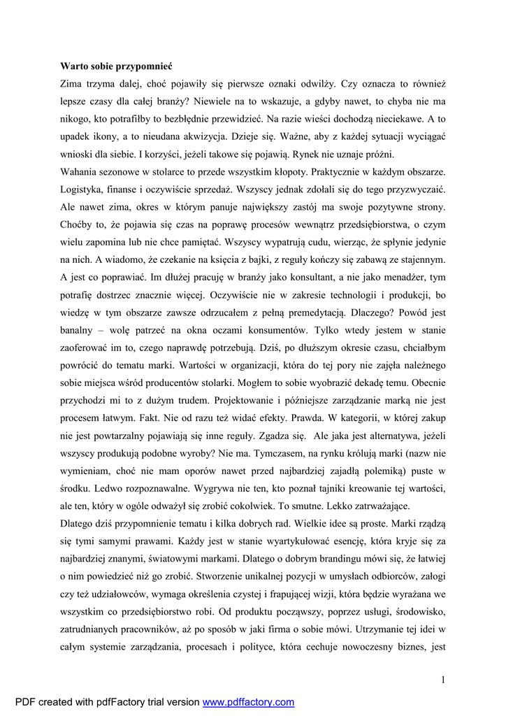 Warto sobie przypomnieć Zima trzyma dalej, choć pojawiły się pierwsze oznaki odwilży. Czy oznacza to również lepsze czasy dla całej branży? Niewiele na to wskazuje, a gdyby nawet, to chyba nie ma nikogo, kto potrafiłby to bezbłędnie przewidzieć. Na razie wieści dochodzą nieciekawe. A to upadek ikony, a to nieudana akwizycja. Dzieje się. Ważne, aby z każdej sytuacji wyciągać wnioski dla siebie. I korzyści, jeżeli takowe się pojawią. Rynek nie uznaje próżni. Wahania sezonowe w stolarce to przede wszystkim kłopoty. Praktycznie w każdym obszarze. Logistyka, finanse i oczywiście sprzedaż. Wszyscy jednak zdołali się do tego przyzwyczaić. Ale nawet zima, okres w którym panuje największy zastój ma swoje pozytywne strony. Choćby to, że pojawia się czas na poprawę procesów wewnątrz przedsiębiorstwa, o czym wielu zapomina lub nie chce pamiętać. Wszyscy wypatrują cudu, wierząc, że spłynie jedynie na nich. A wiadomo, że czekanie na księcia z bajki, z reguły kończy się zabawą ze stajennym. A jest co poprawiać. Im dłużej pracuję w branży jako konsultant, a nie jako menadżer, tym potrafię dostrzec znacznie więcej. Oczywiście nie w zakresie technologii i produkcji, bo wiedzę w tym obszarze zawsze odrzucałem z pełną premedytacją. Dlaczego? Powód jest banalny – wolę patrzeć na okna oczami konsumentów. Tylko wtedy jestem w stanie zaoferować im to, czego naprawdę potrzebują. Dziś, po dłuższym okresie czasu, chciałbym powrócić do tematu marki. Wartości w organizacji, która do tej pory nie zajęła należnego sobie miejsca wśród producentów stolarki. Mogłem to sobie wyobrazić dekadę temu. Obecnie przychodzi mi to z dużym trudem. Projektowanie i późniejsze zarządzanie marką nie jest procesem łatwym. Fakt. Nie od razu też widać efekty. Prawda. W kategorii, w której zakup nie jest powtarzalny pojawiają się inne reguły. Zgadza się. Ale jaka jest alternatywa, jeżeli wszyscy produkują podobne wyroby? Nie ma. Tymczasem, na rynku królują marki (nazw nie wymieniam, choć nie mam oporów nawet przed najbardziej zajadłą polemiką) puste w środku. Ledwo rozpoznawalne. Wygrywa nie ten, kto poznał tajniki kreowanie tej wartości, ale ten, który w ogóle odważył się zrobić cokolwiek. To smutne. Lekko zatrważające. Dlatego dziś przypomnienie tematu i kilka dobrych rad. Wielkie idee są proste. Marki rządzą się tymi samymi prawami. Każdy jest w stanie wyartykułować esencję, która kryje się za najbardziej znanymi, światowymi markami. Dlatego o dobrym brandingu mówi się, że łatwiej o nim powiedzieć niż go zrobić. Stworzenie unikalnej pozycji w umysłach odbiorców, załogi czy też udziałowców, wymaga określenia czystej i frapującej wizji, która będzie wyrażana we wszystkim co przedsiębiorstwo robi. Od produktu począwszy, poprzez usługi, środowisko, zatrudnianych pracowników, aż po sposób w jaki firma o sobie mówi. Utrzymanie tej idei w całym systemie zarządzania, procesach i polityce, która cechuje nowoczesny biznes, jest 1 PDF created with pdfFactory trial version www.pdffactory.com właśnie tym kluczowym zadaniem. Nie da się tego zrobić bez koncentracji, pasji i poświęcenia. Sojusz czy też równy krok do przodu osiąga się tylko wtedy, gdy pracownicy rozumieją i prezentują markę i jej wartości w swoich codziennych działaniach i zachowaniach. Można ten element nazwać krytycznym dla końcowego sukcesu. Każdy w tym miejscu może zadać sobie pytanie, czy w jego organizacji taki proces ma miejsce. Mogę pomóc - nie ma. W pogoni za wzajemnym wyrywaniem sobie ochłapów rynkowych, tego typu zadania nie mają szans się pojawić. Nawet jeżeli ktoś kiedyś sformułował podstawy. To jest właśnie wielka słabość całej kategorii. Ale nie jedyna. Kłopot zaczyna się, w zasadzie, na poziomie najprostszych pojęć. Wszyscy mówią o markach i jej głównych aspektach, nie za bardzo wiedząc, o czym mówią. Czy coś, co jest znane, automatycznie jest markowe? Ostatnio nasza firma miała zaszczyt opracować i przedstawić nową strategię marki Kazimierz Dolny. Mimo, że jest to miejscowość niewielka, to jednak wzbudza uzasadnione emocje. Stąd na spotkaniu obecnych było wielu reprezentantów innych miast i regionów. W momencie gdy padło z naszej strony zdanie, że mamy do czynienia z jedynym markowym miejscem na Lubelszczyźnie, odezwały się wzburzone głosy widowni. Padły mniej więcej wyrażenia w stylu herezja, głupota i niekompetencja. Niełatwo nas przestraszyć. Szczególnie gdy mamy rację. No właśnie nie! Odpowiednie zarządzanie marką prowadzi do wzrostu jej kapitału, czyli wykreowanej sumy jakościowych różnic pomiędzy nią a konkurencją. Różnic, które konsumenci oceniają jako ważne i za które chcą płacić premię cenową. Jeżeli za naszą markę nie możemy pobierać wyższej ceny niż inni, to możemy sobie ją spokojnie wsadzić w buty. To, że na przykład Zamość jest dość znanym miastem, nie znaczy wiele więcej ponad samo to stwierdzenie. Nikt nie zapłaci za pobyt tam więcej, niż dajmy na to w Białymstoku czy Puławach. Znajomość marki, czyli zdolność klientów do potwierdzenia kontaktu z jej nazwą nie jest warunkiem wystarczającym, a jedynie koniecznym. Trudno bowiem uznać coś za wartościowe, jeżeli nigdy o tym nie słyszeliśmy. Swego czasu John Stewart, prezes Quaker wypowiedział takie oto słynne zdanie – „Jeżeli mielibyśmy podzielić nasz biznes, z chęcią odstąpię Ci ziemię, budynki i maszyny, a zachowam prawa do marki. Wyjdę na tym na pewno lepiej niż Ty”. Ilu z producentów stolarki otworowej zgodziłoby się na taki podział? Wystarczy palców u jednej ręki. Żeby zmienić ten układ potrzebne jest myślenie strategiczne, a nie doraźne. Dochodzimy tym samym do kolejnego ważnego pojęcia – strategii marki. Określenia sposobu, w jaki marka ma dostarczyć unikalne i ważne kor