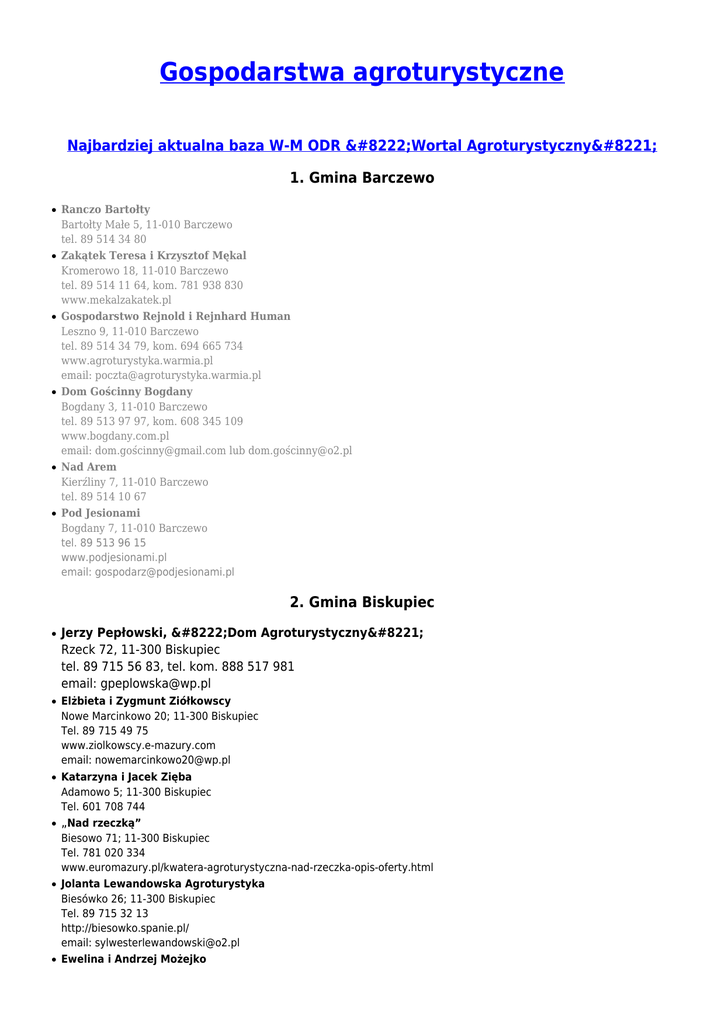 Gospodarstwa agroturystyczne Najbardziej aktualna baza W-M ODR „Wortal Agroturystyczny” 1. Gmina Barczewo ● ● ● ● ● ● Ranczo Bartołty Bartołty Małe 5, 11-010 Barczewo tel. 89 514 34 80 Zakątek Teresa i Krzysztof Mękal Kromerowo 18, 11-010 Barczewo tel. 89 514 11 64, kom. 781 938 830 www.mekalzakatek.pl Gospodarstwo Rejnold i Rejnhard Human Leszno 9, 11-010 Barczewo tel. 89 514 34 79, kom. 694 665 734 www.agroturystyka.warmia.pl email: [email protected] Dom Gościnny Bogdany Bogdany 3, 11-010 Barczewo tel. 89 513 97 97, kom. 608 345 109 www.bogdany.com.pl email: dom.goś[email protected] lub dom.goś[email protected] Nad Arem Kierźliny 7, 11-010 Barczewo tel. 89 514 10 67 Pod Jesionami Bogdany 7, 11-010 Barczewo tel. 89 513 96 15 www.podjesionami.pl email: [email protected] 2. Gmina Biskupiec ● ● ● ● ● ● Jerzy Pepłowski, „Dom Agroturystyczny” Rzeck 72, 11-300 Biskupiec tel. 89 715 56 83, tel. kom. 888 517 981 email: [email protected] Elżbieta i Zygmunt Ziółkowscy Nowe Marcinkowo 20; 11-300 Biskupiec Tel. 89 715 49 75 www.ziolkowscy.e-mazury.com email: [email protected] Katarzyna i Jacek Zięba Adamowo 5; 11-300 Biskupiec Tel. 601 708 744 „Nad rzeczką” Biesowo 71; 11-300 Biskupiec Tel. 781 020 334 www.euromazury.pl/kwatera-agroturystyczna-nad-rzeczka-opis-oferty.html Jolanta Lewandowska Agroturystyka Biesówko 26; 11-300 Biskupiec Tel. 89 715 32 13 http://biesowko.spanie.pl/ email: [email protected] Ewelina i Andrzej Możejko ● ● ● ● ● ● ● ● ● ● ● ● ● ● Biesowo 51, 11-300 Biskupiec Tel.602 19 19 41, 89 715 38 39 www.biesowo.com/agroturystyka.php Agroturystyka na Mazurach „Pod Wierzbą” Biesowo 6; 11-300 Biskupiec Tel. 663 804 487 http://www.euromazury.pl/agroturystyka-pod-wierzba-opis-oferty.html Janina Duchniewicz ul. Poznańska 2/4, 11-300 Biskupiec Tel. 89 715 30 52 Lidia i Józef Taube Dębowo 5; 11-300 Biskupiec Tel. 89 715 30 69 http://noclegi.pl/agrotaube Siedlisko „KOREK” Kamionka 14; 11-300 Biskupiec Tel. 601 094 718 http://www.agroturystykamazury.eu/ email: [email protected] Teresa Golan Najdymowo 100; 11-300 Biskupiec Tel. 89 715 44 98 „Orła cień” Najdymowo 2; 11-300 Biskupiec Tel. 501 033 691, 668 031 095 www.orlacien.pl email: [email protected] Krystyna i Hans Goerke „Dom nad jeziorem” Rasząg 18; 11-300 Biskupiec Tel. 89 715 48 83 http://www.raszag.cba.pl/ Robert Karaźniewicz Rukławki 2; 11-300 Biskupiec Tel. 89 715 36 82 http://www.ruklawki.friko.pl/ email: [email protected] Małgorzata Wasilewska Rukławki 36A; 11-300 Biskupiec Tel. 89 715 47 16 http://www.agroturystyka-mazury.pl/ email: [email protected] Bożena Rodzik Rzeck 23; 11-300 Biskupiec Tel. 89 715 49 74 email: [email protected] Danuta i Czesław Kacperscy Stryjewo 69 11-300 Biskupiec Tel. 694 094 427, 604 508 667 www.naskarpie.strefa.pl email: [email protected] Krzysztof Bejnar Stryjewo 7; 11-300 Biskupiec Tel. 89 715 36 80 Agroturystyka Węgój 22; 11-300 Biskupiec Tel. 089 715 43 15, 515 578 617 http://www.euromazury.pl/dom-letniskowy-na-wsi-wegoj-opis-oferty.html Teresa Jesionowska Węgój 84; 11-300 Biskupiec Tel. 89 715 36 38 ● ● email: [email protected] Elżbieta Golc Wilimy 2; 11-300 Biskupiec Tel.89 514 57 68, 506 790 901 http://www.eholiday.pl/noclegi-kk7407.html email: [email protected] Jolanta i Józef Kucharewicz Gospodarstwo Agroturystyczne „Urszula” Wilimy 13; 11-300 Biskupiec Tel. 89 715 39 21 http://www.eholiday.pl/noclegi-sw4988.html 3. Gmina Dobre Miasto ● ● ● ● ● Irena Tomaszewska Nowa Wieś Mała, 11-040 Dobre Miasto tel.89 616 23 82 Katarzyna i Krzysztof Budyta Praslity 48, 11-040 Dobre Miasto tel. 89 616 26 74, 606 734 711 email: [email protected] Bożena Wołkowicka Łęgno 25, 11-040 Dobre Miasto tel. 89 616 39 65, 504 064 607 www.naszdom25.republica.pl email: [email protected] Zbigniew Legat „Orzechowe Wzgórze” Orzechowo 68, 11-040 Dobre Miasto tel. 89 533 45 85, 0504 405 761 Agnieszka M. Auneddu Praslity 36, 11-040 Dobre Miasto tel. 512-217-418 email: [email protected] 4. Gmina Gietrzwałd ● ● ● ● ● Leśna Polanka Biesal 86C; 11-36 Gietrzwałd Tel: +48 504 048 892 ; +48 509 415 511 www.lesnapolanka.pl email: [email protected] Czarcia Podkowa Dłużki 15, 11-036 Gietrzwałd tel: 507 523 405 www.czarcia-podkowa.com email: [email protected] AGROJELONKI Łąkowa 2, 11-036 Gietrzwałd tel. 504 208 630 www.agrojelonki.olsztyn.pl email: [email protected] Ostoja Gietrzwałd, ul. Dolina Pasłęki 1, 11-036 Gietrzwałd tel. 89 513 12 42 www.ostojaidea.eu email: [email protected] Gospodarstwo agroturystyczne „Guzowy Młyn” Guzowy Młyn 33; 11-036 Gietrzwałd tel. +48 89 513 14 44 www.guzowy-mlyn.pl email: [email protected] ● ● ● ● ● ● ● ● ● ● Hincówka Naterki, ul. Bursztynowa 23 a; 11-036 Gietrzwałd tel. + 48 89 513 16 50; kom. 507 088 418; 603 756 240 www.hincowka.fr.pl email:[email protected] Rancho Warmińskie Pęglity 20, 11-036 Gietrzwałd tel. 89 512 34 82 Anrys Rapaty 26, 11-036 Gietrzwałd tel. 89 513 11 31 www.anrys.cba.pl email: [email protected] Agroturystyka u Antka Rapaty 1, 11-036 Gietrzwałd tel. 89 513 14 40, kom. 601 561 026 www.rapaty.pl email: [email protected] Trakeny Sząbruk, ul. Św. Huberta 118, 11-036 Gietrzwałd tel. 89 513 05 73 www.trakeny.republika.pl email: [email protected] Dolina Mirzy Tomaryny 26, 11-036 Gietrzwałd tel. 604 404 654 www.dolinamirzy.olsztyn.pl Pod Dębem Tomaryny 22, 11-036 Gietrzwałd tel. 89 513 11 59 Spacjówka Unieszewo 29, 11-036 Gietrzwałd tel. 89 527 36 48, kom. 886 487 439 email: [email protected] Dom Gościnny Woryty 25, 11-036 Gietrzwałd tel. 89 512 31 36, kom. 505 537 524 Kozi Dwór Gietrzwałd, ul. Olsztyńska 38, 11-036 Gietrzwałd tel. 89 512 34 56, kom. 515 233 993 www.kozidwor.pl email: [email protected] 5. Gmina Jeziorany ● ● ● ● Ranczo Zerbuń „Zacisze” Zerbuń , 11-320 Jeziorany tel.: 502 288 705 lub 502 288 799 www.zerbunzacisze.pl email: [email protected] FAJNE MIE