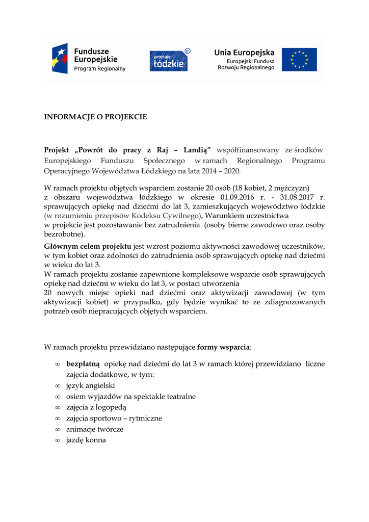 INFORMACJE O PROJEKCIE Projekt „Powrót do pracy z Raj – Landią”