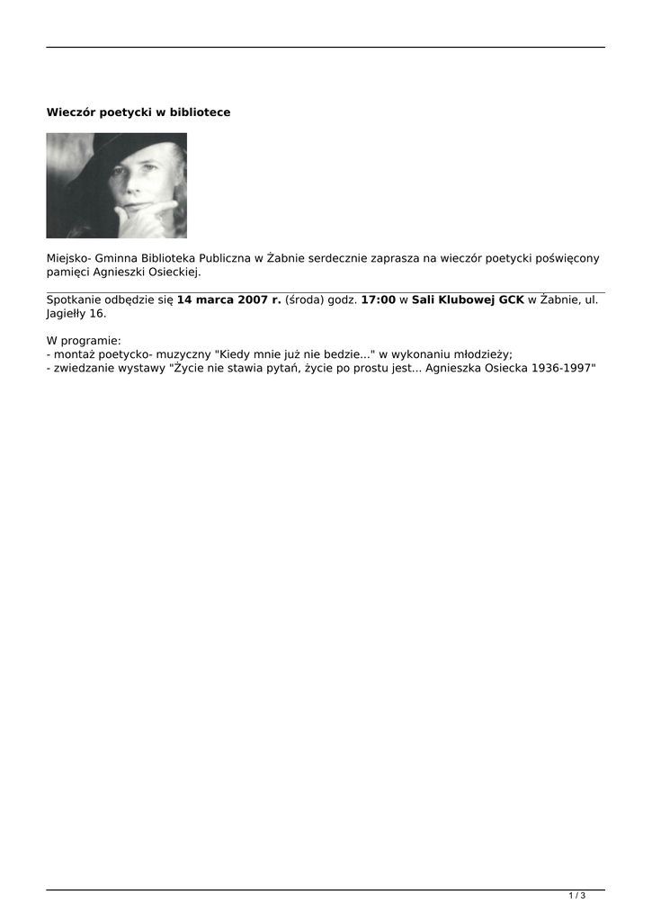 Wieczór poetycki w bibliotece Miejsko- Gminna Biblioteka Publiczna w Żabnie serdecznie zaprasza na wieczór poetycki poświęcony pamięci Agnieszki Osieckiej. Spotkanie odbędzie się 14 marca 2007 r. (środa) godz. 17:00 w Sali Klubowej GCK w Żabnie, ul. Jagiełły 16. W programie: - montaż poetycko- muzyczny "Kiedy mnie już nie bedzie..." w wykonaniu młodzieży; - zwiedzanie wystawy "Życie nie stawia pytań, życie po prostu jest... Agnieszka Osiecka 1936-1997" 1/3 2/3 3/3 Powered by TCPDF (www.tcpdf.org)