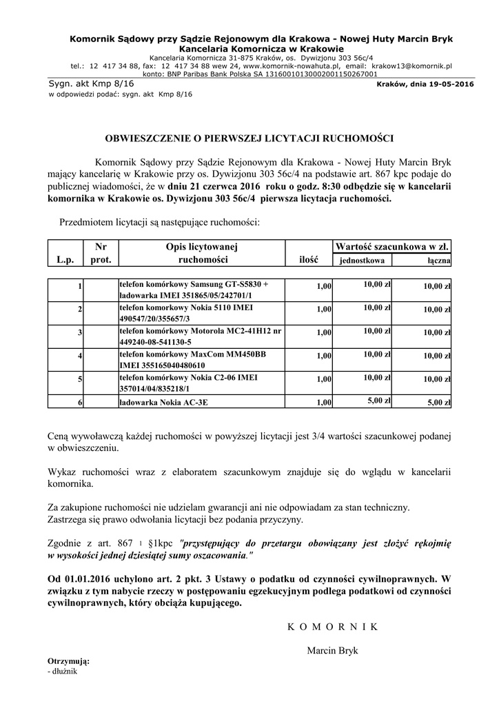 Komornik Sądowy przy Sądzie Rejonowym dla Krakowa - Nowej Huty Marcin Bryk Kancelaria Komornicza w Krakowie Kancelaria Komornicza 31-875 Kraków, os. Dywizjonu 303 56c/4 tel.: 12 417 34 88, fax: 12 417 34 88 wew 24, www.komornik-nowahuta.pl, email: [email protected] konto: BNP Paribas Bank Polska SA 13160010130002001150267001 Sygn. akt Kmp 8/16 Kraków, dnia 19-05-2016 w odpowiedzi podać: sygn. akt Kmp 8/16 OBWIESZCZENIE O PIERWSZEJ LICYTACJI RUCHOMOŚCI Komornik Sądowy przy Sądzie Rejonowym dla Krakowa - Nowej Huty Marcin Bryk mający kancelarię w Krakowie przy os. Dywizjonu 303 56c/4 na podstawie art. 867 kpc podaje do publicznej wiadomości, że w dniu 21 czerwca 2016 roku o godz. 8:30 odbędzie się w kancelarii komornika w Krakowie os. Dywizjonu 303 56c/4 pierwsza licytacja ruchomości. Przedmiotem licytacji są następujące ruchomości: Nr prot. L.p. 1 2 3 4 5 6 Opis licytowanej ruchomości Wartość szacunkowa w zł. ilość jednostkowa łączna telefon komórkowy Samsung GT-S5830 + ładowarka IMEI 351865/05/242701/1 telefon komorkowy Nokia 5110 IMEI 490547/20/355657/3 telefon komórkowy Motorola MC2-41H12 nr 449240-08-541130-5 telefon komórkowy MaxCom MM450BB IMEI 355165040480610 telefon komórkowy Nokia C2-06 IMEI 357014/04/835218/1 1,00 10,00 zł 10,00 zł 1,00 10,00 zł 10,00 zł 1,00 10,00 zł 10,00 zł 1,00 10,00 zł 10,00 zł 1,00 10,00 zł 10,00 zł ładowarka Nokia AC-3E 1,00 5,00 zł 5,00 zł Ceną wywoławczą każdej ruchomości w powyższej licytacji jest 3/4 wartości szacunkowej podanej w obwieszczeniu. Wykaz ruchomości wraz z elaboratem szacunkowym znajduje się do wglądu w kancelarii komornika. Za zakupione ruchomości nie udzielam gwarancji ani nie odpowiadam za stan techniczny. Zastrzega się prawo odwołania licytacji bez podania przyczyny. Zgodnie z art. 867 1 §1kpc "przystępujący do przetargu obowiązany jest złożyć rękojmię w wysokości jednej dziesiątej sumy oszacowania." Od 01.01.2016 uchylono art. 2 pkt. 3 Ustawy o podatku od czynności cywilnoprawnych. W związku z tym nabycie rzeczy w postępowaniu egzekucyjnym podlega podatkowi od czynności cywilnoprawnych, który obciąża kupującego. K O M O R N I K Marcin Bryk Otrzymują: - dłużnik - wierzyciel - Wasz znak XI C 3698/11 09.11.2012 r. - Sąd Rejonowy - tablica ogłoszeń - a/a Pouczenie: Pełnomocnictwo do udziału w przetargu powinno być stwierdzone dokumentem z podpisem urzędowo poświadczonym, chyba że chodzi o pełnomocnictwo udzielone adwokatowi lub racy prawnemu" (art. 867ze zn. 2 §4kpc).