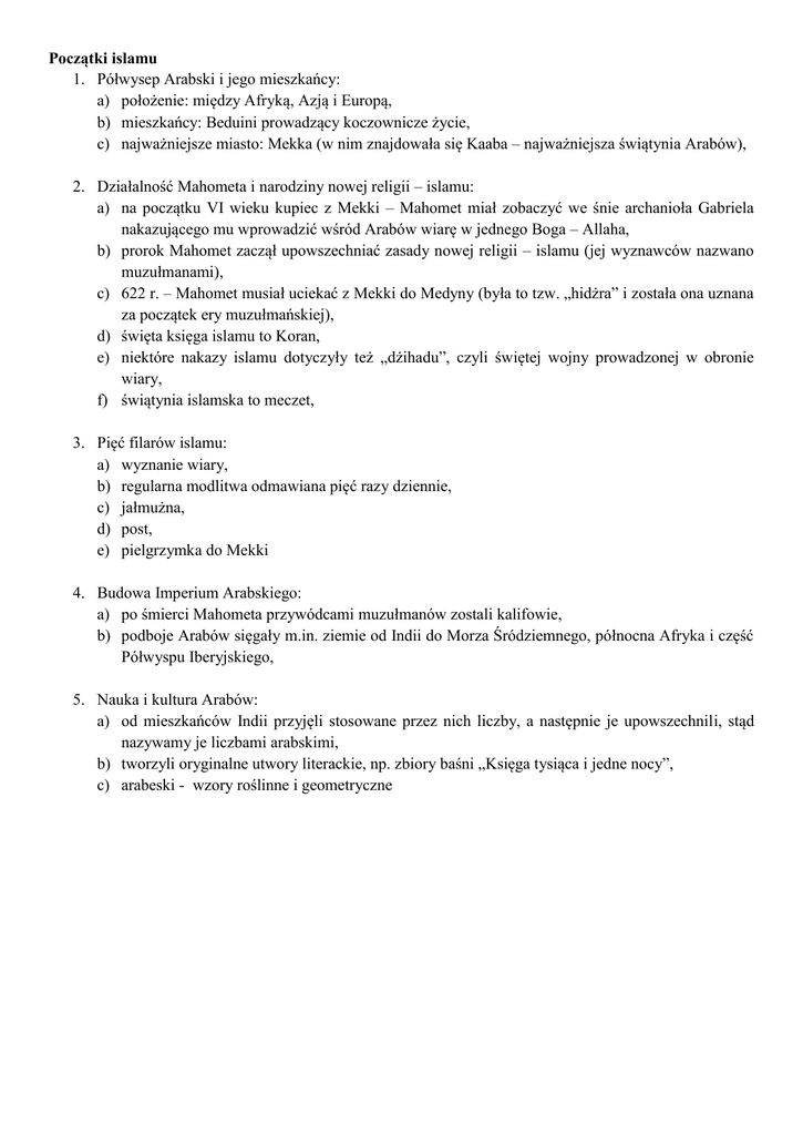 Początki islamu 1. Półwysep Arabski i jego mieszkańcy: a) położenie: między Afryką, Azją i Europą, b) mieszkańcy: Beduini prowadzący koczownicze życie, c) najważniejsze miasto: Mekka (w nim znajdowała się Kaaba – najważniejsza świątynia Arabów), 2. Działalność Mahometa i narodziny nowej religii – islamu: a) na początku VI wieku kupiec z Mekki – Mahomet miał zobaczyć we śnie archanioła Gabriela nakazującego mu wprowadzić wśród Arabów wiarę w jednego Boga – Allaha, b) prorok Mahomet zaczął upowszechniać zasady nowej religii – islamu (jej wyznawców nazwano muzułmanami), c) 622 r. – Mahomet musiał uciekać z Mekki do Medyny (była to tzw. „hidżra” i została ona uznana za początek ery muzułmańskiej), d) święta księga islamu to Koran, e) niektóre nakazy islamu dotyczyły też „dżihadu”, czyli świętej wojny prowadzonej w obronie wiary, f) świątynia islamska to meczet, 3. Pięć filarów islamu: a) wyznanie wiary, b) regularna modlitwa odmawiana pięć razy dziennie, c) jałmużna, d) post, e) pielgrzymka do Mekki 4. Budowa Imperium Arabskiego: a) po śmierci Mahometa przywódcami muzułmanów zostali kalifowie, b) podboje Arabów sięgały m.in. ziemie od Indii do Morza Śródziemnego, północna Afryka i część Półwyspu Iberyjskiego, 5. Nauka i kultura Arabów: a) od mieszkańców Indii przyjęli stosowane przez nich liczby, a następnie je upowszechnili, stąd nazywamy je liczbami arabskimi, b) tworzyli oryginalne utwory literackie, np. zbiory baśni „Księga tysiąca i jedne nocy”, c) arabeski - wzory roślinne i geometryczne