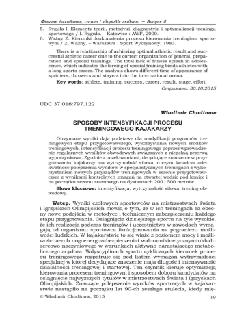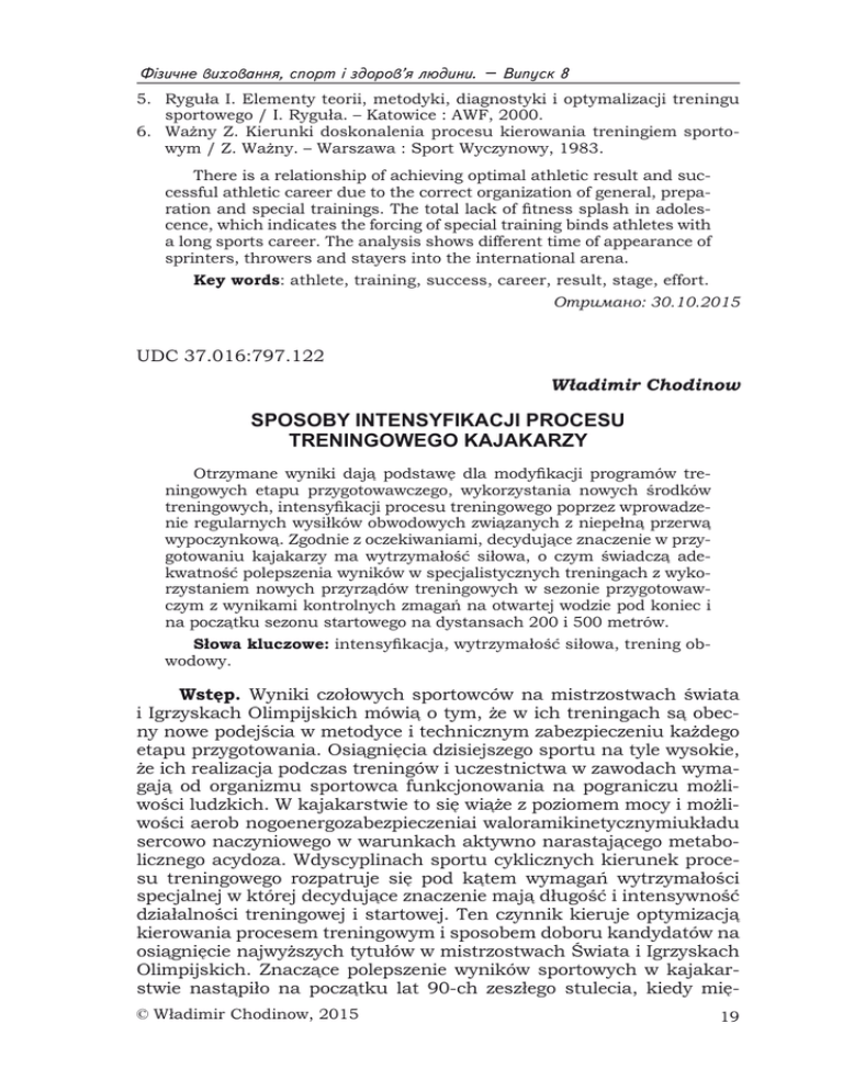 Ô³çè÷íå âèõîâàííÿ, ñïîðò ³ çäîðîâ’ÿ ëþäèíè. – Âèïóñê 8 5. Ryguła I. Elementy teorii, metodyki, diagnostyki i optymalizacji treningu sportowego / I. Ryguła. – Katowice : AWF, 2000. 6. Ważny Z. Kierunki doskonalenia procesu kierowania treningiem sportowym / Z. Ważny. – Warszawa : Sport Wyczynowy, 1983. There is a relationship of achieving optimal athletic result and successful athletic career due to the correct organization of general, preparation and special trainings. The total lack of fitness splash in adolescence, which indicates the forcing of special training binds athletes with a long sports career. The analysis shows different time of appearance of sprinters, throwers and stayers into the international arena. Key words: athlete, training, success, career, result, stage, effort. Отримано: 30.10.2015 UDC 37.016:797.122 Władimir Chodinow SPOSOBY INTENSYFIKACJI PROCESU TRENINGOWEGO KAJAKARZY Otrzymane wyniki dają podstawę dla modyfikacji programów treningowych etapu przygotowawczego, wykorzystania nowych środków treningowych, intensyfikacji procesu treningowego poprzez wprowadzenie regularnych wysiłków obwodowych związanych z niepełną przerwą wypoczynkową. Zgodnie z oczekiwaniami, decydujące znaczenie w przygotowaniu kajakarzy ma wytrzymałość siłowa, o czym świadczą adekwatność polepszenia wyników w specjalistycznych treningach z wykorzystaniem nowych przyrządów treningowych w sezonie przygotowawczym z wynikami kontrolnych zmagań na otwartej wodzie pod koniec i na początku sezonu startowego na dystansach 200 i 500 metrów. Słowa kluczowe: intensyfikacja, wytrzymałość siłowa, trening obwodowy. Wstęp. Wyniki czołowych sportowców na mistrzostwach świata i Igrzyskach Olimpijskich mówią o tym, że w ich treningach są obecny nowe podejścia w metodyce i technicznym zabezpieczeniu każdego etapu przygotowania. Osiągnięcia dzisiejszego sportu na tyle wysokie, że ich realizacja podczas treningów i uczestnictwa w zawodach wymagają od organizmu sportowca funkcjonowania na pograniczu możliwości ludzkich. W kajakarstwie to się wiąże z poziomem mocy i możliwości aerob nogoenergozabezpieczeniai waloramikinetycznymiukładu sercowo naczyniowego w warunkach aktywno narastającego metabolicznego acydoza. Wdyscyplinach sportu cyklicznych kierunek procesu treningowego rozpatruje się pod kątem wymagań wytrzymałości specjalnej w której decydujące znaczenie mają długość i intensywność działalności treningowej i startowej. Ten czynnik kieruje optymizacją kierowania procesem treningowym i sposobem doboru kandydatów na osiągnięcie najwyższych tytułów w mistrzostwach Świata i Igrzyskach Olimpijskich. Znaczące polepszenie wyników sportowych w kajakarstwie nastąpiło na początku lat 90-ch zeszłego stulecia, kiedy mię© Władimir Chodinow, 2015 19 ³ñíèê Êàì'ÿíåöü-Ïîä³ëüñüêîãî íàö³îíàëüíîãî óí³âåðñèòåòó ³ìåí³ ²âàíà Î㳺íêà dzynarodowa federacja kanoe wprowadziła nowy dystans – 200 m. Wzrosło zapotrzebowanie na specjalną siłę i wytrzymałość siłową sportowców. Razem z tym, stały niepotrzebnymi wielogodzinne treningi związane z pokonaniem w kajaku wielu kilometrów z małą intensywnością. Kajakarstwo stało bardziej widowiskowym sportem, co z kolei przyciągnęło do tej dyscypliny sporo utałętowanej młodzieży.W dyscyplinach sportu o charakterze cyklicznym kierunek procesu treningowegorozpatruje się pod kątem wymagań wytrzymałości specjalnej, gdzie decydujące znaczenie mają długość i intensywnośćwysiłku na wybranym dystansie sportowym i treningowym. Wydawałoby się że kajakarstwo dyscyplina sportu typowo letnia potrzebującaw rzekach i jeziorach przez dłuższy czas praktycznie nie zamarzniętej wody. Jednak praktyka udowodniła, że mistrzostwo świata zdobywają sportowcy i z południowych państw ( Włochy, Brazylia) i z północnych (Norwegia, Finlandia).Jeśli przygotowanie południowców może wyglądaćw «tradycyjny» sposób, to kajakarze z północnych regionów muszą kompensować niedobór treningów na otwartej wodzie innymi środkami.Etap przygotowawczy daje więcej możliwości dla wprowadzenia eksperymentów, innowacji, nowych technicznych rozwiązań.Działalność sportowa odbywa się w maksymalnym tempiez dominacją komponenta s iłowego. W tych warunkach powodzenie zależy od dwóch warunków: indywidualnych zdolności sportowca i wybranego systemu wpływu treningowego oddziaływającego na niego. W oparciu na założenie, że wieloma środkami trzeba uderzać w jeden punkt, powstał pomysł wprowadzenia w etapie przygotowawczym kajakarzy serie treningów obwodowych z wykorzystaniem specyficznych (dwa z których opatentowane przez polskie Buro patentów) wynalazków. PRYŻĄDY STOSOWANE W TRENINGACH GRUPY EKSPERYMENTALNEJ 1) Urządzeniedo rozwoju specjalnej siły i wytrzymałości siłowej kajakarzy, kanadyjkarzy składające się z nieruchomego słupazabetonowanegow ziemie, dwóch łańcuchów długości 2,5-3,5 m. przyspawanych jednym końcem z różnych stron do słupana wysokości 160 cm. Na drugich końcach łańcuchu przyspawany drążek długością 60 cm. Ogólna waga każdego łańcucha w zależności od grubości i długości może wynosić od 10 do 25 kg. Ćwiczenie wygląda następujące: sportowiec utrzymując nachwytem drążek obraca łańcuchem w dowolnym kierunku w wyznaczonym czasie (15, 30, 45, 60 i więcej sekund) podliczając ilość wykonanychobrotów. Czym więcej obrotów, tym większy wysiłek. 2) Kajakarsko-wioślarska siłowa platforma treningowa. Przedmiotem wynalazku jest niezwykle proste w konstrukcji, a jednocześnie bardzo efektywne urządzenie przeznaczone do rozwoju siły specjalnej i wytrzymałości siłowej kajakarzy i kanadyjkarzy. Budowa kajakarsko-wioślarskiej siłowej platformy treningowej. Proponowane urządzenie treningo
