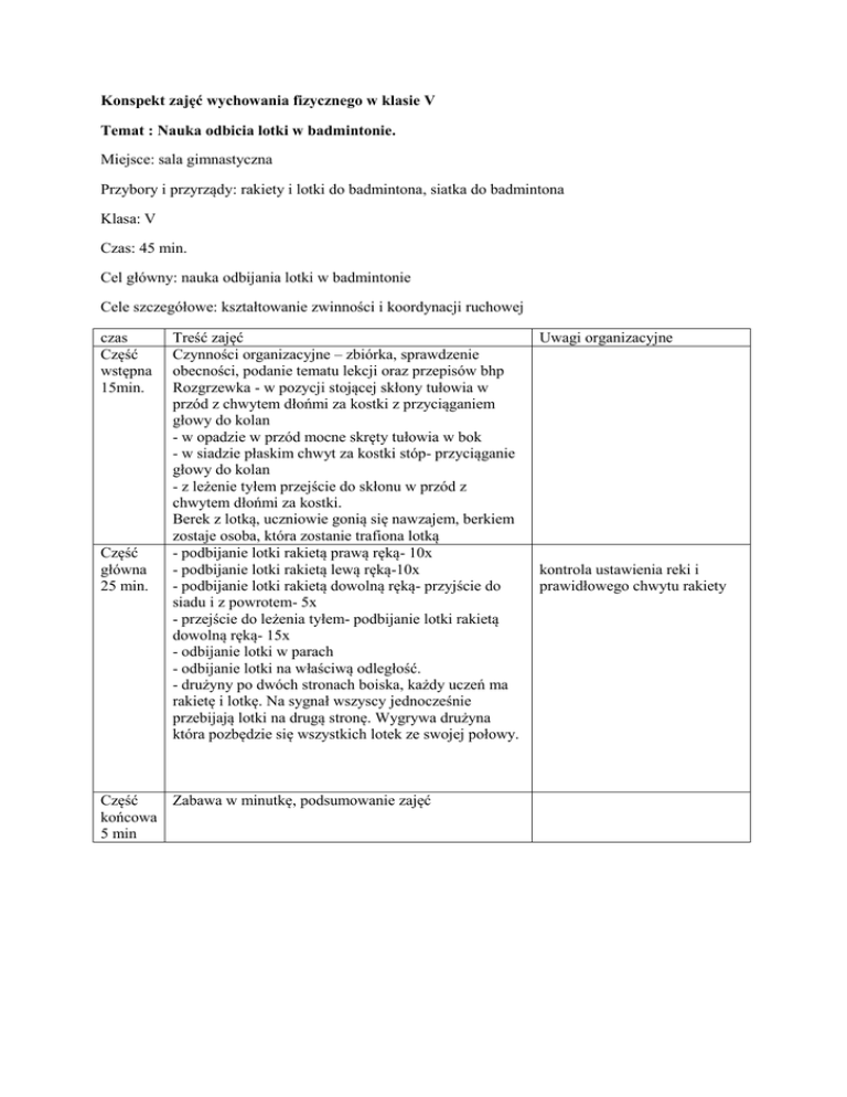 Konspekt zajęć wychowania fizycznego w klasie V Temat : Nauka odbicia lotki w badmintonie. Miejsce: sala gimnastyczna Przybory i przyrządy: rakiety i lotki do badmintona, siatka do badmintona Klasa: V Czas: 45 min. Cel główny: nauka odbijania lotki w badmintonie Cele szczegółowe: kształtowanie zwinności i koordynacji ruchowej czas Część wstępna 15min. Część główna 25 min. Treść zajęć Czynności organizacyjne – zbiórka, sprawdzenie obecności, podanie tematu lekcji oraz przepisów bhp Rozgrzewka - w pozycji stojącej skłony tułowia w przód z chwytem dłońmi za kostki z przyciąganiem głowy do kolan - w opadzie w przód mocne skręty tułowia w bok - w siadzie płaskim chwyt za kostki stóp- przyciąganie głowy do kolan - z leżenie tyłem przejście do skłonu w przód z chwytem dłońmi za kostki. Berek z lotką, uczniowie gonią się nawzajem, berkiem zostaje osoba, która zostanie trafiona lotką - podbijanie lotki rakietą prawą ręką- 10x - podbijanie lotki rakietą lewą ręką-10x - podbijanie lotki rakietą dowolną ręką- przyjście do siadu i z powrotem- 5x - przejście do leżenia tyłem- podbijanie lotki rakietą dowolną ręką- 15x - odbijanie lotki w parach - odbijanie lotki na właściwą odległość. - drużyny po dwóch stronach boiska, każdy uczeń ma rakietę i lotkę. Na sygnał wszyscy jednocześnie przebijają lotki na drugą stronę. Wygrywa drużyna która pozbędzie się wszystkich lotek ze swojej połowy. Część Zabawa w minutkę, podsumowanie zajęć końcowa 5 min Uwagi organizacyjne kontrola ustawienia reki i prawidłowego chwytu rakiety