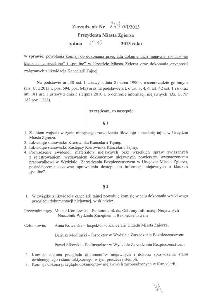 Zarządzenie Nr k H O /VI/2013 Prezydenta Miasta Zgierza z dnia /fjM0 2013 roku w sprawie: powołania komisji do dokonania przeglądu dokumentacji niejawnej oznaczonej klauzulą „zastrzeżone" i „poufne" w Urzędzie Miasta Zgierza oraz dokonania czynności związanych z likwidacją Kancelarii Tajnej. Na podstawie art. 30 ust. 1 ustawy z dnia 8 marca 1990 r. o samorządzie gminnym (Dz. U. z 2013 r. poz. 594, poz. 645) oraz na podstawie art. 6 ust. 3, 4, 6, art. 42 ust. 1 i 6 oraz art. 181 ust. 1 ustawy z dnia 5 sierpnia 2010 r. o ochronie informacji niejawnych (Dz. U . Nr 182 poz. 1228). zarządzam, co następuje: §1 1. Z dniem wejścia w życie niniejszego zarządzenia likwiduję kancelarię tajną w Urzędzie Miasta Zgierza. 2. Likwiduję stanowisko Kierownika Kancelarii Tajnej. 3. Likwiduję stanowisko Zastępcy Kierownika Kancelarii Tajnej. 4. Prowadzenie ewidencji materiałów niejawnych oraz wszelkich spraw związanych z rejestrowaniem, wydawaniem dokumentów niejawnych powierzam wyznaczonemu pracownikowi w Wydziale Zarządzania Bezpieczeństwem w Urzędzie Miasta Zgierza, posiadającemu stosowne uprawnienia dostępu do informacji niejawnych o klauzuli „poufne". §2 1. W związku z likwidacją kancelarii tajnej powołuję komisję w celu dokonania właściwego przeglądu dokumentacji niejawnej, w składzie: Przewodniczący: Michał Koralewski - Pełnomocnik ds. Ochrony Informacji Niejawnych - Naczelnik Wydziału Zarządzania Bezpieczeństwem Członkowie: Anna Kowalska - Inspektor w Kancelarii Urzędu Miasta Zgierza, Dariusz Modliński - Inspektor w Wydziale Zarządzania Bezpieczeństwem Paweł Sikorski - Podinspektor w Wydziale Zarządzania Bezpieczeństwem 2. Komisja dokona przeglądu dokumentów niejawnych i dokona sprawdzenia stanu ewidencyjnego i stanu faktycznego, w tym pieczęci i stempli. 3. Komisja dokona przeglądu dokumentów niejawnych zgromadzonych w Kancelarii: a) dokumenty posiadające wartość archiwalną, dla których minął ustawowy okres ochrony, zakwalifikuje do przekazania do archiwum zakładowego po uprzednim przedłożeniu Prezydentowi Miasta do zatwierdzenia, b) dokumenty nie posiadające wartości archiwalnej, dla których minął ustawowy okres ochrony, zakwalifikuje do zniszczenia z uwzględnieniem obowiązujących przepisów ustawy z dnia 14 stycznia 1983 r. o narodowym zasobie archiwalnym i archiwach (Dz. U . z 2011 r. Nr 123, poz. 698, Nr 171 poz. 1016 z późn. zm.) oraz aktów wykonawczych wydanych na jej podstawie. §4 Komisja przeprowadzi czynności w nieprzekraczalnym terminie do dnia 15 listopada 2013 r. §5 Dokumenty zakwalifikowane przez Komisję do przekazania do archiwum zakładowego po naniesieniu odpowiednich zmian i adnotacji na dokumentach oraz dziennikach ewidencyjnych pracownik wymieniony w §1 ust. 4 skompletuje w teczkach tematycznych i po ich opisaniu przekaże za pokwitowaniem do archiwum zakładowego jako sprawy jawne. §6 Protokół oraz wnioski z dokonanych czynności Przewodniczący komisji przedłoży Prezydentowi Miasta Zgierza w terminie 14 dni od daty zakończenia pracy komisji, nie później jednak niż do dnia 29 listopada 2013 r. §7 Prezydent Miasta Zgierza po zapoznaniu się z protokołem i wnioskami Komisji podejmie decyzję w sprawie zniesienia / zmiany klauzuli tajności. §8 O likwidacji Kancelarii Tajnej informuje się Agencję Bezpieczeństwa Wewnętrznego Delegaturę w Łodzi, poprzez doręczenie temu podmiotowi niniejszego zarządzenia. §9 Nadzór nad skuteczną realizacją niniejszego zarządzenia powierzam ds. ochrony informacji niejawnych w Urzędzie Miasta Zgierza. §10 Zarządzenie wchodzi w życie z dniem podjęcia. Pełnomocnikowi