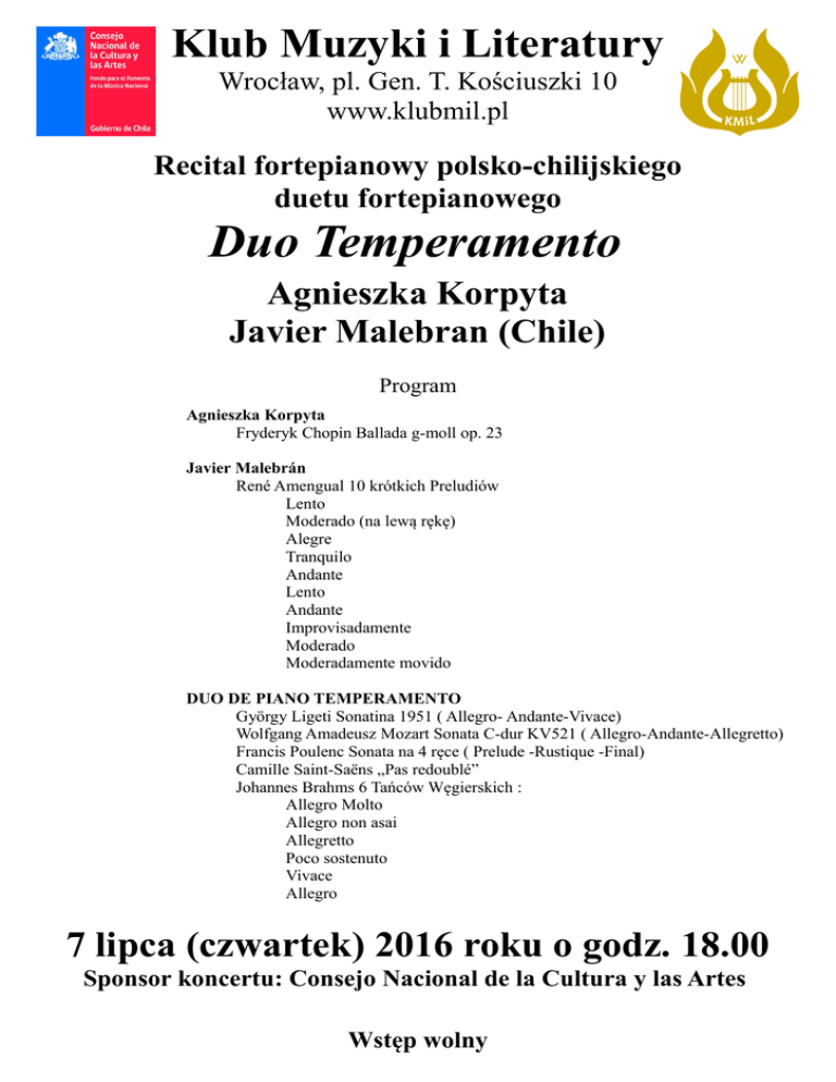Klub Muzyki i Literatury Wrocław, pl. Gen. T. Kościuszki 10 www.klubmil.pl Recital fortepianowy polsko-chilijskiego duetu fortepianowego Duo Temperamento Agnieszka Korpyta Javier Malebran (Chile) Program Agnieszka Korpyta Fryderyk Chopin Ballada g-moll op. 23 Javier Malebrán René Amengual 10 krótkich Preludiów Lento Moderado (na lewą rękę) Alegre Tranquilo Andante Lento Andante Improvisadamente Moderado Moderadamente movido DUO DE PIANO TEMPERAMENTO György Ligeti Sonatina 1951 ( Allegro- Andante-Vivace) Wolfgang Amadeusz Mozart Sonata C-dur KV521 ( Allegro-Andante-Allegretto) Francis Poulenc Sonata na 4 ręce ( Prelude -Rustique -Final) Camille Saint-Saëns „Pas redoublé” Johannes Brahms 6 Tańców Węgierskich : Allegro Molto Allegro non asai Allegretto Poco sostenuto Vivace Allegro 7 lipca (czwartek) 2016 roku o godz. 18.00 Sponsor koncertu: Consejo Nacional de la Cultura y las Artes Wstęp wolny