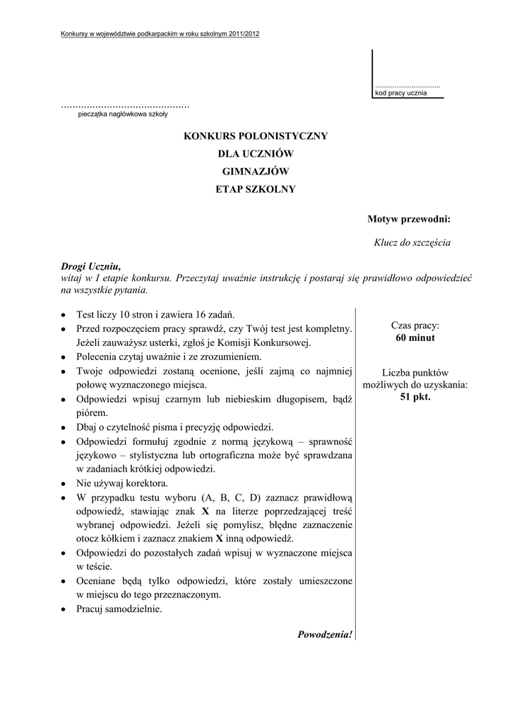 Konkursy w województwie podkarpackim w roku szkolnym 2011/2012 .................................. kod pracy ucznia ............................................. pieczątka nagłówkowa szkoły KONKURS POLONISTYCZNY DLA UCZNIÓW GIMNAZJÓW ETAP SZKOLNY Motyw przewodni: Klucz do szczęścia Drogi Uczniu, witaj w I etapie konkursu. Przeczytaj uważnie instrukcję i postaraj się prawidłowo odpowiedzieć na wszystkie pytania. Test liczy 10 stron i zawiera 16 zadań. Czas pracy: Przed rozpoczęciem pracy sprawdź, czy Twój test jest kompletny. 60 minut Jeżeli zauważysz usterki, zgłoś je Komisji Konkursowej. Polecenia czytaj uważnie i ze zrozumieniem. Twoje odpowiedzi zostaną ocenione, jeśli zajmą co najmniej Liczba punktów możliwych do uzyskania: połowę wyznaczonego miejsca. 51 pkt. Odpowiedzi wpisuj czarnym lub niebieskim długopisem, bądź piórem. Dbaj o czytelność pisma i precyzję odpowiedzi. Odpowiedzi formułuj zgodnie z normą językową – sprawność językowo – stylistyczna lub ortograficzna może być sprawdzana w zadaniach krótkiej odpowiedzi. Nie używaj korektora. W przypadku testu wyboru (A, B, C, D) zaznacz prawidłową odpowiedź, stawiając znak X na literze poprzedzającej treść wybranej odpowiedzi. Jeżeli się pomylisz, błędne zaznaczenie otocz kółkiem i zaznacz znakiem X inną odpowiedź. Odpowiedzi do pozostałych zadań wpisuj w wyznaczone miejsca w teście. Oceniane będą tylko odpowiedzi, które zostały umieszczone w miejscu do tego przeznaczonym. Pracuj samodzielnie. Powodzenia! Konkursy w województwie podkarpackim w roku szkolnym 2011/2012 Tekst I Było na dworze króla Marka czterech baronów, najbardziej zdradzieckich spomiędzy ludzi, nienawidzących Tristana srogą nienawiścią za jego męstwo i za tkliwą miłość, którą król dlań żywił. I mogę wam nawet powtórzyć ich imiona: Andret, Gwenelon, Gondoin i Denoalen; z tych diuk Andret był jak i Tristan siostrzeńcem króla. Wiedząc, iż król zamyślał postarzeć się bezdzietnie, aby przekazać ziemię Tristanowi, wzburzyli się w swej zawiści i za pomocą kłamstw podjudzili przeciw Tristanowi szlachtę Kornwalii. […] Przekonali większość baronów; wielu bowiem ludzi nie wie, iż tego, co jest w mocy czarnoksiężników, serce ludzkie może też dokonać siłą miłości i odwagi. Zaczęli tedy baronowie napierać na króla, aby pojął za żonę córkę królewską, która by dała mu dziedziców; jeśli odmówi, zamkną się (mówili) w obronnych zamkach, aby z nim toczyć wojnę. Król opierał się […]. Ale w końcu sam Tristan, któremu wstyd było cierpieć podejrzenie, że kocha wuja przez łakomstwo, zagroził, iż król ma się poddać woli baronów, inaczej opuści jego dwór i pójdzie służyć bogatemu królowi gaweńskiemu. Wówczas Marek naznaczył porę swym baronom – za czterdzieści dni przyrzekł objawić, co mniema. W oznaczonym dniu sam w swojej komnacie oczekiwał ich przybycia i myślał smutnie: „Gdzież znaleźć córkę króla tak daleką i niedostępną, abym mógł udać, ale udać tylko, iż pragnę jej za żonę?” W tej chwili przez okno otwarte na morze dwie jaskółki, które budowały gniazdo, wleciały swarząc się, po czym nagle przestraszone uciekły. Ale z dziobków ich wymknął się długi włos kobiecy, cieńszy niż nitka jedwabiu i błyszczący jak promień słońca. Marek podjąwszy go, kazał zawołać baronów i Tristana i rzekł: – Aby wygodzić wam, panowie, gotów jestem pojąć żonę, byleście chcieli wyszukać mi tę, którą wybrałem. – Zaiste chcemy, zacny panie; któraż to jest, którą wybrałeś? – Wybrałem tę, do której należy ten włos złocisty, i wiedzcie, że nie chcę żadnej innej. – I z jakich stron, zacny panie, pochodzi ów włos złocisty? Kto ci go przyniósł? Z jakiego kraju? – Pochodzi, panowie, od Pięknej o złotym warkoczu; dwie jaskółki mi go przyniosły i one wiedzą, z jakiego kraju. Baronowie zrozumieli, że zadrwiono z nich i że ich wyprowadzono w pole. Spoglądali na Tristana spode łba; podejrzewali, iż to on doradził tę sztukę. Ale Tristan przyjrzawszy się złotemu włosowi, przypomniał sobie Izold Jasnowłosą. Uśmiechnął się i tak przemówił: – Królu Marku, źle sobie poczynasz; czy nie widzisz, że posądzenia tych panów mnie hańbią? Ale na próżno umyśliłeś sobie to pośmiewisko; pójdę szukać Pięknej o złotym warkoczu. Wiedz, że szukanie to niebezpieczne i że trudniej mi będzie wrócić z jej kraju niż z wyspy, na której zabiłem Morhołta, ale na nowo chcę dla ciebie, miły wuju, ciało swoje i życie rzucić na los. Iżby twoi baronowie wiedzieli, że kocham cię szczerą i prawą miłością, daję wiarę swoją w zakład – albo zginę w tym przedsięwzięciu, albo przywiodę do tego zamku tyntagielskiego Królową o złotym warkoczu. J. Bedier, Dzieje Tristana i Izoldy, tłum. T. Boy- Żeleński, s. 16. Strona 2 z 10 Konkursy w województwie podkarpackim w roku szkolnym 2011/2012 Zad. 1. (0-3) Na podstawie tekstu I sformułuj trzy zasady obowiązującego w średniowieczu kodeksu rycerskiego. ………………………………………………………………………………………… ………………………………………………………………………………………… ………………………………………………………………………………………… Zad. 2. (0-1) Wypisz z tekstu zdanie, które można przypisać bezpośrednio narratorowi. ………………………………………………………………………………………………… ………………………………………………………………………………………………… Zad. 3. (0-3) Nazwij trzy różne funkcje narratora wynikające z jego usytuowania wobec świata przedstawionego. ……………………………………………………………………………………