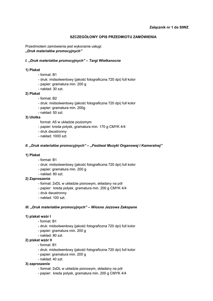 Załącznik nr 1 do SIWZ SZCZEGÓŁOWY OPIS PRZEDMIOTU ZAMÓWIENIA Przedmiotem zamówienia jest wykonanie usługi: „Druk materiałów promocyjnych” I. „Druk materiałów promocyjnych” – Targi Wielkanocne 1) Plakat - format: B1 - druk: midsolwentowy (jakość fotograficzna 720 dpi) full kolor - papier: gramatura min. 200 g - nakład: 30 szt. 2) Plakat - format: B2 - druk: midsolwentowy (jakość fotograficzna 720 dpi) full kolor - papier: gramatura min. 200g - nakład: 50 szt. 3) Ulotka format: A5 w układzie poziomym - papier: kreda połysk, gramatura min. 170 g CMYK 4/4 - druk dwustronny - nakład: 1000 szt. II. „Druk materiałów promocyjnych” – „Festiwal Muzyki Organowej i Kameralnej” 1) Plakat - format: B1 - druk: midsolwentowy (jakość fotograficzna 720 dpi) full kolor - papier: gramatura min. 200 g - nakład: 80 szt. 2) Zaproszenie - format: 2xDL w układzie pionowym, składany na pół - papier: kreda połysk, gramatura min. 200 g CMYK 4/4 - druk dwustronny - nakład: 100 szt. III. „Druk materiałów promocyjnych” – Wiosna Jazzowa Zakopane 1) plakat wzór I - format: B1 - druk: midsolwentowy (jakość fotograficzna 720 dpi) full kolor - papier: gramatura min. 200 g - nakład: 80 szt. 2) plakat wzór II - format: B1 - druk: midsolwentowy (jakość fotograficzna 720 dpi) full kolor - papier: gramatura min. 200 g - nakład: 40 szt. 3) zaproszenie - format: 2xDL w układzie pionowym, składany na pół - papier: kreda połysk, gramatura min. 200 g CMYK 4/4 - druk dwustronny - nakład: 100 szt. 4) bilety - wymiary: 150 mm szer. x 15 mm wys. - papier: kreda połysk, gramatura min. 200 g CMYK 4/4 - druk dwustronny - perforacja - nakład: 1000 szt. 5) Ulotka - format: A6 - papier: kreda połysk, gramatura min. 170 g CMYK 4/4 - druk dwustronny - nakład: 1000 szt. IV. „Druk materiałów promocyjnych” – Otwarcie sezonu letniego 1) Plakat - format: B1 - druk: midsolwentowy (jakość fotograficzna 720 dpi) full kolor - papier: gramatura min. 200 g - nakład: 50 szt. 2) Plakat - format: B2 - druk: midsolwentowy (jakość fotograficzna 720 dpi) full kolor - papier: gramatura min. 200g - nakład: 50 szt. 3) Zaproszenie - format: 2xDL w układzie pionowym, składany na pół - papier: kreda połysk, gramatura min. 200 g CMYK 4/4 - druk dwustronny - nakład: 100 szt. 4) Ulotka - format: 1xDL w układzie poziomym, - papier: kreda połysk, gramatura min. 170 g CMYK 4/4 - druk dwustronny - nakład: 1000 szt. V. „Druk materiałów promocyjnych” – ogólne 1) Mapa zimowa -Ulotka –mapka - format: A4 w układzie poziomym - papier: kreda połysk, gramatura min. 160 g CMYK 4/4 - druk dwustronny - klejone w układzie poziomym z krótszego boku po 100 szt.* - nakład: 3000 szt. *(Ulotki w celu lepszej ich dystrybucji mają być klejone (w celu ich łatwego wyrywania przez turystów), po lewym, krótszym boku. Ilość mapek w jednym bloku po 100 szt.) 2. Mapa letnia – ulotka - format: A3 - papier: kreda połysk, gramatura min. 160 g CMYK 4/4 - druk dwustronny - klejone w układzie poziomym z krótszego boku po 100 szt.* - nakład: 20000 szt. *(Ulotki w celu lepszej ich dystrybucji mają być klejone (w celu ich łatwego wyrywania przez turystów), po lewym, krótszym boku. Ilość mapek w jednym bloku po 100 szt.) 2 3.Folder - format: A5 w układzie pionowym - papier okładka: kreda lakierowana dwustronnie połysk, gramatura min: 250g CMYK 4/4 - papier środek: kreda połysk, gramatura min. 135 g CMYK 4/4 - Zszycie: zeszytowe płaskie dwie zszywki - ilość stron: okładka 6 strony, jedno (1) skrzydełko z tyłu folderu, środek 16 stron - nakład: wersja polska 6000 szt. - nakład: wersja angielska 3000 szt. - nakład: wersja niemiecka 2000 szt. - nakład: wersja francuska 2000 szt. - nakład: wersja hiszpańska 1000 szt. 4. Broszura – Wydarzenia w Zakopanem - format: A5 w układzie pionowym - papier okładka: kreda połysk, gramatura min: 170g CMYK 4/4 - papier środek: kreda połysk, gramatura min. 135 g CMYK 4/4 - Zszycie: zeszytowe płaskie dwie zszywki - ilość stron: okładka 4 strony, środek 8 stron - nakład: 3000 szt. 5.Broszura – „Galeria Gazduś” - format: 11 cm x 22 cm( po złożeniu) w układzie pionowym - papier okładka: kreda połysk, gramatura min: 170g CMYK 4/4 - papier środek: kreda połysk, gramatura min. 135 g CMYK 4/4 - Zszycie: zeszytowe płaskie dwie zszywki - ilość stron: okładka 4 strony, środek 8 stron - nakład: 3000 szt. 6. Wizytówki ( Galeria i Punkty Informacji Turystycznej) - format: 50x90 mm - papier: kreda połysk ,gramatura min. 300g CMYK 4/4 - druk dwustronny - nakład: 1000szt. 7. Wizytówki Biurowe - format: 50x90 mm - papier: kreda, gramatura min. 300g CMYK 4/4 - druk jednostronny - nakład: 3000szt. 8) Ulotka – szlaki tematyczne 4 wzory - format: A5 w układzie pionowym - papier: kreda połysk, gramatura min. 160 g CMYK 4/4 - druk dwustronny - nakład: 4000 szt. x 4 wzory w języku polskim - nakład: 4000 szt. x 4 wzory w języku angielskim - nakład: 2000 szt. x 4 wzory w języku niemieckim - nakład: 2000 szt. x 4 wzory w języku francuskim 3