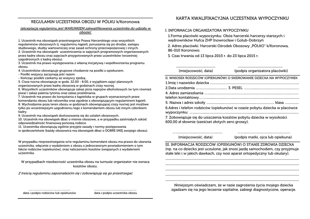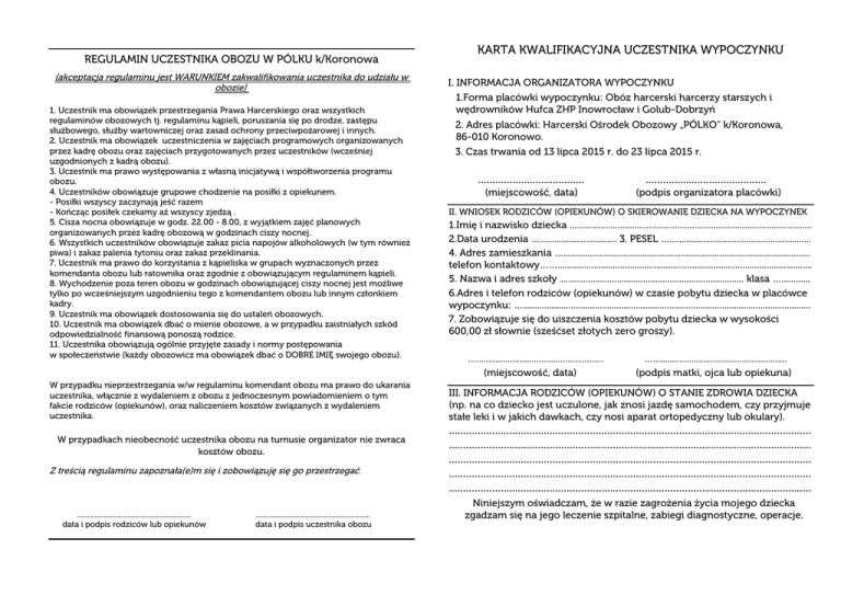 REGULAMIN UCZESTNIKA OBOZU W PÓLKU k/Koronowa (akceptacja regulaminu jest WARUNKIEM zakwalifikowania uczestnika do udziału w obozie) 1. Uczestnik ma obowiązek przestrzegania Prawa Harcerskiego oraz wszystkich regulaminów obozowych tj. regulaminu kąpieli, poruszania się po drodze, zastępu służbowego, służby wartowniczej oraz zasad ochrony przeciwpożarowej i innych. 2. Uczestnik ma obowiązek uczestniczenia w zajęciach programowych organizowanych przez kadrę obozu oraz zajęciach przygotowanych przez uczestników (wcześniej uzgodnionych z kadrą obozu). 3. Uczestnik ma prawo występowania z własną inicjatywą i współtworzenia programu obozu. 4. Uczestników obowiązuje grupowe chodzenie na posiłki z opiekunem. - Posiłki wszyscy zaczynają jeść razem - Kończąc posiłek czekamy aż wszyscy zjedzą . 5. Cisza nocna obowiązuje w godz. 22.00 - 8.00, z wyjątkiem zajęć planowych organizowanych przez kadrę obozową w godzinach ciszy nocnej. 6. Wszystkich uczestników obowiązuje zakaz picia napojów alkoholowych (w tym również piwa) i zakaz palenia tytoniu oraz zakaz przeklinania. 7. Uczestnik ma prawo do korzystania z kąpieliska w grupach wyznaczonych przez komendanta obozu lub ratownika oraz zgodnie z obowiązującym regulaminem kąpieli. 8. Wychodzenie poza teren obozu w godzinach obowiązującej ciszy nocnej jest możliwe tylko po wcześniejszym uzgodnieniu tego z komendantem obozu lub innym członkiem kadry. 9. Uczestnik ma obowiązek dostosowania się do ustaleń obozowych. 10. Uczestnik ma obowiązek dbać o mienie obozowe, a w przypadku zaistniałych szkód odpowiedzialność finansową ponoszą rodzice. 11. Uczestnika obowiązują ogólnie przyjęte zasady i normy postępowania w społeczeństwie (każdy obozowicz ma obowiązek dbać o DOBRE IMIĘ swojego obozu). W przypadku nieprzestrzegania w/w regulaminu komendant obozu ma prawo do ukarania uczestnika, włącznie z wydaleniem z obozu z jednoczesnym powiadomieniem o tym fakcie rodziców (opiekunów), oraz naliczeniem kosztów związanych z wydaleniem uczestnika. W przypadkach nieobecność uczestnika obozu na turnusie organizator nie zwraca kosztów obozu. Z treścią regulaminu zapoznała(e)m się i zobowiązuję się go przestrzegać. ........................................................... data i podpis rodziców lub opiekunów ............................................................ data i podpis uczestnika obozu KARTA KWALIFIKACYJNA UCZESTNIKA WYPOCZYNKU I. INFORMACJA ORGANIZATORA WYPOCZYNKU 1.Forma placówki wypoczynku: Obóz harcerski harcerzy starszych i wędrowników Hufca ZHP Inowrocław i Golub-Dobrzyń 2. Adres placówki: Harcerski Ośrodek Obozowy „PÓLKO” k/Koronowa, 86-010 Koronowo. 3. Czas trwania od 13 lipca 2015 r. do 23 lipca 2015 r. ..................................... .......................................... (miejscowość, data) (podpis organizatora placówki) II. WNIOSEK RODZICÓW (OPIEKUNÓW) O SKIEROWANIE DZIECKA NA WYPOCZYNEK 1.Imię i nazwisko dziecka ..................................................................................................... 2.Data urodzenia …................................ 3. PESEL …........................................................... 4. Adres zamieszkania …....................................................................................................... telefon kontaktowy…….......................................................................................................... 5. Nazwa i adres szkoły …......................................................................... klasa …............ 6.Adres i telefon rodziców (opiekunów) w czasie pobytu dziecka w placówce wypoczynku: …........................................................................................................................ 7. Zobowiązuje się do uiszczenia kosztów pobytu dziecka w wysokości 600,00 zł słownie (sześćset złotych zero groszy). …..................................................... (miejscowość, data) …........................................................ (podpis matki, ojca lub opiekuna) III. INFORMACJA RODZICÓW (OPIEKUNÓW) O STANIE ZDROWIA DZIECKA (np. na co dziecko jest uczulone, jak znosi jazdę samochodem, czy przyjmuje stałe leki i w jakich dawkach, czy nosi aparat ortopedyczny lub okulary). .............................................................................................................................. .............................................................................................................................. .............................................................................................................................. .............................................................................................................................. .............................................................................................................................. Niniejszym oświadczam, że w razie zagrożenia życia mojego dziecka zgadzam się na jego leczenie szpitalne, zabiegi diagnostyczne, operacje. STWIERDZAM, ŻE PODAŁAM (EM) WSZYSTKIE ZNANE MI INFORMACJE O DZIECKU, KTÓRE MOGĄ POMÓC W ZAPEWNIENIU WŁAŚCIWEJ OPIEKI W CZASIE POBYTU DZIECKA W PLACÓWCE WYPOCZYNKU. ....................................... (data) ...................................................... (podpis matki, ojca lub opiekuna) IV. INFORMACJA PIELĘGNIARKI O SZCZEPIENIACH Szczepienia ochronne (podać rok): Tężec ........................, błonica ..........................., dur ................................, inne .................................................................................................... ................................... (data) ................................................ (podpis pielęgniarki/lekarza) V. INFORMACJA WYCHOWAWCY KLASY O DZIECKU ( wypełnia rodzicopiekun lub wychowawca) .........................................