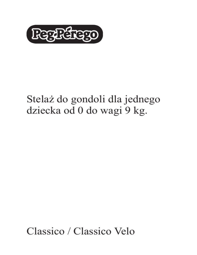 Stela¿ do gondoli dla jednego dziecka od 0 do wagi 9 kg. Classico / Classico Velo Dziêkujemy za wybór produktu Peg Perego. UWAGA! WA¯NE: przeczytaj uwa¿nie poni¿sz¹ instrukcjê i zachowaj j¹ na przysz³oœæ. Przestrzeganie zawartych w niej poleceñ i wskazówek zapobiegnie powstaniu niebezpiecznych dla dziecka sytuacji. - Produkt jest przystosowany do przewo¿enia w gondoli jednego dziecka. - Nie stosuj go do przewo¿enia wiêkszej iloœci dzieci ni¿ podaje producent. - W stela¿, dziêki zastosowaniu systemu ganciomatic, mo¿na wpi¹æ gondolê Primonido Evolution (Culla Auto lub Young Auto) lub fotelik samochodowy Primo Viaggio. - Przed rozpoczêciem u¿ytkowania upewnij siê, ¿e produkt w którym przewo¿one jest dziecko, zosta³ prawid³owo wpiêty w stela¿. - Obs³ug¹ i monta¿em mog¹ siê zajmowaæ wy³¹cznie osoby doros³e. - Nie u¿ywaj stela¿a jeœli zagubieniu lub uszkodzeniu uleg³ jakiœ jego element. - Nigdy nie pozostawiaj dziecka bez opieki. - Nie wk³adaj palców w ruchome mechanizmy stela¿a. - Nie wieszaj ¿adnych przedmiotów na r¹czce stela¿a ani w innych miejscach - mog¹ one spowodowaæ utratê jego stabilnoœci. W torbie pielêgnacyjnej nie przewoŸ przedmiotów o ³¹cznej wadze przekraczaj¹cej 1 kg, a w koszu – 5 kg. - Nie u¿ywaj stela¿a na schodach, stopniach oraz w pobli¿u innych niebezpiecznych przedmiotów. - U¿ywanie akcesoriów nie zatwierdzonych przez producenta mo¿e byæ niebezpieczne. - Produktu nie mo¿na u¿ywaæ podczas jazdy na rolkach lub biegania. - Stela¿ z wpiêt¹ gondol¹ lub fotelikiem nie jest przystosowany do usypiania dziecka poprzez ko³ysanie nim na boki - czynnoœæ ta mo¿e spowodowaæ mechaniczne uszkodzenie konstrukcji stela¿a! - ZAWSZE ZA£¥CZAJ HAMULEC PODCZAS POSTOJU WÓZKA ORAZ PODCZAS WPINANIA / WYPINANIA ZE STELA¯Y PRODUKTÓW S£U¯¥CYCH DO PRZEWO¯ENIA DZIECKA. RODZAJE ZASTOSOWANYCH KÓ£ (w zale¿noœci od modelu i kolekcji ): - stela¿ classico – ko³a piankowe; - stela¿ classico velo – ko³a pompowane. INSTRUKCJA OBS£UGI MONTA¯ R¥CZKI 1. U¿ywaj¹c œrubokrêta, wykrêæ z r¹czki znajduj¹ce siê po obu jej bokach œrubki i zaœlepki. 2. Na³ó¿ r¹czkê na koñcówki wyjêtego z kartonu ale jeszcze nie roz³o¿onego stela¿a. 3. Zgodnie z rysunkiem, na³ó¿ zaœlepki na otwory znajduj¹ce siê po zewnêtrznej stronie r¹czki, a œrubki po wewnêtrznej stronie i wkrêæ je przy pomocy œrubokrêta. MONTA¯ KÓ£ 4. Ze z³o¿onego stela¿a usuñ ochraniacze znajduj¹ce siê na koñcówkach osiek. 5. Najpierw za³ó¿ ko³a na osie znajduj¹ce siê po tej stronie z³o¿onego stela¿a co r¹czka nak³adaj ko³a na osie do momentu a¿ zaskocz¹ blokady (us³yszysz „klikniêcie”). SprawdŸ, czy ko³a zosta³y poprawnie za³o¿one. 6. Nastêpnie za³ó¿ ko³a znajduj¹ce siê po przeciwnej stronie z³o¿onego stela¿a ni¿ r¹czka. Na³ó¿ ko³a na osie i dociskaj do momentu a¿ zaskocz¹ blokady (us³yszysz „klikniêcie”). Upewnij siê, ¿e ko³a zasta³y prawid³owo na³o¿one. HAMULEC 7. Aby za³¹czyæ hamulec, opuœæ nog¹ dŸwigniê znajduj¹c¹ siê miêdzy tylnymi ko³ami. Aby uwolniæ hamulec, unieœ dŸwigniê. ROZK£ADANIE STELA¯A Aby u³atwiæ sobie wykonanie tej czynnoœci, zalecamy opuœciæ dŸwigniê hamulca. 8. Aby roz³o¿yæ stela¿, przesuñ do wewn¹trz (zgodnie z rysunkiem) 2 blokady zapobiegaj¹ce samoczynnemu roz³o¿eniu siê stela¿a. 9. Unieœ r¹czkê i przesuwaj j¹ w kierunku pokazanym na rysunku do momentu a¿ zadzia³aj¹ blokady (us³yszysz „klikniêcie”). 10. Upewnij siê, ¿e stela¿ zosta³ roz³o¿ony prawid³owo - pokazana na rysunku blokada musi wygl¹daæ jak na rys. A. Je¿eli po³o¿enie blokady (rys. B) sugeruje, ¿e stela¿ nie zosta³ roz³o¿ony prawid³owo, dociskaj obur¹cz r¹czkê a¿ wskoczy na swoje miejsce. REGULACJA WYSOKOŒCI R¥CZKI 11. Aby zmieniæ po³o¿enie r¹czki, wciskaj jednoczeœnie 2 przyciski znajduj¹ce siê po obu jej stronach i zablokuj j¹ w wybranej pozycji. ZDEJMOWANIE KÓ£ 12. Aby zdj¹æ ko³o, wciskaj przycisk znajduj¹cy siê w jego centralnej czêœci usuwaj¹c jednoczeœnie ko³o z osi. SK£ADANIE STELA¯A 13. Aby z³o¿yæ stela¿, unieœ jednoczeœnie 2 dŸwignie znajduj¹ce siê pod r¹czk¹. 14. Unieœ blokadê bezpieczeñstwa. 15. Przesuwaj r¹czkê w kierunku pokazanym na rysunku go momentu a¿ zostanie ona uchwycona przez blokady. 16. Rysunek pokazuje z³o¿ony stela¿. SYSTEM GANCIOMATIC 17. Jest to praktycznym system pozwalaj¹cym na prosty i szybki monta¿ na stela¿u classico / classico velo produktów s³u¿¹cych do przewo¿enia dziecka: gondoli Primonido Evolution (Culla Auto i Young Auto), gondoli Navetta XL lub fotelika samochodowego Primo Viaggio Tri-Fix. Jedyne, co nale¿y zrobiæ to umieœciæ któryœ z wymienionych powy¿ej produktów na bazie Ganciomatic stela¿a i wciskaæ go obur¹cz do momentu a¿ zadzia³aj¹ blokady (us³yszysz „klikniêcie”). Podczas wpinania / wypinania produktów ze stela¿a, hamulec musi byæ za³¹czony. Aby poznaæ procedury wypinania powy¿szych produktów ze stela¿a, zapoznaj siê z ich instrukcjami obs³ugi. CZYSZCZENIE I KONSERWACJA - Zawsze utrzymuj wszystkie ruchome mechanizmy w czystoœci, regularnie usuwaj z nich kurz i piach, w razie koniecznoœci przesmaruj je lekkim olejem lub silikonem w spray’u. - Wycieraj do sucha wszystkie metalowe elementy by zapobiec pojawieniu siê rdzawych nalotów. - Regularnie czyœæ plastikowe elementy wilgotn¹ œciereczk¹, nie u¿ywaj rozpuszczalników ani podobnych œrodków. - Regularnie usuwaj z mechanizmów kó³ piach i kurz. - Chroñ produkt przed dzia³aniem czynników atmosferycznych: wod¹, deszczem i œniegiem. D³ugotrwa³e oddzia³ywanie silnych promieni s³onecznych mo¿e spowodowaæ utratê intensywnoœci kolorów niektórych elementów. - Przechowuj wózek w suchym pomieszczeniu. Firma Peg Perego posiada certyfikat ISO 9001 Peg Perego zastrzega sobie prawo do wprowadzania zmian w of