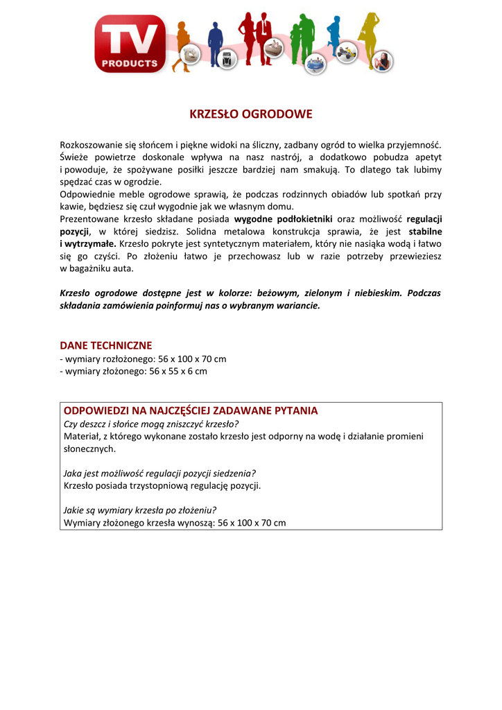 KRZESŁO OGRODOWE Rozkoszowanie się słońcem i piękne widoki na śliczny, zadbany ogród to wielka przyjemność. Świeże powietrze doskonale wpływa na nasz nastrój, a dodatkowo pobudza apetyt i powoduje, że spożywane posiłki jeszcze bardziej nam smakują. To dlatego tak lubimy spędzać czas w ogrodzie. Odpowiednie meble ogrodowe sprawią, że podczas rodzinnych obiadów lub spotkań przy kawie, będziesz się czuł wygodnie jak we własnym domu. Prezentowane krzesło składane posiada wygodne podłokietniki oraz możliwość regulacji pozycji, w której siedzisz. Solidna metalowa konstrukcja sprawia, że jest stabilne i wytrzymałe. Krzesło pokryte jest syntetycznym materiałem, który nie nasiąka wodą i łatwo się go czyści. Po złożeniu łatwo je przechowasz lub w razie potrzeby przewieziesz w bagażniku auta. Krzesło ogrodowe dostępne jest w kolorze: beżowym, zielonym i niebieskim. Podczas składania zamówienia poinformuj nas o wybranym wariancie. DANE TECHNICZNE - wymiary rozłożonego: 56 x 100 x 70 cm - wymiary złożonego: 56 x 55 x 6 cm ODPOWIEDZI NA NAJCZĘŚCIEJ ZADAWANE PYTANIA Czy deszcz i słońce mogą zniszczyć krzesło? Materiał, z którego wykonane zostało krzesło jest odporny na wodę i działanie promieni słonecznych. Jaka jest możliwość regulacji pozycji siedzenia? Krzesło posiada trzystopniową regulację pozycji. Jakie są wymiary krzesła po złożeniu? Wymiary złożonego krzesła wynoszą: 56 x 100 x 70 cm