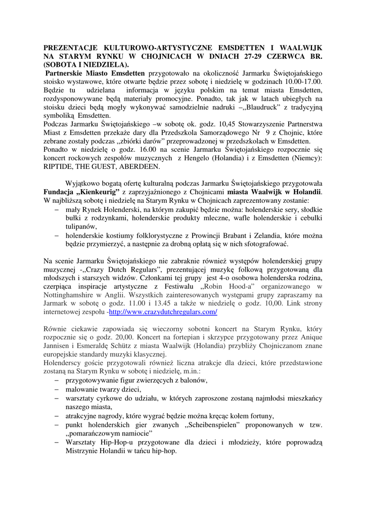 PREZENTACJE KULTUROWO-ARTYSTYCZNE EMSDETTEN I WAALWIJK NA STARYM RYNKU W CHOJNICACH W DNIACH 27-29 CZERWCA BR. (SOBOTA I NIEDZIELA). Partnerskie Miasto Emsdetten przygotowało na okoliczność Jarmarku Świętojańskiego stoisko wystawowe, które otwarte będzie przez sobotę i niedzielę w godzinach 10.00-17.00. Będzie tu udzielana informacja w języku polskim na temat miasta Emsdetten, rozdysponowywane będą materiały promocyjne. Ponadto, tak jak w latach ubiegłych na stoisku dzieci będą mogły wykonywać samodzielnie nadruki –,,Blaudruck” z tradycyjną symboliką Emsdetten. Podczas Jarmarku Świętojańskiego –w sobotę ok. godz. 10,45 Stowarzyszenie Partnerstwa Miast z Emsdetten przekaże dary dla Przedszkola Samorządowego Nr 9 z Chojnic, które zebrane zostały podczas ,,zbiórki darów” przeprowadzonej w przedszkolach w Emsdetten. Ponadto w niedzielę o godz. 16.00 na scenie Jarmarku Świętojańskiego rozpocznie się koncert rockowych zespołów muzycznych z Hengelo (Holandia) i z Emsdetten (Niemcy): RIPTIDE, THE GUEST, ABERDEEN. Wyjątkowo bogatą ofertę kulturalną podczas Jarmarku Świętojańskiego przygotowała Fundacja ,,Kienkeurig” z zaprzyjaźnionego z Chojnicami miasta Waalwijk w Holandii. W najbliższą sobotę i niedzielę na Starym Rynku w Chojnicach zaprezentowany zostanie: − mały Rynek Holenderski, na którym zakupić będzie można: holenderskie sery, słodkie bułki z rodzynkami, holenderskie produkty mleczne, wafle holenderskie i cebulki tulipanów, − holenderskie kostiumy folklorystyczne z Prowincji Brabant i Zelandia, które można będzie przymierzyć, a następnie za drobną opłatą się w nich sfotografować. Na scenie Jarmarku Świętojańskiego nie zabraknie również występów holenderskiej grupy muzycznej -,,Crazy Dutch Regulars”, prezentującej muzykę folkową przygotowaną dla młodszych i starszych widzów. Członkami tej grupy jest 4-o osobowa holenderska rodzina, czerpiąca inspiracje artystyczne z Festiwalu ,,Robin Hood-a” organizowanego w Nottinghamshire w Anglii. Wszystkich zainteresowanych występami grupy zapraszamy na Jarmark w sobotę o godz. 11.00 i 13.45 a także w niedzielę o godz. 10,00. Link strony internetowej zespołu -http://www.crazydutchregulars.com/ Równie ciekawie zapowiada się wieczorny sobotni koncert na Starym Rynku, który rozpocznie się o godz. 20,00. Koncert na fortepian i skrzypce przygotowany przez Anique Jannisen i Esmeraldę Schütz z miasta Waalwijk (Holandia) przybliży Chojniczanom znane europejskie standardy muzyki klasycznej. Holenderscy goście przygotowali również liczna atrakcje dla dzieci, które przedstawione zostaną na Starym Rynku w sobotę i niedzielę, m.in.: − przygotowywanie figur zwierzęcych z balonów, − malowanie twarzy dzieci, − warsztaty cyrkowe do udziału, w których zaproszone zostaną najmłodsi mieszkańcy naszego miasta, − atrakcyjne nagrody, które wygrać będzie można kręcąc kołem fortuny, − punkt holenderskich gier zwanych ,,Scheibenspielen” proponowanych w tzw. ,,pomarańczowym namiocie” − Warsztaty Hip-Hop-u przygotowane dla dzieci i młodzieży, które poprowadzą Mistrzynie Holandii w tańcu hip-hop.
