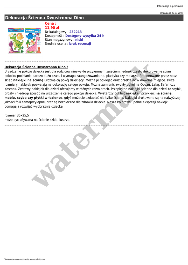 Informacje o produkcie Utworzono 02-03-2017 Dekoracja Ścienna Dwustronna Dino Cena : 11,90 zł Nr katalogowy : 232213 Dostępność : Dostępny-wysyłka 24 h Stan magazynowy : niski Średnia ocena : brak recenzji er m ar k Dekoracja Ścienna Dwustronna Dino ! Urządzanie pokoju dziecka jest dla rodziców niezwykle przyjemnym zajęciem, jednak często dekorowanie ścian pokoiku pochłania bardzo dużo czasu i wymaga zaangażowania np. plastyka czy malarza. Proponowane przez nasz sklep naklejki na ścianę urozmaicą pokój dziecięcy. Można je odklejać oraz przeklejać w dowolne miejsce. Duże rozmiary naklejek pozwalają na dekorację całego pokoju. Można zamienić zwykły pokój na Ocean, Łąkę, Safari czy Kosmos. Zestawy naklejek dla dzieci oferujemy w różnych rozmiarach. Przepiękne naklejki ścienne dla dzieci to szybki, prosty i niedrogi sposób na urządzenie całego pokoju dziecka. Wystarczy odkleić naklejkę i przykleić na ścianę, meble, szybę czy płytki w łazience, gdyż możecie ozdabiać nie tylko ściany. Naklejki drukowane są na najwyższej jakości folii samoprzylepnej oraz są bezpieczne dla zdrowia dziecka. Nasze kolorowe i pełne ekspresji naklejki pomagają rozwijać wyobraźnie dziecka w at rozmiar 35x25,5 może byc używana na ścianie szkle, lustrze. Wygenerowano w programie www.oscGold.com