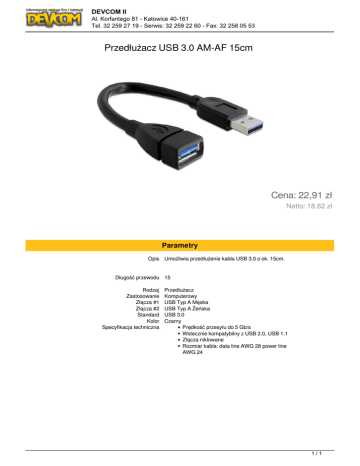 DEVCOM II Al. Korfantego 81 - Katowice 40-161 Tel. 32 259 27 19 - Serwis: 32 259 22 60 - Fax: 32 258 05 53 Przedłużacz USB 3.0 AM-AF 15cm Cena: 22,91 zł Netto: 18,62 zł Parametry Opis Umożliwia przedłużenie kabla USB 3.0 o ok. 15cm. Długość przewodu 15 Rodzaj Zastosowanie Złącza #1 Złącza #2 Standard Kolor Specyfikacja techniczna Przedłużacz Komputerowy USB Typ A Męska USB Typ A Żeńska USB 3.0 Czarny Prędkość przesyłu do 5 Gb/s Wstecznie kompatybilny z USB 2.0, USB 1.1 Złącza niklowane Rozmiar kabla: data line AWG 28 power line AWG 24 1/1 Powered by TCPDF (www.tcpdf.org)