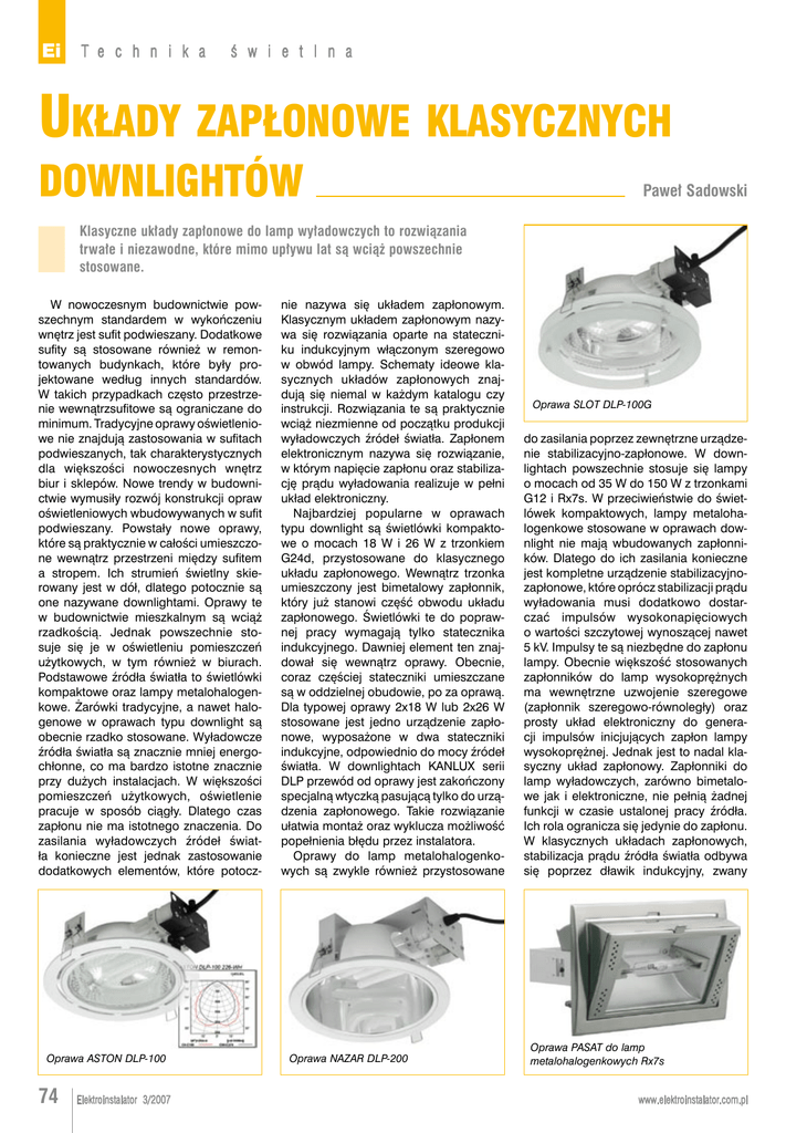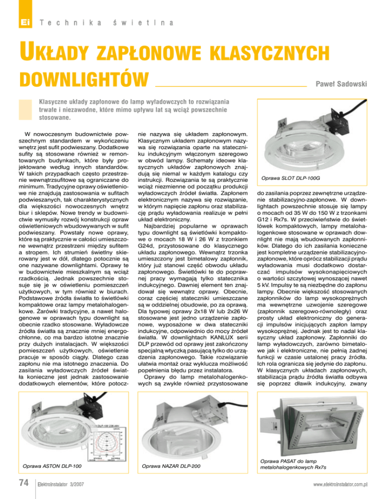 Ei T e c h n i k a ś w i e t l n a Układy zapłonowe klasycznych downlightów Paweł Sadowski Klasyczne układy zapłonowe do lamp wyładowczych to rozwiązania trwałe i niezawodne, które mimo upływu lat są wciąż powszechnie stosowane. W nowoczesnym budownictwie powszechnym standardem w wykończeniu wnętrz jest sufit podwieszany. Dodatkowe sufity są stosowane również w remontowanych budynkach, które były projektowane według innych standardów. W takich przypadkach często przestrzenie wewnątrzsufitowe są ograniczane do minimum. Tradycyjne oprawy oświetleniowe nie znajdują zastosowania w sufitach podwieszanych, tak charakterystycznych dla większości nowoczesnych wnętrz biur i sklepów. Nowe trendy w budownictwie wymusiły rozwój konstrukcji opraw oświetleniowych wbudowywanych w sufit podwieszany. Powstały nowe oprawy, które są praktycznie w całości umieszczone wewnątrz przestrzeni między sufitem a stropem. Ich strumień świetlny skierowany jest w dół, dlatego potocznie są one nazywane downlightami. Oprawy te w budownictwie mieszkalnym są wciąż rzadkością. Jednak powszechnie stosuje się je w oświetleniu pomieszczeń użytkowych, w tym również w biurach. Podstawowe źródła światła to świetlówki kompaktowe oraz lampy metalohalogenkowe. Żarówki tradycyjne, a nawet halogenowe w oprawach typu downlight są obecnie rzadko stosowane. Wyładowcze źródła światła są znacznie mniej energochłonne, co ma bardzo istotne znacznie przy dużych instalacjach. W większości pomieszczeń użytkowych, oświetlenie pracuje w sposób ciągły. Dlatego czas zapłonu nie ma istotnego znaczenia. Do zasilania wyładowczych źródeł światła konieczne jest jednak zastosowanie dodatkowych elementów, które potocz- Oprawa ASTON DLP-100 74 Elektroinstalator 3/2007 nie nazywa się układem zapłonowym. Klasycznym układem zapłonowym nazywa się rozwiązania oparte na stateczniku indukcyjnym włączonym szeregowo w obwód lampy. Schematy ideowe klasycznych układów zapłonowych znajdują się niemal w każdym katalogu czy instrukcji. Rozwiązania te są praktycznie wciąż niezmienne od początku produkcji wyładowczych źródeł światła. Zapłonem elektronicznym nazywa się rozwiązanie, w którym napięcie zapłonu oraz stabilizację prądu wyładowania realizuje w pełni układ elektroniczny. Najbardziej popularne w oprawach typu downlight są świetlówki kompaktowe o mocach 18 W i 26 W z trzonkiem G24d, przystosowane do klasycznego układu zapłonowego. Wewnątrz trzonka umieszczony jest bimetalowy zapłonnik, który już stanowi część obwodu układu zapłonowego. Świetlówki te do poprawnej pracy wymagają tylko statecznika indukcyjnego. Dawniej element ten znajdował się wewnątrz oprawy. Obecnie, coraz częściej stateczniki umieszczane są w oddzielnej obudowie, po za oprawą. Dla typowej oprawy 2x18 W lub 2x26 W stosowane jest jedno urządzenie zapłonowe, wyposażone w dwa stateczniki indukcyjne, odpowiednio do mocy źródeł światła. W downlightach KANLUX serii DLP przewód od oprawy jest zakończony specjalną wtyczką pasującą tylko do urządzenia zapłonowego. Takie rozwiązanie ułatwia montaż oraz wyklucza możliwość popełnienia błędu przez instalatora. Oprawy do lamp metalohalogenkowych są zwykle również przystosowane Oprawa NAZAR DLP-200 Oprawa SLOT DLP-100G do zasilania poprzez zewnętrzne urządzenie stabilizacyjno-zapłonowe. W downlightach powszechnie stosuje się lampy o mocach od 35 W do 150 W z trzonkami G12 i Rx7s. W przeciwieństwie do świetlówek kompaktowych, lampy metalohalogenkowe stosowane w oprawach downlight nie mają wbudowanych zapłonników. Dlatego do ich zasilania konieczne jest kompletne urządzenie stabilizacyjnozapłonowe, które oprócz stabilizacji prądu wyładowania musi dodatkowo dostarczać impulsów wysokonapięciowych o wartości szczytowej wynoszącej nawet 5 kV. Impulsy te są niezbędne do zapłonu lampy. Obecnie większość stosowanych zapłonników do lamp wysokoprężnych ma wewnętrzne uzwojenie szeregowe (zapłonnik szeregowo-równoległy) oraz prosty układ elektroniczny do generacji impulsów inicjujących zapłon lampy wysokoprężnej. Jednak jest to nadal klasyczny układ zapłonowy. Zapłonniki do lamp wyładowczych, zarówno bimetalowe jak i elektroniczne, nie pełnią żadnej funkcji w czasie ustalonej pracy źródła. Ich rola ogranicza się jedynie do zapłonu. W klasycznych układach zapłonowych, stabilizacja prądu źródła światła odbywa się poprzez dławik indukcyjny, zwany Oprawa PASAT do lamp metalohalogenkowych Rx7s www.elektroinstalator.com.pl Ei T e c h n i k a ś w i e t l n a Urządzenie stabilizacyjno-zapłonowe GB-2x26 W do świetlówek kompaktowych G24d 26 W potocznie statecznikiem. Podstawowym jego parametrem jest impedancja. Od niej zależy prąd pracy źródła światła, który z kolei jest jego najważniejszym parametrem elektrycznym. Markowe stateczniki ustalają prąd wyładowania lampy na właściwym dla niej poziomie, co gwarantuje uzyskanie znamionowych parametrów świetlnych i trwałości źródła światła. W tanich układach zapłonowych często rdzeń magnetyczny statecznika wykonany jest z blach ferromagnetycz- Ei W a r t o nych o bardzo niskiej jakości i ulega nasyceniu. To powoduje wzrost strat w rdzeniu i najczęściej prowadzi do niebezpiecznego przegrzewania się statecznika. Prąd pobierany z sieci jest wówczas silnie odkształcony, głównie przez 3 harmoniczną. Gdy takich układów zapłonowych jest w budynku wiele, mogą one doprowadzić do szeregu zakłóceń w funkcjonowaniu instalacji elektrycznej oraz zasilanych z niej urządzeń. Stateczniki indukcyjne układów zapłonowych powinny być zabezpieczone przed uszkodzeniem w przypadku przeciążenia spowodowanego przez źródło światła pracujące w czasie zbliżonym do końca jego trwałości. Najczęściej stosuje się wbudowane zabezpieczenie termiczne statecznika l