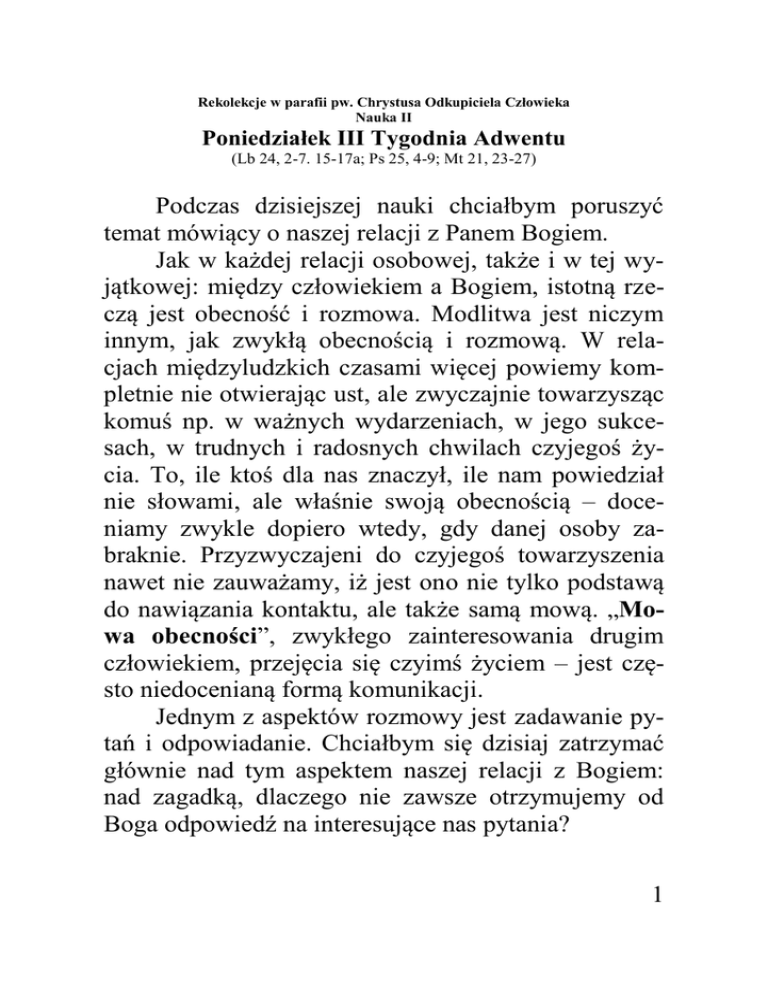 Rekolekcje w parafii pw. Chrystusa Odkupiciela Człowieka Nauka II Poniedziałek III Tygodnia Adwentu (Lb 24, 2-7. 15-17a; Ps 25, 4-9; Mt 21, 23-27) Podczas dzisiejszej nauki chciałbym poruszyć temat mówiący o naszej relacji z Panem Bogiem. Jak w każdej relacji osobowej, także i w tej wyjątkowej: między człowiekiem a Bogiem, istotną rzeczą jest obecność i rozmowa. Modlitwa jest niczym innym, jak zwykłą obecnością i rozmową. W relacjach międzyludzkich czasami więcej powiemy kompletnie nie otwierając ust, ale zwyczajnie towarzysząc komuś np. w ważnych wydarzeniach, w jego sukcesach, w trudnych i radosnych chwilach czyjegoś życia. To, ile ktoś dla nas znaczył, ile nam powiedział nie słowami, ale właśnie swoją obecnością – doceniamy zwykle dopiero wtedy, gdy danej osoby zabraknie. Przyzwyczajeni do czyjegoś towarzyszenia nawet nie zauważamy, iż jest ono nie tylko podstawą do nawiązania kontaktu, ale także samą mową. „Mowa obecności”, zwykłego zainteresowania drugim człowiekiem, przejęcia się czyimś życiem – jest często niedocenianą formą komunikacji. Jednym z aspektów rozmowy jest zadawanie pytań i odpowiadanie. Chciałbym się dzisiaj zatrzymać głównie nad tym aspektem naszej relacji z Bogiem: nad zagadką, dlaczego nie zawsze otrzymujemy od Boga odpowiedź na interesujące nas pytania? 1 Niestety nierzadko sami czynimy odpowiedź Bożą niemożliwą. Zachowujemy się bowiem jak młodzież podczas katechezy, która zadaje księdzu pytanie i odwraca się do niego plecami, natychmiast podejmując ożywioną dyskusję ze swoim kolegą z tylnej ławki. Nigdy nie potrafiłem odpowiadać na pytania ludziom, którzy nie chcieli słyszeć odpowiedzi. Ale przecież często, w ten sam sposób, zachowujemy się wobec Boga. Stawiamy Mu ważne pytania, nierzadko pytania trudne, a następnie, w sposób obiektywnie niezrozumiały – w jakimś totalnym braku poszanowania dla swego Rozmówcy – w ogóle nie jesteśmy zainteresowani udzielaną nam odpowiedzią. Czy Bóg nie odpowiada? A może to ja Go nie słucham? Może zwyczajnie brakuje mi dyspozycji do wysłuchania Bożej odpowiedzi? Ten problem bardzo dobitnie ukazuje nam sytuacja z dzisiejszej ewangelii. Arcykapłani i starsi z ludu zadają Jezusowi pytanie, ale Jezus warunkuje swoją odpowiedź odpowiednią dyspozycją pytających. Oczekuje od nich oczyszczenia umysłu z gotowych odpowiedzi, z pokrętnego myślenia, z przeintelektualizowania. Często inteligencja płata nam bowiem figle. Niby pytamy o coś Pana Boga, ale jednocześnie mamy gotowych kilka odpowiedzi, jakby każąc Bogu wybrać jedna z nich, a nie dopuszczając w ogóle do głowy z goła innego rozwiązania. Ta zarozumiałość z naszej strony blokuje szczery dialog. Najzwyczajniej 2 w świecie Bożą odpowiedź uniemożliwia brak zwykłej dyspozycji do modlitwy. Bóg mówi przez Pismo Święte. Jest to odwieczne i ponadczasowe słowo skierowane do każdego człowieka, mimo iż wypowiedziane w konkretnym momencie dziejów danego narodu. Ale Bóg mówi także przez codzienne wydarzenia, przez drugiego człowieka. Mówi w końcu bezpośrednio do każdego z nas w naszym sercu. By usłyszeć ten duchowy głos, najpierw musimy oczyścić się z podsuwanych Bogu naszych podpowiedzi. Musimy nasłuchiwać, być otwarci, w gotowości na usłyszenie rzeczy nawet zaskakującej. Gdy ta myśl przyjdzie, to gwarantuję, że nie będziemy mieć wątpliwości, skąd ona pochodzi. Odpowiedź Boga poznać od razu po znamionach prawdy i pokoju. Jednak, żeby ją usłyszeć i właściwie rozeznać – musimy być w odpowiedniej dyspozycji! Bardzo podobna sytuacja ma miejsce podczas spowiedzi, z czego niezmiernie mało ludzi zdaje sobie sprawę. Otóż w spowiedzi tyle zostanie uzdrowione, ile dobrowolnie zostanie odsłonięte przez penitenta. Zupełnie jak u lekarza. Nie wystarczy powiedzieć, że mnie boli, ale trzeba wskazać miejsce: gdzie boli, z jaką częstotliwością ból się powtarza. Często lekarz zleca badania specjalistyczne, dopytuje, powątpiewa, konsultuje – wiele czyni, zanim postawi diagnozę i rozpocznie leczenie. Tymczasem penitent, czyli ten który się spowiada, nierzadko przychodzi do spowiedzi i mówi bardzo 3 ogólnie: zgrzeszyłem. Następnie poda jakąś kategorię grzechu, typu: ukradłem albo szkodziłem zdrowiu, nie mówiąc szczegółów, nie podając liczby w przypadku ciężkich przewinień. Często coś zabajeruje, by nie nazwać rzeczy po imieniu, schowa jakieś fakty przed księdzem. Ale trzeba z całą mocą podkreślić: gdy po takiej spowiedzi nastąpi rozgrzeszenie, ono zwyczajnie nie zadziała. Nie będą odpuszczone grzechy człowiekowi, który kłamie poprzez zatajenie, lub zawoalowanie grzechu! Więcej! W takiej sytuacji ten człowiek popełnia dodatkowo kolejny grzech świętokradztwa, czyli znieważenia sakramentu świętego poprzez swą nieszczerą postawę. Spowiedź święta, to nie czary mary! To nie rytuał magiczny. Kapłan nie wie wszystkiego, ale ma ogromną władzę odpuszczania grzechów. Odpuści tylko to i dokładnie to, co mu grzesznik na spowiedzi wyjawi. Gdy ktoś schowa ciężkie grzechy za parawanem ogólnika, za zasłoną jakiegoś eufemizmu, wtedy ten grzech nie tylko nie będzie odpuszczony, ale dodatkowo spowiedź będzie nieważna i świętokradcza. Mimo, iż penitent po uczynieniu znaku Krzyża usłyszy upragnione słowa: Twoje grzechy są ci odpuszczone idź w pokoju, niech jednak wie, że zatajenie powoduje niezaistnienie rozgrzeszenia. Z takim nastawieniem, z brakiem dyspozycji, lepiej do spowiedzi nie iść w ogóle. Niestety wcale nie są to rzadkie sytuacje, gdy penitentowi brakuje zwykłej dyspozycji do spowiedzi. Księża kierując się np. delikatnością w sprawach in4 tymnych – nie dopytują szczegółów i spowiadający się myśli, iż mu się upiekło, bo nie musiał powiedzieć tej wstydliwej rzeczy. Myli się. Ksiądz powinien dopytać, ale nie robi t
