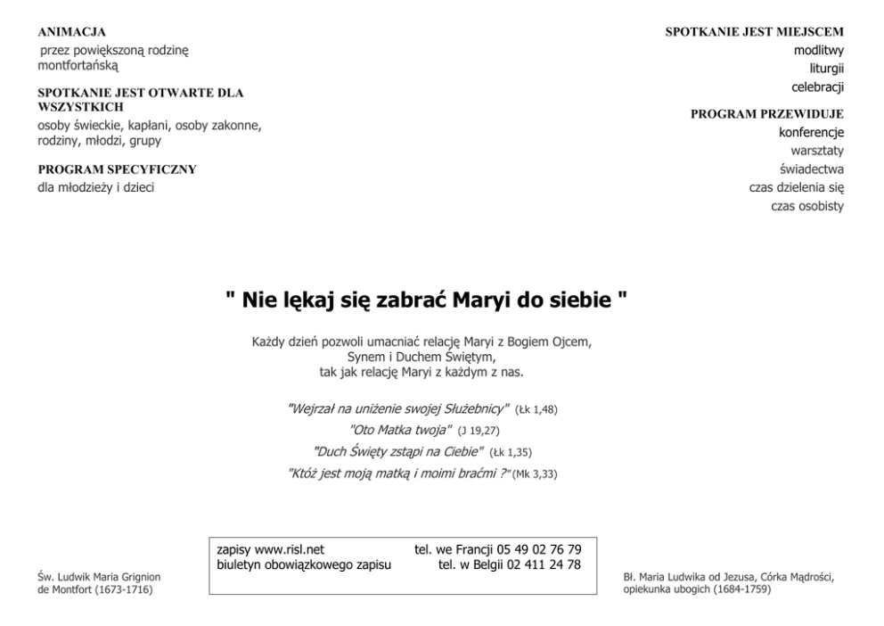 ANIMACJA przez powiększoną rodzinę montfortańską SPOTKANIE JEST MIEJSCEM modlitwy liturgii celebracji SPOTKANIE JEST OTWARTE DLA WSZYSTKICH osoby świeckie, kapłani, osoby zakonne, rodziny, młodzi, grupy PROGRAM PRZEWIDUJE konferencje warsztaty świadectwa czas dzielenia się czas osobisty PROGRAM SPECYFICZNY dla młodzieży i dzieci " Nie lękaj się zabrać Maryi do siebie " " Każdy dzień pozwoli umacniać relację Maryi z Bogiem Ojcem, Synem i Duchem Świętym, tak jak relację Maryi z każdym z nas. "Wejrzał na uniżenie swojej Służebnicy" "Oto Matka twoja" (Łk 1,48) (J 19,27) "Duch Święty zstąpi na Ciebie" (Łk 1,35) "Któż jest moją matką i moimi braćmi ?" (Mk 3,33) Św. Ludwik Maria Grignion de Montfort (1673-1716) zapisy www.risl.net biuletyn obowiązkowego zapisu tel. we Francji 05 49 02 76 79 tel. w Belgii 02 411 24 78 Bł. Maria Ludwika od Jezusa, Córka Mądrości, opiekunka ubogich (1684-1759) III MIĘDZYNARODOWE SPOTKANIE SAINT-LAURENT 7 – 11 sierpnia 2007 w St-Laurent-sur-Sèvre (Francja) WYKŁADOWCY O. Georges MADORE, smm Kanada O. François-Marie LÉTHEL, ocd Włochy O. Olivier MAIRE, smm Francja J.E. Michel SANTIER, biskup miejsca KOSZTY UCZESTNICTWA W CAŁYM SPOTKANIU (w tym noclegi i posiłki) dorośli: 159 € pary: 232 € młodzi (18-25 lat): 95 € młodzież (13- 17 lat): 30 € dzieci (0-12 lat): 20 € czwarte dziecko i nast.: bez opłaty DOPŁATA DO pokoju 1-osobowego, pościeli i przejazdu autobusowego . (Przejazdy autobusowe są organizowane z Polski, Hiszpanii, Włoch i Belgii). PRZEWIDYWANE TŁUMACZENIA (angielski, hiszpański, niderlandzki, polski i włoski) MIEJSCE St-Laurent-sur-Sèvre jest położone przy drodze N 149 między Nantes i Poitiers Najbliższy dworzec kolejowy w Cholet "Nie bój się Maryi wziąć do siebie" WSZYSTKO W JEDNEJ LINII DUCHOWEJ: L.-M. de Montfort, M.-L. Trichet, Edw. Poppe, Maksymilian Kolbe, Frank Duff, Marta Robin, Veronica O’Brien, Jan Paweł II …