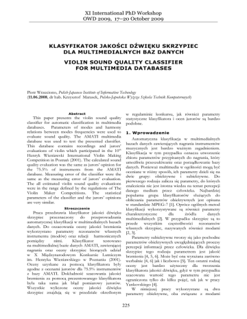 XI International PhD Workshop OWD 2009, 17–20 October 2009 KLASYFIKATOR JAKOŚCI DŹWIĘKU SKRZYPIEC DLA MULTIMEDIALNYCH BAZ DANYCH VIOLIN SOUND QUALITY CLASSIFIER FOR MULTIMEDIA DATABASES Piotr Wrzeciono, Polish-Japanese Institute of Information Technology (11.06.2008, dr hab. Krzysztof Marasek, Polsko-Japońska WyŜsza Szkoła Technik Komputerowych) Abstract This paper presents the violin sound quality classifier for automatic classification in multimedia databases. Parameters of modes and harmony relations between modes frequencies were used to evaluate sound quality. The AMATI multimedia database was used to test the presented classifier. This database contains recordings and jurors’ evaluations of violin which participated in the 10th Henryk Wieniawski International Violin Making Competition in Poznań (2001). The calculated sound quality evaluation was the same as jurors’ opinion for the 75.5% of instruments from the AMATI database. Measuring error of the classifier were the same as the measuring error of jurors’ evaluation. The all estimated violin sound quality evaluations were in the range defined by the regulations of The Violin Maker Competitions. The statistical parameters of the classifier and the jurors’ opinions are very similar. Streszczenie Praca przedstawia klasyfikator jakości dźwięku skrzypiec przeznaczony do przeprowadzania automatycznej klasyfikacji w multimedialnych bazach danych. Do oszacowania oceny jakości brzmienia wykorzystano parametry rezonansów własnych instrumentu (modów) oraz relacji harmonicznych pomiędzy nimi. Klasyfikator testowano na multimedialnej bazie danych AMATI, zawierającej nagrania oraz oceny skrzypiec biorących udział w X Międzynarodowym Konkursie Lutniczym im. Henryka Wieniawskiego w Poznaniu (2001). Oceny uzyskane za pomocą klasyfikatora były zgodne z ocenami jurorów dla 75.5% instrumentów z bazy AMATI. Dokładność szacowania jakości brzmienia za pomocą prezentowanego klasyfikatora była taka sama jak błąd pomiarowy jurorów. Wszystkie wyliczone oceny jakości dźwięku skrzypiec znajdują się w przedziale określonym w regulaminie konkursu, jak równieŜ parametry statystyczne klasyfikatora i ocen jurorów są bardzo podobne. 1. Wprowadzenie Automatyczna klasyfikacja w multimedialnych bazach danych zawierających nagrania instrumentów muzycznych jest bardzo waŜnym zagadnieniem. Klasyfikacja w tym przypadku oznacza utworzenie zbioru parametrów przypisanych do nagrania, który umoŜliwia przeszukiwanie oraz porządkowanie bazy danych. PoniewaŜ multimedia w ogólności mogą być oceniane w róŜny sposób, ich parametry dzieli się na dwie grupy: obiektywne i subiektywne. Do pierwszego rodzaju zalicza się parametry, do których znalezienia nie jest istotna wiedza na temat percepcji danego medium przez człowieka. Najbardziej popularna grupa klasyfikatorów słuŜących do obliczania parametrów obiektywnych jest opisana w standardzie MPEG-7 [1]. Oprócz ogólnych metod klasyfikacji wykorzystywane są równieŜ parametry charakterystyczne dla źródła danych multimedialnych [2]. W przypadku skrzypiec są to przede wszystkim częstotliwości rezonansów własnych skrzypiec, nazywanych równieŜ modami [2, 3]. Parametry subiektywne tworzy się jako pochodne parametrów obiektywnych uwzględniających procesy percepcji informacji przez człowieka. Dla dźwięku skrzypiec tego rodzaju parametrem jest jakość brzmienia [4, 5, 6]. MoŜe być ona wyraŜana zarówno werbalnie [4, 6] jak i liczbowo [5]. Ten ostatni rodzaj oceny jest bardzo uŜyteczny dla tworzenia klasyfikatora jakości dźwięku, gdyŜ w tym przypadku szacowana wartość tego parametru nie jest ograniczona tylko do kilku pojęć, tak jak w pracy Yankovskiego [4]. W niniejszej pracy wykorzystane są dwa parametry obiektywne, oba związane z modami 225 skrzypiec. Pierwszym z nich jest częstotliwość modu, natomiast drugim jest współczynnik energii wzajemnej, opisujący zachowanie się modu podczas gry na instrumencie. 2. Parametry modów NajwaŜniejszymi elementami skrzypiec, z punktu widzenia akustyki, są płyty rezonansowe (górna i dolna), dusza (drewniany słupek łączący obie płyty) oraz powietrze w korpusie instrumentu [3, 4, 8]. Mody są falami stojącymi powstającymi na powierzchni płyt oraz wewnątrz korpusu [3, 4, 7, 8]. Klasyfikacja modów została przeprowadzona przez zespół pod kierownictwem Hutchins [3] i jest powszechnie stosowana zarówno przez lutników jak i akustyków. Mody są wykrywane podczas badania odpowiedzi impulsowej skrzypiec [3, 4, 6], której pomiaru dokonuje się za pomocą akcelerometru, bez rejestrowania dźwięku [3, 4, 6]. JednakŜe z powodu faktu, Ŝe skrzypce są systemem nieliniowym [9], sama analiza odpowiedzi impulsowej nie jest wystarczająca do określenia jakie będzie brzmienie instrumentu. W celu lepszej analizy zachowania się instrumentu podczas normalnej gry za pomocą smyczka zostały opracowane metody wyszukująca mody w dźwięku instrumentu [10, 11]. W rezultacie otrzymano dwa parametry modu: częstotliwość i współczynnik energii wzajemnej (mutual energy factor), który charakteryzuje zachowanie się instrumentu przy róŜnych poziomach energii pobudzenia. 2.1 Częstotliwość modu Podczas badań [12, 13] stwierdzono obecność modów w widmie energetycznym gam chromatycznych zagranych na skrzypcach. Nagrania pochodziły z multimedialnej bazy danych AMATI [5, 14], zawierającej rejestracje dźwięków instrumentów biorących udział w X Międzynarodowym Konkursie Lutniczym im. Henryka Wieniawskiego (2001r.). ZauwaŜono wtedy, Ŝe mody moŜna wyodrębnić z widma energetycznego, poniewaŜ częstotliwość modów jest stała i niezaleŜna od pobudzenia. Opracowane metody [10, 11] bazują na transformacie DTFT [15] obliczanej dla całego nagrania gamy chromatycznej. Dla kaŜdego instrumentu z bazy AMATI obliczono widma energetyczne gam chromatycznych, nagranych w polu bliskim. Na k