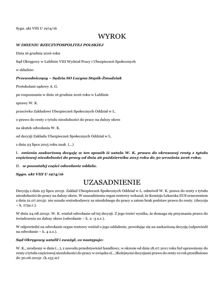 Sygn. akt VIII U 1974/16 WYROK W IMIENIU RZECZYPOSPOLITEJ POLSKIEJ Dnia 16 grudnia 2016 roku Sąd Okręgowy w Lublinie VIII Wydział Pracy i Ubezpieczeń Społecznych w składzie: Przewodniczący – Sędzia SO Lucyna Stąsik-Żmudziak Protokolant sądowy A. G. po rozpoznaniu w dniu 16 grudnia 2016 roku w Lublinie sprawy W. K. przeciwko Zakładowi Ubezpieczeń Społecznych Oddział w L. o prawo do renty z tytułu niezdolności do pracy na dalszy okres na skutek odwołania W. K. od decyzji Zakładu Ubezpieczeń Społecznych Oddział w L. z dnia 23 lipca 2015 roku znak (...) I. zmienia zaskarżoną decyzję w ten sposób iż ustala W. K. prawo do okresowej renty z tytułu częściowej niezdolności do pracy od dnia 26 października 2015 roku do 30 września 2016 roku; II. w pozostałej części odwołanie oddala. Sygn. akt VIII U 1974/16 UZASADNIENIE Decyzją z dnia 23 lipca 2015r. Zakład Ubezpieczeń Społecznych Oddział w L. odmówił W. K. prawa do renty z tytułu niezdolności do pracy na dalszy okres. W uzasadnieniu organ rentowy wskazał, że Komisja Lekarska ZUS orzeczeniem z dnia 21.07.2015r. nie uznała wnioskodawcy za niezdolnego do pracy a zatem brak podstaw prawa do renty. (decyzja – k. 173a.r.). W dniu 24.08.2015r. W. K. wniósł odwołanie od tej decyzji. Z jego treści wynika, że domaga się przyznania prawa do świadczenia na dalszy okres (odwołanie – k. 2 -3 a.s.). W odpowiedzi na odwołanie organ rentowy wniósł o jego oddalenie, powołując się na zaskarżoną decyzję (odpowiedź na odwołanie – k. 4 a.s.). Sąd Okręgowy ustalił i zważył, co następuje: W. K., urodzony w dniu (...), z zawodu przedstawiciel handlowy, w okresie od dnia 18.07.2011 roku był uprawniony do renty z tytułu częściowej niezdolności do pracy w związku z(...)Kolejnymi decyzjami prawo do renty co rok przedłużono do 30.06.2015r. (k.153 ar) W dniu 02 czerwca 2015r. złożył wniosek o ustalenie prawa do renty na dalszy okres (wniosek -167 a.r.). Lekarz Orzecznik ZUS orzeczeniem z dnia 18.07.2015 roku, po dokonaniu bezpośredniego badania wnioskodawcy i analizie przedstawionej dokumentacji medycznej i konsultacji ortopedy rozpoznał:(...)upośledzają sprawność organizmu lecz nie powodują długotrwałej niezdolności do pracy. (k.170ar, k. 20ao) Komisja Lekarska ZUS, orzekając w dniu 21 lipca 2015r., w wyniku zgłoszonego sprzeciwu wnioskodawcy również nie uznała że jest on częściowo niezdolny do pracy, twierdząc, że w okresach zaostrzenia dolegliwości może być leczony w ramach czasowej niezdolności do pracy. (orzeczenie –k.172 a.r.,39-40ao ). W oparciu o to orzeczenie, organ rentowy w dniu 23.07.2015r. wydał zaskarżoną decyzję (decyzja -173 a.r.). Z uwagi na fakt, iż w niniejszym postępowaniu spór dotyczył okoliczności, czy W. K. jest nadal częściowo niezdolny do pracy od dnia 1 czerwca 2015r., Sąd Okręgowy dopuścił dowód z opinii biegłego sądowego lekarza: neurologa i ortopedy. (k. 6 a.s.). W opinii z dnia 09.11.2015 r. biegli rozpoznali(...). Uznali badanego za częściowo niezdolnego do pracy od 26.10.2015r. do 30.09.2016 roku. W uzasadnieniu opinii biegli wskazali, że powyższego rozpoznania dokonali po zapoznaniu się z dokumentacją lekarską zawartą w aktach sprawy przeanalizowaniu dostarczonych badań obrazowych oraz po przeprowadzeniu badania ortopedycznego i neurologicznego. Wskazali, że skarżący doznał dodatkowego urazu w związku z upadkiem z motocykla w dniu (...) nadto w dniu 25.10.-27.10.2015r. wnioskodawca był hospitalizowany w Oddziale (...) ogólnej z rozpoznaniem (...) (...) W dniu 26.10.2015r. był leczony operacyjnie – wykonywano (...)Biorąc pod uwagę powyższe, po przeprowadzeniu badania przedmiotowego biegli uznali, że od dnia zabiegu operacyjnego, tj. od 26.10.2015r. ponownie istnieje u wnioskodawcy częściowa niezdolność do pracy, która trwa do 30.09.2016r. W ocenie ortopedycznej i neurologicznej brak jest podstaw do uznania niezdolności do pracy w okresie od 01.07.2015r. do 25.10.2015r. Stan (...)był wówczas na tyle dobry, że wnioskodawca mógł wykonywać zatrudnienie związane z pracami umysłowymi lub lekkimi pracami fizycznymi. Uwzględniając kwalifikacje zawodowe wnioskodawcy (przedstawiciel handlowy) nie było podstaw wówczas do uznania niezdolności do pracy. (opinia k. 21-22as) Zastrzeżenia do opinii zgłosił wnioskodawca, w związku z czym Sąd przekazał akta biegłym celem ustosunkowania się do nich. Organ rentowy opinii nie kwestionował. Biegli w opinii uzupełniającej z dnia 20.09.2016r. nie znaleźli podstaw do zmiany opinii podstawowej. Wskazali, że opinia została wydana przez biegłych po przeanalizowaniu akt sprawy, przeprowadzeniu badania przedmiotowego wnioskodawcy oraz zapoznaniu się z dostarczonymi badaniami radiologicznymi (na płytach CD ). W opiniowaniu biegli uwzględnili charakter wykonywanego w przeszłości zatrudnienia i kwalifikacji zawodowych wnioskodawcy. Schorzenia występujące u wnioskodawcy w okresie ostatniego orzekania rentowego ZUS,(...)przebyte leczenie (...) (...) (...) niezdolności do pracy w dniach 1.07 - 25.10.2015 r. Schorzenia te, przy występującym wówczas stopniu zaawansowania i nasilenia objawów, nie sprowadzały znaczących ograniczeń do zatrudnienia związanego z pracami umysłowymi lub lekkimi pracami fizycznymi. Nie uzasadniały uznania częściowej niezdolności do pracy. W czasie badania w dn. 9.11.2015 r. wnioskodawca podał, że w sierpniu 2015 r. doznał (...) Jest to nowa okoliczność w sprawie. Schorzenie to nie występowało w okresie ostatniego orzekania rentowego ZUS. Wymagało leczenia w ramach zwolnienia lekarskiego, tj. zasiłku chorobowego, od dnia urazu. Schorzenia(...)wymagają omówienia przez biegłego okulistę. Reasumując, biegli z zakresu ortopedii i neurologii podtrzymali w całości opinię z dnia 9.11.2015 r. (opinia k. 38as) Początkowo wnioskodawca kwestionował tą opinię, przedłożył dodatkowe doku