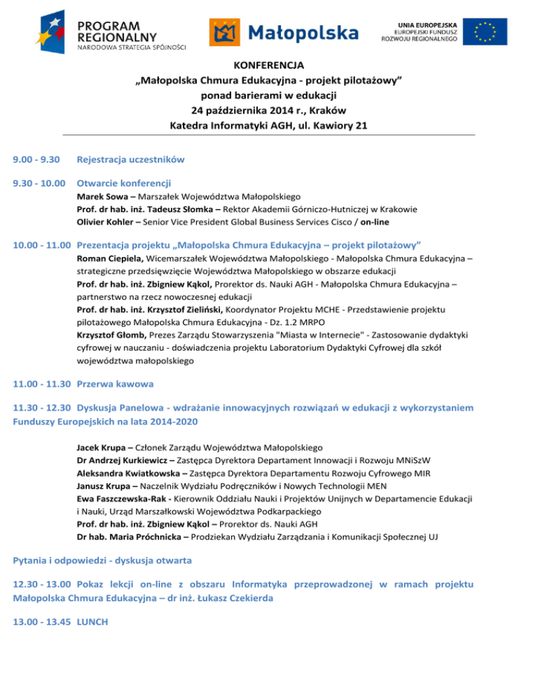 KONFERENCJA „Małopolska Chmura Edukacyjna - projekt pilotażowy” ponad barierami w edukacji 24 października 2014 r., Kraków Katedra Informatyki AGH, ul. Kawiory 21 9.00 - 9.30 Rejestracja uczestników 9.30 - 10.00 Otwarcie konferencji Marek Sowa – Marszałek Województwa Małopolskiego Prof. dr hab. inż. Tadeusz Słomka – Rektor Akademii Górniczo-Hutniczej w Krakowie Olivier Kohler – Senior Vice President Global Business Services Cisco / on-line 10.00 - 11.00 Prezentacja projektu „Małopolska Chmura Edukacyjna – projekt pilotażowy” Roman Ciepiela, Wicemarszałek Województwa Małopolskiego - Małopolska Chmura Edukacyjna – strategiczne przedsięwzięcie Województwa Małopolskiego w obszarze edukacji Prof. dr hab. inż. Zbigniew Kąkol, Prorektor ds. Nauki AGH - Małopolska Chmura Edukacyjna – partnerstwo na rzecz nowoczesnej edukacji Prof. dr hab. inż. Krzysztof Zieliński, Koordynator Projektu MCHE - Przedstawienie projektu pilotażowego Małopolska Chmura Edukacyjna - Dz. 1.2 MRPO Krzysztof Głomb, Prezes Zarządu Stowarzyszenia "Miasta w Internecie" - Zastosowanie dydaktyki cyfrowej w nauczaniu - doświadczenia projektu Laboratorium Dydaktyki Cyfrowej dla szkół województwa małopolskiego 11.00 - 11.30 Przerwa kawowa 11.30 - 12.30 Dyskusja Panelowa - wdrażanie innowacyjnych rozwiązań w edukacji z wykorzystaniem Funduszy Europejskich na lata 2014-2020 Jacek Krupa – Członek Zarządu Województwa Małopolskiego Dr Andrzej Kurkiewicz – Zastępca Dyrektora Departament Innowacji i Rozwoju MNiSzW Aleksandra Kwiatkowska – Zastępca Dyrektora Departamentu Rozwoju Cyfrowego MIR Janusz Krupa – Naczelnik Wydziału Podręczników i Nowych Technologii MEN Ewa Faszczewska-Rak - Kierownik Oddziału Nauki i Projektów Unijnych w Departamencie Edukacji i Nauki, Urząd Marszałkowski Województwa Podkarpackiego Prof. dr hab. inż. Zbigniew Kąkol – Prorektor ds. Nauki AGH Dr hab. Maria Próchnicka – Prodziekan Wydziału Zarządzania i Komunikacji Społecznej UJ Pytania i odpowiedzi - dyskusja otwarta 12.30 - 13.00 Pokaz lekcji on-line z obszaru Informatyka przeprowadzonej w ramach projektu Małopolska Chmura Edukacyjna – dr inż. Łukasz Czekierda 13.00 - 13.45 LUNCH 13.45 - 15.30 Wykorzystanie technologii chmury obliczeniowej w edukacji Prezentacje Marek Ruciński, Andrzej Olsztyński – "IBM Connections - perspektywa wykorzystania platformy społecznościowej w Małopolskiej Chmurze Edukacyjnej" Artur Bar, X Trainings – Koncepcja szkoleń wirtualnych w oparciu o platformę Cisco Netspace Wojciech Pilarski – Dyrektor Działu Rozwoju Solidex S.A. - „Solidny partner jako element powodzenia projektu” Dr Łukasz Srokowski, Fabryka Przyszłości, Stowarzyszenie "Miasta w Internecie"- Wsparcie aktywizujących metod dydaktycznych zasobami i narzędziami cyfrowymi - praktyczne doświadczenia projektu Laboratorium Dydaktyki Cyfrowej dla szkół woj. małopolskiego Podsumowanie Dariusz Fabiszewski – Dyrektor Generalny Cisco Systems Poland Dr inż. Zbigniew Skotniczny – Prezes Solidex S.A. Prof. dr hab. inż. Krzysztof Zieliński – Koordynator Projektu MCHE 15.30 - 15.50 Przerwa kawowa 15.50 - 17.00 Debata – uwarunkowania edukacyjno-organizacyjne oraz realizacja w poszczególnych obszarach tematycznych projektu Małopolska Chmura Edukacyjna zajęć Dariusz Styrna – Dyrektor Departamentu Edukacji i Kształcenia Ustawicznego UMWM Bogusław Waksmundzki – Urzędujący Członek Zarządu Powiatu Nowotarskiego Tomasz Malicki – Dyrektor I Liceum Ogólnokształcącego im. Bartłomieja Nowodworskiego w Krakowie Grażyna Pabis-Mazur – Dyrektor Zespołu Szkół Ekonomicznych im. Jana Pawła II w Gorlicach / on-line Anna Olszańska – Dyrektor Zespołu Szkół Ponadgimnazjalnych im. Józefa Piłsudskiego w Zakliczynie / on-line Dr hab. Małgorzata Pamuła-Behrens, prof. nadzw. – Kierownik projektu MCHE / Uniwersytet Pedagogiczny Dr Marian Piekarski – Dyrektor Centrum Pedagogiki i Psychologii Politechniki Krakowskiej Prof. dr hab. inż. Barbara Filipek-Mazur – żywność i środowisko / Uniwersytet Rolniczy Dr Piotr Buła – przedsiębiorczość / Uniwersytet Ekonomiczny Dr inż. Estera Michnowska – chemia / Politechnika Krakowska 17.10-17.20 Zamknięcie konferencji Patronat medialny