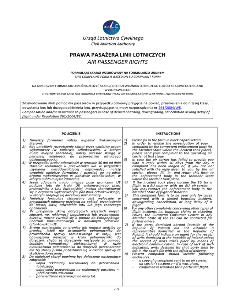 Urząd Lotnictwa Cywilnego Civil Aviation Authority PRAWA PASAŻERA LINII LOTNICZYCH AIR PASSENGER RIGHTS FORMULARZ SKARGI WZOROWANY NA FORMULARZU UNIJNYM THIS COMPLAINT FORM IS BASED ON EU COMPLAINT FORM NA NINIEJSZYM FORMULARZU MOŻNA ZŁOŻYĆ SKARGĘ DO PRZEWOŹNIKA LOTNICZEGO LUB DO KRAJOWEGO ORGANU WYKONAWCZEGO THIS FORM CAN BE USED FOR LODGING A COMPLAINT TO AN AIR CARRIER AND/OR A NATIONAL ENFORCEMENT BODY Odszkodowanie i/lub pomoc dla pasażerów w przypadku odmowy przyjęcia na pokład, przeniesienia do niższej klasy, odwołania lotu lub dużego opóźnienia lotu, przysługujące na mocy rozporządzenia nr 261/2004/WE. Compensation and/or assistance to passengers in case of denied boarding, downgrading, cancellation or long delay of flight under Regulation 261/2004/EC. POUCZENIE 1) 2) 3) 4) 5) 6) 7) 8) INSTRUCTIONS Niniejszy formularz należy wypełnić drukowanymi literami. Aby umożliwić rozpatrzenie skargi przez właściwy organ wykonawczy (w państwie członkowskim, w którym miało miejsce zdarzenie), należy przesłać skargę w pierwszej kolejności do przewoźnika lotniczego obsługującego lot. W przypadku braku odpowiedzi w terminie 30 dni od dnia złożenia reklamacji u przewoźnika lub w przypadku uzyskania niezadowalającej odpowiedzi, należy wypełnić niniejszy formularz i przesłać go na adres organu wykonawczego w państwie członkowskim, w którym miało miejsce zdarzenie. Jeżeli zdarzenie miało miejsce poza granicami UE podczas lotu do kraju UE wykonywanego przez przewoźnika z Unii Europejskiej, można skontaktować się z organem wykonawczym państwa członkowskiego, w którym znajduje się docelowy port lotniczy. Niniejszy formularz stosowany jest wyłącznie w przypadkach odmowy przyjęcia na pokład, przeniesienia do niższej klasy, odwołania lotu lub jego znacznego opóźnienia. W przypadku skarg dotyczących wszelkich innych zdarzeń, np. reklamacji bagażowych lub wystawiania biletów, można zwrócić się o pomoc do Europejskiego Centrum Konsumenckiego w dowolnym państwie członkowskim UE. Strona zamieszkała za granicą lub mająca siedzibę za granicą, jeżeli nie ustanowiła pełnomocnika do prowadzenia sprawy zamieszkałego w kraju, jest obowiązana wskazać w kraju pełnomocnika do doręczeń, chyba że doręczenie następuje za pomocą środków komunikacji elektronicznej. W razie niewskazania pełnomocnika do doręczeń przeznaczone dla tej strony pisma pozostawia się w aktach sprawy ze skutkiem doręczenia. Do niniejszej skargi powinny być dołączone następujące załączniki: - kopia reklamacji skierowanej do przewoźnika lotniczego, - odpowiedź przewoźnika na reklamację pasażera – jeżeli została udzielona - potwierdzona rezerwacja na dany lot. -1/6- 1) 2) 3) 4) 5) 6) 7) 8) Please fill in the form in block capital letters. In order to enable the investigation of your complaint by the competent enforcement body (in the Member State where the incident took place), please send your complaint to the operating air carrier at first stage. In case the air carrier has failed to provide you with a reply within 30 days from the day a complaint has been lodged or, if you are not satisfied with the reply given to you by the air carrier, please fill in and return this form to the enforcement body in the Member State where the incident took place. If the incident took place outside the EU for a flight to a EU country with an EU air carrier, you may contact the enforcement body in the Member State of flight destination. This complaint form is to be used only for cases concerned with a denied boarding incident, downgrading, cancellation, or long delay of a flight. For any other complaints concerning other types of flight incidents i.e. baggage claims or ticketing issues, the European Consumer Centre in any Member State of the EU can be contacted for further advice. If the party domiciled abroad (outside of the Republic of Poland) did not establish a representative domiciled in the Republic of Poland, it should indicate an agent for the receipt of writs domiciled in the Republic of Poland unless the receipt of writs takes place by means of electronic communication. In case of lack of such indication, writs destined for that party shall be left in the case’s file with the effect of delivery. Present complaint should include following enclosures: - a copy of a complaint sent to an air carrier, - air carrier’s response – if it was given, - confirmed reservation for a particular flight. Dane pasażera, którego skarga dotyczy: Passenger's personal data (whose the complaint relates to): Nazwisko: Surname _ Imię: Name Adres: Address Miejscowość: City Kod pocztowy: Postcode Kraj: Country Data urodzenia: Date of birth Telefon: Phone e-mail: Pełnomocnik do doręczeń: Proxy for correspondence: Nazwisko: Surname Imię: Name Adres: Address Miejscowość: City Kod pocztowy: Postcode Telefon: Phone e-mail: Skarga dotyczy następującego lotu: Complaint concerning the following flight: Przewoźnik lotniczy: Air carrier Numer lotu: Flight number Numer rezerwacji (PNR): Booking ref (PNR) Data lotu: Date of flight _Port lotniczy przylotu: Airport of arrival Port lotniczy wylotu: Airport of departure Planowa godzina wylotu: Scheduled time of departure Planowa godzina przylotu: Scheduled time of arrival Faktyczna godzina wylotu: Actual time of departure Faktyczna godzina przylotu: Actual time of arrival Porty tranzytowe (jeżeli dotyczy): Connecting points (if any) Port lotniczy (porty lotnicze), w którym (których) zdarzenie miało miejsce: Airport/-s where the incident/-s occurred -2/6- __- Prosimy odpowiednio zaznaczyć i wypełnić poniższą część Tick the appropriate box(es) and fill in the following sections 1. Rodzaj skargi/zdarzenia: Type of complaint/ incident: Odmowa przyjęcia na pokład Denied boarding Opóźnienie (opóźnienie wyniosło Delay (Duration godzin) hours) Odwołanie lotu Flight cancellation Przeniesienie do niższe