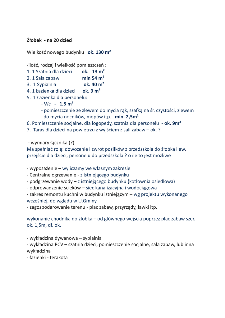 Żłobek - na 20 dzieci Wielkość nowego budynku ok. 130 m2 -ilość, rodzaj i wielkość pomieszczeń : 1. 1 Szatnia dla dzieci ok. 13 m2 2. 1 Sala zabaw min 54 m2 3. 1 Sypialnia ok. 40 m2 4. 1 Łazienka dla dzieci ok. 9 m2 5. 1 Łazienka dla personelu: - Wc - 1,5 m2 - pomieszczenie ze zlewem do mycia rąk, szafką na śr. czystości, zlewem do mycia nocników, mopów itp. min. 2,5m2 6. Pomieszczenie socjalne, dla logopedy, szatnia dla personelu - ok. 9m2 7. Taras dla dzieci na powietrzu z wyjściem z sali zabaw – ok. ? - wymiary łącznika (?) Ma spełniać rolę: dowożenie i zwrot posiłków z przedszkola do żłobka i ew. przejście dla dzieci, personelu do przedszkola ? o ile to jest możliwe - wyposażenie – wyliczamy we własnym zakresie - Centralne ogrzewanie - z istniejącego budynku - podgrzewanie wody – z istniejącego budynku (kotłownia osiedlowa) - odprowadzenie ścieków – sieć kanalizacyjna i wodociągowa - zakres remontu kuchni w budynku istniejącym – wg projektu wykonanego wcześniej, do wglądu w U.Gminy - zagospodarowanie terenu - plac zabaw, przyrządy, ławki itp. wykonanie chodnika do żłobka – od głównego wejścia poprzez plac zabaw szer. ok. 1,5m, dł. ok. - wykładzina dywanowa – sypialnia - wykładzina PCV – szatnia dzieci, pomieszczenie socjalne, sala zabaw, lub inna wykładzina - łazienki - terakota