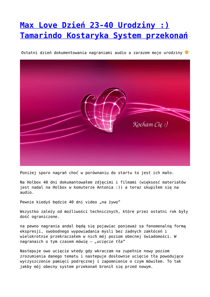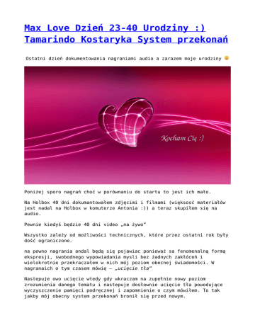 Max Love Dzień 23-40 Urodziny :) Tamarindo Kostaryka System przekonań Ostatni dzień dokumentowania nagraniami audio a zarazem moje urodziny Poniżej sporo nagrań choć w porównaniu do startu to jest ich mało. Na Holbox 40 dni dokumantowałem zdjęcimi i filmami (więksosć materiałów jest nadal na Holbox w komuterze Antonia :)) a teraz skupiłem się na audio. Pewnie kiedyś będzie 40 dni video „na żywo” Wszystko zależy od możliwości technicznych, które przez ostatni rok były dość ograniczone. na pewno nagrania andal będą się pojawiac ponieważ sa fenomenalną formą ekspresji, swobodnego wypowiadania mysli bez żadnych zakłóceń i wielokrotnie przekraczałem w nich mój poziom obecnej świadomości. W nagranaich o tym czasem mówię – „ucięcie tła” Nastepuje owo ucięcie wtedy gdy wkraczam na zupełnie nowy poziom zrozumienia danego tematu i nastepuje dosłownie ucięcie tła powodujące wyczyszczenie pamięci podręcznej i zapomnienie o czym mówiłem. To tak jakby mój obecny system przekonań bronił się przed nowym. Urodziny to też koniec mojego roku 9 z numerologii, a że wierze sobie w numerologie, od kilkunastu lat i sie w jakiś sposób nią kieruje więc rok 9 był zakańczaniem i był to dość trudny rok chyba najtrudniejszy z ostatnich 9 lat… Moje drugie imię Maksymilian dodałem sobie urzędowo w 2003. Musiałem wtedy zmienić paszport, dowód osobisty i prawo jazdy Jak zawsze przed urodzinami robię sobie jakieś podsumowania i teraz dotyczyło to głównie tej mojej trawjącej od ponad 5 lat podróży mającej na celu znalezienie nowej bazy. Czasem potrzebję wsparcia z zewnątrz takiego doładowania inna energią, innym spojrzeniem i właśnie ostatnio bardzo mi pomogło kilka osób którym serdecznie dziękuję – moi rodzice, Karolina, Weronika, Cezary i Mirek Szczególnie zaskoczyło mnie Cezary, ktróy dołączył do mnie na facebooku już nie pamiętam w jakich okolicznościach. Jest młody ma 17 lat, poszukujący swojej drogi i pasji. Napisał do mnei na facebooku czy chce aby mi przeprowadził ze mną coaching, o ile oczywiście mam jakiś problem. Mam tylko jeden ten związany z bazą Zgodziłem się bo uznałem że tak świeże i nieskażone znajomością mojej osoby spojrzenie może wnieść coś istotnego. Mam swojego coacha (www.AndrzejHanisz.pl) od iluś lat jednak jakoś nie czułem aby do niego zgłosic się teraz z moim problemem. Cezary bardzo się zaangażował i zadając mi różne pytania uwypukliły się pewne rzeczy których nie zauważałem, że w tak ograniczony sposób do nich podchodzę Lubię takie rozmowy i czesto dopiero po rozmowie ponownie analizując taka rozmowę widzę siebie z boku w innym świetle. Polecam nagrywac aka rozmowę aby potem ją przesłuchać w oddzieleniu od siebie. Cezary przed moim feedbackiem był z siebie niezadowolony co do coachingu a ja natomiast byłem zadowolony Jeśli ktoś ma problem i chciałby skorzystać ze skypowej rozmowy coachingowej z Cezarym to można do mnie napisać na maila lub na facebooku. A poniżej nagrania rec 71 – 2:03 poranne nagranie http://maxlove.eu/blog/wp-content/uploads/2014/02/REC71-32-40.mp3 max love REC71 32-40 – aby ściagnąć plik kliknij prawym przyciskiem i wybierz „zapisz jako…” – „save as…” – tak jak o sobie myślimy tak jest potem przerwa bo zasnąłem i dokończenie pod koniec rec 72 – 1:43 – dzień 32 http://maxlove.eu/blog/wp-content/uploads/2014/02/REC72-32-40.mp3 max love REC72 32-40 – aby ściagnąć plik kliknij prawym przyciskiem i wybierz „zapisz jako…” – „save as…” – brak netu w całym Tamarindo – o życiu bez netu rec 73 – 39:14 http://maxlove.eu/blog/wp-content/uploads/2014/02/REC73-32-40.mp3 max love REC73 32-40 – aby ściagnąć plik kliknij prawym przyciskiem i wybierz „zapisz jako…” – „save as…” – o karmie i reinkarnacji w różnych religiach – nauka i religia – o stabilnej bazie przekonań religijnych – o ważności struktury systemu przekonań – o niebezpieczeństwie fragmentarycznych przeszczepów systemu przekonań – podwójne spętlenia – umysł tworzy system przekonań – twój system przekonań – o tym jak rodzice programują dzieci – o poziomach świadomości i zmianie przekonań (inne postrzeganie) – wartościowanie to dualizm i cierpienie – odczepianie wartości uwalnia od cierpienia – zmiana wartościowania z biegiem czasu – kwantowe doświadczenia Duszy w wymiarze fizycznym – wyjaśnienie czym jest komputer kwantowy – samobójstwo moje – „równoległe” fraktalne wymiary Rec 74 – 18:15 dzień 33 http://maxlove.eu/blog/wp-content/uploads/2014/02/REC74-32-40.mp3 max love REC74 32-40 – aby ściagnąć plik kliknij prawym przyciskiem i wybierz „zapisz jako…” – „save as…” – o ciele, duszy, śnie tylko pierwsze 6 minut potem zasnąłem rec 76 – 4:06 http://maxlove.eu/blog/wp-content/uploads/2014/02/REC76-32-40.mp3 max love REC76 32-40 – aby ściagnąć plik kliknij prawym przyciskiem i wybierz „zapisz jako…” – „save as…” – o wchodzeniu świadomie w sen – uczucie w oczach podczas zasypiania – kolejne fazy wyłączania fizyczności – ciało – głowa – oczy – błędnik – zmysł rówowagi/orientacji itd. rec 77 – 1:54 http://maxlove.eu/blog/wp-content/uploads/2014/02/REC77-32-40.mp3 max love REC77 32-40 – aby ściagnąć plik kliknij prawym przyciskiem i wybierz „zapisz jako…” – „save as…” – medytacja, sex i inne odmienne stany świadomości i ich podobieństwo do snu – spotkanie z krokodylem rec 78 – 3:54 http://maxlove.eu/blog/wp-content/uploads/2014/02/REC78-32-40.mp3 max love REC78 32-40 – aby ściagnąć plik kliknij prawym przyciskiem i wybierz „zapisz jako…” – „save as…” – rozwinięcie nagrania rec 77 przerwanego spotkaniem krokodyla – o zmysłach i ich wyłączaniu – ciało to zmysły rec 81 – 12:33 – dzień 35 ht