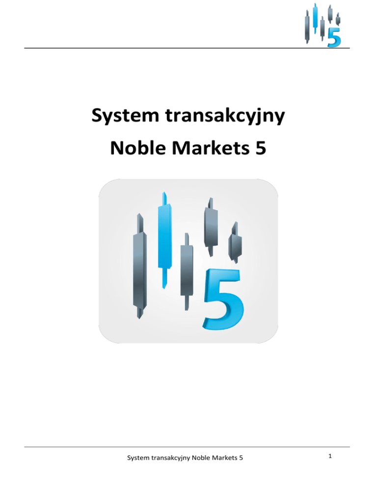 System transakcyjny Noble Markets 5 System transakcyjny Noble Markets 5 1 Spis treści I. System transakcyjny Noble Markets 5 ...................................................................................................................... 3 II. Co wyróżnia MetaTrader 5 od MetaTrader 4 ........................................................................................................... 3 III. Pierwsze logowanie................................................................................................................................................... 4 1. Okno „Rynek” ........................................................................................................................................................ 5 2. Okno „Nawigator” ................................................................................................................................................ 7 a) Moduł „Głębokość rynku” ................................................................................................................................. 8 3. Okno „Wykresu”.................................................................................................................................................... 9 4. Okno „Narzędzia”................................................................................................................................................ 13 a) Kalendarz wydarzeń ........................................................................................................................................ 16 IV. Otwarcie zlecenia .................................................................................................................................................... 17 1. Rodzaje zleceń..................................................................................................................................................... 19 a) Nowe rodzaje zleceń oczekujących w systemie Noble Markets 5 .................................................................. 23 b) Nowości przy składaniu zleceń w systemie Noble Markets 5 ......................................................................... 28 VI. Zamykanie pozycji ...................................................................................................................................................... 29 VII. Handel GPW na MT5................................................................................................................................................. 30 VIII. Automatyczne strategie i społeczność MT5............................................................................................................ 35 System transakcyjny Noble Markets 5 2 I. System transakcyjny Noble Markets 5 Platforma transakcyjna Noble Markets 5 to nowoczesne narzędzie inwestycyjne stworzone na potrzeby najbardziej wymagających i aktywnych inwestorów. Jako pierwszy system w Polsce daje możliwość handlu zarówno na rynku Forex jak i GPW z poziomu jednej platformy transakcyjnej. Poza dostępem do pełnego wachlarza narzędzi niezbędnych w codziennej pracy inwestor otrzymuje możliwości inwestycji następujące instrumenty:: Waluty (EURPLN, EURUSD, GBPUSD i wiele innych) Akcje z Giełdy Papierów Wartościowych w Warszawie Szybkość i stabilność działania, w połączeniu z nowoczesnymi narzędziami analizy technicznej oraz innowacyjnym modułem automatycznych strategii przekłada się na przewagę platformy Noble Markets 5 nad pozostałymi systemami inwestycyjnymi dostępnymi na rynku. Jest to zatem najprawdopodobniej najlepszy obecnie tego typu system na rynku, oparty o znane i cenione na całym świecie rozwiązanie MetaTrader 4 i będący naturalnie jego kolejną wersją z jeszcze większą liczbą narzędzi analitycznych i funkcjonalnych rozwiązań dla inwestorów. II. Co wyróżnia MetaTrader 5 od MetaTrader 4 Więcej narzędzi do analizy technicznej Możliwość analizy arkusza zleceń przez dogodną funkcjonalność głębokość rynku Łatwiejsze korzystanie z automatycznych strategii inwestycyjnych, w tym możliwość korzystania z bezpłatnych strategii, a także zakupu dodatkowych w module MT5 zintegrowanym ze stroną internetową www.mql5.com Więcej potrzebnych funkcjonalności dla inwestora (m.in. wbudowany kalendarz makroekonomiczny, nowe interwały czasowe wykresów itp.) Szybsze wykonywanie transakcji bezpośrednio w oknie Rynek w zakładce Trading (OneClik Trading) System transakcyjny Noble Markets 5 3 III. Pierwsze logowanie Platforma Noble Markets po zainstalowaniu w trakcie pierwszego uruchomienia automatycznie wyświetli okno logowania. Po wpisaniu Loginu i Hasła, które zostanie przekazane podczas rejestracji demo lub po wpłacie środków dla rachunku rzeczywistego, należy kliknąć przycisk Login, aby uzyskać połączenie z serwerem. W oknie logowania istnieje też możliwość wyboru serwera w zależności, czy chcemy zalogować się na rachunek demonstracyjny lub rzeczywisty oraz zezwolić platformie na zapamiętanie danych dostępowych konta, aby nie wpisywać ich każdorazowo podczas logowania. Stan połączenia możemy na bieżąco monitorować w prawym dolnym rogu platformy. Potwierdzeniem poprawnego zalogowania jest widoczna na dole ekranu z prawej strony ikona komputera wraz z niewielkim zielonym znakiem u jego dołu. Jest tam również pokazana szybkość połączenia z internetem. W przypadku pojawienia się prędkości 0 / 0 Kb należy sprawdzić stan połączenia z Internetem lub ustawienia firewall’a. Znak komputera z czerwonym, okrągłym znakiem oznacza z kolei niepoprawnie wpisany login lub hasło do rachunku. System transakcyjny Noble Markets 5 4 Pierwszy rzut oka na platformę Widok platformy Noble Markets 5 po pierwszym uruchomieniu: Możemy wyróżnić podstawowe cztery okna platformy: okno „Rynek” (1) okno „Nawigator” (2) okno „Wykresu” (3) okno „Narzędzia” (4) (wcz