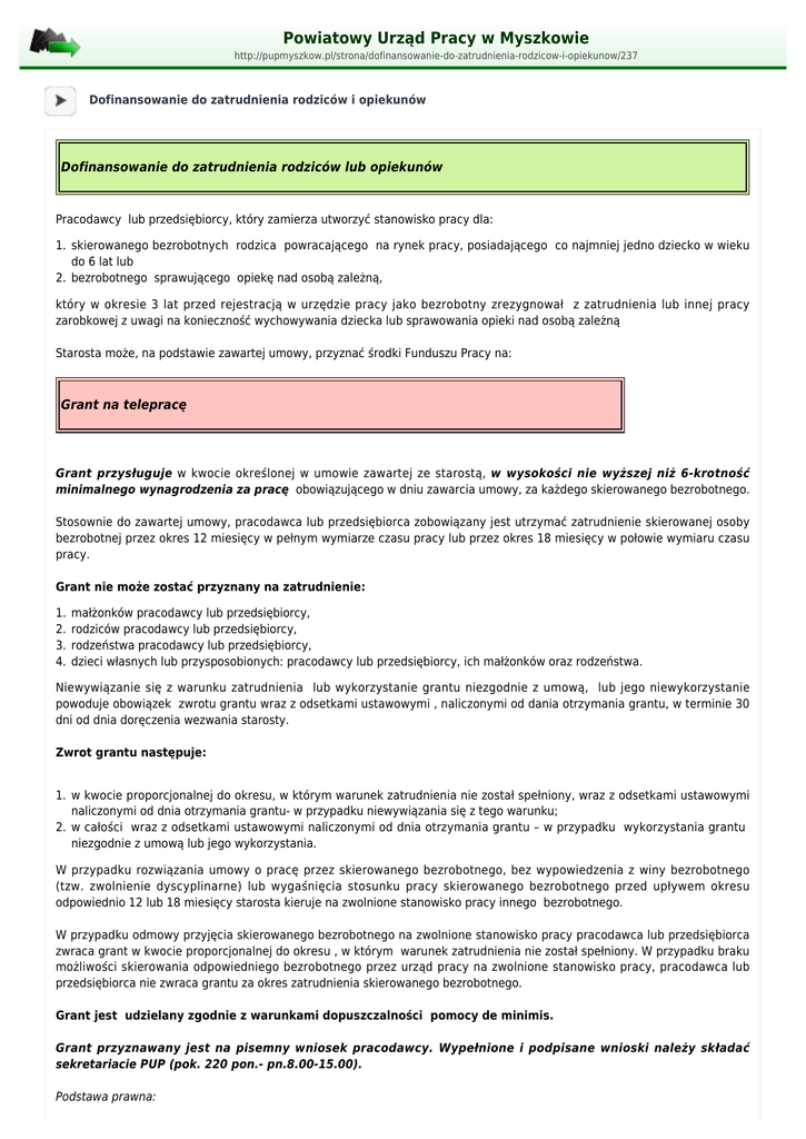 Powiatowy Urząd Pracy w Myszkowie http://pupmyszkow.pl/strona/dofinansowanie-do-zatrudnienia-rodzicow-i-opiekunow/237 Dofinansowanie do zatrudnienia rodziców i opiekunów Dofinansowanie do zatrudnienia rodziców lub opiekunów Pracodawcy lub przedsiębiorcy, który zamierza utworzyć stanowisko pracy dla: 1. skierowanego bezrobotnych rodzica powracającego na rynek pracy, posiadającego co najmniej jedno dziecko w wieku do 6 lat lub 2. bezrobotnego sprawującego opiekę nad osobą zależną, który w okresie 3 lat przed rejestracją w urzędzie pracy jako bezrobotny zrezygnował z zatrudnienia lub innej pracy zarobkowej z uwagi na konieczność wychowywania dziecka lub sprawowania opieki nad osobą zależną Starosta może, na podstawie zawartej umowy, przyznać środki Funduszu Pracy na: Grant na telepracę Grant przysługuje w kwocie określonej w umowie zawartej ze starostą, w wysokości nie wyższej niż 6-krotność minimalnego wynagrodzenia za pracę obowiązującego w dniu zawarcia umowy, za każdego skierowanego bezrobotnego. Stosownie do zawartej umowy, pracodawca lub przedsiębiorca zobowiązany jest utrzymać zatrudnienie skierowanej osoby bezrobotnej przez okres 12 miesięcy w pełnym wymiarze czasu pracy lub przez okres 18 miesięcy w połowie wymiaru czasu pracy. Grant nie może zostać przyznany na zatrudnienie: 1. 2. 3. 4. małżonków pracodawcy lub przedsiębiorcy, rodziców pracodawcy lub przedsiębiorcy, rodzeństwa pracodawcy lub przedsiębiorcy, dzieci własnych lub przysposobionych: pracodawcy lub przedsiębiorcy, ich małżonków oraz rodzeństwa. Niewywiązanie się z warunku zatrudnienia lub wykorzystanie grantu niezgodnie z umową, lub jego niewykorzystanie powoduje obowiązek zwrotu grantu wraz z odsetkami ustawowymi , naliczonymi od dania otrzymania grantu, w terminie 30 dni od dnia doręczenia wezwania starosty. Zwrot grantu następuje: 1. w kwocie proporcjonalnej do okresu, w którym warunek zatrudnienia nie został spełniony, wraz z odsetkami ustawowymi naliczonymi od dnia otrzymania grantu- w przypadku niewywiązania się z tego warunku; 2. w całości wraz z odsetkami ustawowymi naliczonymi od dnia otrzymania grantu – w przypadku wykorzystania grantu niezgodnie z umową lub jego wykorzystania. W przypadku rozwiązania umowy o pracę przez skierowanego bezrobotnego, bez wypowiedzenia z winy bezrobotnego (tzw. zwolnienie dyscyplinarne) lub wygaśnięcia stosunku pracy skierowanego bezrobotnego przed upływem okresu odpowiednio 12 lub 18 miesięcy starosta kieruje na zwolnione stanowisko pracy innego bezrobotnego. W przypadku odmowy przyjęcia skierowanego bezrobotnego na zwolnione stanowisko pracy pracodawca lub przedsiębiorca zwraca grant w kwocie proporcjonalnej do okresu , w którym warunek zatrudnienia nie został spełniony. W przypadku braku możliwości skierowania odpowiedniego bezrobotnego przez urząd pracy na zwolnione stanowisko pracy, pracodawca lub przedsiębiorca nie zwraca grantu za okres zatrudnienia skierowanego bezrobotnego. Grant jest udzielany zgodnie z warunkami dopuszczalności pomocy de minimis. Grant przyznawany jest na pisemny wniosek pracodawcy. Wypełnione i podpisane wnioski należy składać sekretariacie PUP (pok. 220 pon.- pn.8.00-15.00). Podstawa prawna: Art. 60a ustawy o promocji zatrudnienia i instytucjach rynku pracy Świadczenie aktywizacyjne Świadczenie aktywizacyjne to świadczenie, które starosta możne, na podstawie zawartej umowy, przyznać pracodawcy za zatrudnienie skierowanej osoby bezrobotnej . Świadczenie aktywizacyjne przysługuje przez okres: 1. 12 miesięcy w wysokości połowy minimalnego wynagrodzenia za pracę miesięcznie, 2. 18 miesięcy w wysokości jednej trzeciej minimalnego wynagrodzenia za pracę miesięcznie. Pracodawca jest zobowiązany do dalszego zatrudniania skierowanego bezrobotnego po upływie okresu przysługiwania świadczenia aktywizacyjnego, odpowiednio przez okres 6 miesięcy w przypadku pobierania świadczenia przez okres 12 miesięcy i 9 miesięcy w sytuacji, gdy świadczenie zostało przyznane na 18 miesięcy. Świadczenie aktywizacyjne jest udzielane dla pracodawcy zgodnie z warunkami dopuszczalności pomocy de minimis. Rozwiązanie umowy o pracę w trakcie przysługiwania świadczenia aktywizacyjnego lub niewywiązanie się przez pracodawcę z warunku wymaganego okresu utrzymania zatrudnienia, skutkuje koniecznością zwrotu świadczenia wraz z odsetkami ustawowymi naliczonymi od dania wypłaty pierwszego świadczenia , w terminie 30 dni od dnia doręczenia wezwania starosty. W przypadku utrzymania zatrudnienia skierowanego bezrobotnego przez okres przysługiwania świadczenia aktywizacyjnego oraz przez co najmniej połowę okresu wymaganego utrzymania zatrudnienia po upływie prawa do świadczenia, pracodawca jest zobowiązany do zwrotu 50 proc. wszystkich otrzymanych środków wraz z odsetkami ustawowymi, naliczonymi od dania wypłaty pierwszego świadczenia , w terminie 30 dni od dnia doręczenia wezwania starosty. W przypadku rozwiązania umowy o pracę przez skierowanego bezrobotnego, bez wypowiedzenia z winy bezrobotnego (tzw. zwolnienie dyscyplinarne) lub wygaśnięcia stosunku pracy bezrobotnego w trakcie przysługiwania świadczenia aktywizacyjnego bądź przed upływem wskazanych okresów, starosta kieruje na zwolnione stanowisko pracy innego bezrobotnego. Świadczenie przyznawane jest na pisemny wniosek pracodawcy. Wypełnione i podpisane wnioski należy składać w sekretariacie PUP ( pok. 220, pon - pt 8-15) lub pocztą Podstawa prawna: Art. 60b ustawy o promocji zatrudnienia i instytucjach rynku pracy