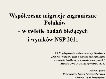 Współczesne migracje zagraniczne Polaków - w świetle badań bieżących i wyników NSP 2011 III Międzynarodowa Konferencja Naukowa „Jakość i warunki życia a procesy demograficzne w Europie Środkowej w czasach nowożytnych” Zielona Góra 24-25 października 2012 r. Dorota Szałtys Departament Badań Demograficznych Główny Urząd Statystyczny Współczesne migracje Różnorodność form migracji: migracje definitywne długookresowe krótkookresowe sezonowe migracje wymuszone (niedobrowolne) migracje nielegalne Współczesne migracje Push i pull factors Asymetria w poziomie rozwoju społecznogospodarczego ludności w poszczególnych krajach Problemy na rynku pracy Położenie kraju docelowego Liberalizacja dostępu do rynku pracy lub jej brak Popyt na pracę imigrantów Istnienie powiązań generacyjnych pomiędzy imigrantami Migracje zagraniczne na pobyt stały w latach 2002-2011 Saldo migracji (w tys.) 0 2002 2003 2004 2005 2006 2007 2008 -5 -10 2010 -1,2 -2,2 2011 -4,4 -9,4 -15 -20 2009 -13,8 -17,9 -14,8 -16,8 -20,5 -25 -30 -35 -40 -36,1 4 Ludność czasowo nieobecna, w związku z wyjazdem za granicę na okres ponad 3 miesiące w latach 2000-2011 (w tys.) 54,8 2011 68,8 2009 88,3 2008 72,8 2007 50,8 2006 31,1 2005 20,7 17,4 16,6 15,4 15,3 2004 2003 2002 2001 2000 0 20 40 60 80 100 5 Emigracja z Polski do krajów UE na okres co najmniej 12 miesięcy w latach 2008-2011 70000 60000 50000 40000 30000 20000 10000 0 2008 2009 2010 2011 6 Emigranci przebywający czasowo za granicą powyżej 3 miesięcy w latach 2004-2011 (dane szacunkowe - stan w końcu roku*) w tys. 2500 2270 1950 2000 2100 2000 2017 2060 2010 NSP 2011 2011 1450 1500 1000 2210 786 1000 500 0 NSP 2002 2004 2005 2006 2007 2008 2009 * Dane zaznaczone na żółto stanowią wyniki spisów powszechnych ludności i mieszkań (2002 – według stanu w dniu 20 maja, w 2011 – według stanu w dniu 31 marca). Emigranci przebywający czasowo za granicą powyżej 3 miesięcy według miejsca przebywania w 2011 r. – dane szacunkowe 0 Ogółem Europa Kraje UE Kraje europejskie spoza UE Kraje poza Europą 500 1000 1500 2000 2500 w tys. Emigranci przebywający czasowo powyżej 3 miesięcy za granicą według kraju przebywania w 2011 r. 0 Wielka Brytania Niemcy Stany Zjednoczone Irlandia Włochy Niderlandy Francja Kanada Belgia Hiszpania Norwegia Szwecja Austria Dania Grecja 5 10 15 20 25 438 tys. 243 tys. 131 tys. 94 tys. 92 tys. 62 tys. 52 tys. 47 tys. 45 tys. 43 tys. 34 tys. 24 tys. 17 tys. 17 tys. 30 % 601 tys. Liczba emigrantów na 1000 mieszkańców – NSP 2002 i NSP 2011 Emigranci według stanu cywilnego – NSP 2011 rozwiedzeni/ rozwiedzione 6,8 nieustalony 12,9 wdowcy/wdowy 1,9 żonaci/zamężne 44,6 kawalerowie/ panny 33,9 Emigranci według poziomu wykształcenia – NSP 2011 podstawowe gimnazjalne 6,3 2,3 pozostałe 0,3 wyższe 22,8 zasadnicze zawodowe 24,1 średnie i policealne 44,2 Emigranci według płci i wieku – NSP 2011 250 200 w tys. 150 100 50 0 mężczyźni kobiety 13 Zgodność wykonywanej pracy za granicą z kwalifikacjami (dla osoby, która powróciła) – NSP 2011 nie ustalono 0,0 nie posiadałem kwalifikacji 3,5 trudno okreslić 19,3 nie - poniżej kwalifikacji 3,1 tak, zgodna 52,7 nie - poniżej kwalifikacji 21,4 Przyczyny emigracji na pobyt czasowy – NSP 2011 16,0 sprawy rodzinne 6,0 edukacja 73,0 praca 0 10 20 30 40 50 60 70 80 Przyczyny powrotu emigrantów do kraju – NSP 2011 3,5 3,5 3,9 0,1 17,8 1,4 7,7 32,1 2,5 24,1 3,5 poprawa sytuacji na rynku pracy w Polsce zamiar rozpoczęcia działalności gospodarczej w Polsce zaoszczędzenie planowanej kwoty pieniężnej utrata pracy i trudności w znalezieniu innej za granicą trudności w znalezieniu pierwszej pracy za granicą zakończenie kontraktu tęsknota za rodziną zakończenie nauki, studiów za granicą przejście na emeryturę i chęć spędzenia tego okresu w Polsce towarzyszenie rodzinie inne Podsumowanie • Wzrost mobilności Polaków za granicę, w szczególności osób z wykształceniem co najmniej średnim jest zjawiskiem zgodnym z tendencjami migracji w skali światowej. • Główne czynniki, które skłaniają do emigracji to: trudna sytuacja na krajowym rynku pracy. Emigracji sprzyja otwarcie rynków pracy przez kraje UE oraz prowadzona przez te kraje polityka nastawiona na pozyskiwanie specjalistów z określonymi umiejętnościami a także osób wykształconych vide polityka w Niemczech otwieranie szkół zawodowych, wysokie pensje dla informatyków Podsumowanie • Odpływ osób młodych może spowodować w dłuższym okresie niekorzystne zmiany w strukturze ludności oraz zakłócenia w rozwoju demograficznym w Polsce • Konsekwencją wyjazdów zwłaszcza długookresowych lub na pobyt stały może być wyludnianie się regionów peryferyjnych • Społeczne konsekwencje np. koszty psychiczne związane z rozstaniem z rodziną, praca poniżej kwalifikacji, Podsumowanie Z drugiej jednak strony : • Poznanie języka, kultury, zdobycie wykształcenia • Możliwość podjęcia pracy • Rozpoczęcie działalności gospodarczej, pobudzenie lokalnego rynku pracy DZIĘKUJĘ ZA UWAGĘ