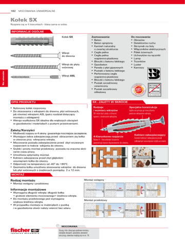182 MOCOWANIA UNIWERSALNE Kołek SX Rozpiera się w 4 kierunkach - klasa sama w sobie. INFORMACJE OGÓLNE Kołek SX Zastosowanie: ▪ Beton ▪ Beton sprężony ▪ Kamień naturalny o zwartej strukturze ▪ Cegła pełna ▪ Cegła pełna wapienno-piaskowa ▪ Bloczki z betonu lekkiego ▪ Gazobeton ▪ Panele z płyt gipsowych ▪ Pustaki z betonu lekkiego ▪ Perforowana cegła wapienno-piaskowa ▪ Bloczki z betonu lekkiego ▪ Pustak szczelinowy ceramiczny ▪ Pustak szczelinowy silikatowy Wkręt do drewna Moc. uniwersalne Wkręt do płyty wiórowej Wkręt ASL Do mocowania: ▪ Obrazów ▪ Detektorów ruchu ▪ Skrzynek na listy ▪ Włączników elektrycznych ▪ Półek ściennych ▪ Uchwytów na ręczniki ▪ Lamp ▪ Trzonków ▪ Luster ▪ Karniszy SX - ZALETY W SKRÓCIE Opis produktu Rodzaje i wymiary wkrętów SX może być użyty z różnymi typami i średnicami wkrętów. ▪ Nylonowy kołek rozporowy. ▪ Do stosowania z wkrętami do drewna, płyt wiórowych, jak również wkrętami ASL (patrz rozdział dotyczący montażu z odstępem) ▪ Wersja wydłużona SX idealna dla większych obciążeń w gazobetonie i materiałach z pustymi przestrzeniami. Specjalna konstrukcja dybla utrzymuje go nieruchomo podczas wkręcania wkręta. Zalety/Korzyści ▪ Możliwość rozporu w 4 strony gwarantuje mocniejsze zaczepienie. ▪ Wystające żebra zabezpieczają przed obracaniem się kołka w otworze przy wkręcaniu wkręta. ▪ Mocowanie posiada zabezpieczenie przed zbyt wczesnym rozparciem w trakcie wbijania do otworu. ▪ Szybki i prosty montaż przelotowy pozwala na znaczne skrócenie czasu pracy. ▪ Umożliwia optymalny montaż. ▪ Kołnierz zabezpiecza przed zbyt głębokim wsunięciem kołka do otworu. ▪ Odporność na temperatury od -40° do +80°C. ▪ Geometria kołka umożliwia stosowanie wkrętów do drewna lub płyt wiórowych o średnicach pomiędzy 2 a 12 mm. 4-Kierunkowe rozparcie Nowe 4 – kierunkowe rozparcie gwarantuje lepsze dopasowanie do otworu. MONTAŻ Montaż wstępny Rodzaj montażu ▪ Montaż wstępny i przelotowy Informacje montażowe ▪ Wymagana długość wkręta: długość kołka + grubość elementu mocowanego+ średnica wkręta. ▪ Do montażu przelotowego jest wymagana większa średnica wkręta. ▪ W przypadku montażu w materiałach z pustką i w gazobetonie otwór należy wiercić bez udaru. Montaż przelotowy MOCOWANIA T E C H N I K A M O C O W A N I A Szczeg. infor. dotyczące podstaw montażu, rodzajów obciążeń, sposobów zakotwień oraz przyg. otworów znajdują się na str. 16. Kołnierz zabezpieczający Szeroki kołnierz zabezpiecza przed całkowitym wsunięciem dybla w otwór. 183 DANE TECHNICZNE Typ Art.-Nr 70004 70005 70006 24827 78185 70008 24828 70010 24829 70012 70014 70016 SX 4 x 20 SX 5 x 25 SX 6 x 30 SX 6 x 50 * SX 6 x 50 R SX 8 x 40 SX 8 x 65 SX 10 x 50 SX 10 x 80 SX 12 x 60 SX 14 x 70 SX 16 x 80 PZ 4 1 8 0 2 2 7 5 4 9 3 7 Kołek SX - wersja przedłużona Aprobata Wiertło Min. głębokość wiercenia Dług. kołka = min. głębokość kotwienia Wkręt do płyty wiórowej do [mm] t l = hef ITB [mm] [mm] ds x ls [Ø mm] szt. 4 5 6 6 6 8 8 10 10 12 14 16 25 35 40 60 60 50 75 70 95 80 90 100 20 25 30 50 50 40 65 50 80 60 70 80 2-3 3-4 4-5 4-5 4-5 4,5 - 6 4,5 - 6 6-8 6-8 8 - 10 10 - 12 12 (1/2“) 200 100 100 100 100 100 50 50 25 25 20 10 Ilość w opakowaniu Moc. uniwersalne Kołek SX * wersja przedłużona bez kołnierza Kołek SX z wkrętem Typ SX 6 x 30 S/10 SX 8 x 40 S/20 Art.-Nr 1) 1) 70021 70022 PZ Wiertło 1 8 Min. głębokość wiercenia Dług. kołka = min. głębokość kotwienia Maks. dług. użytkowa Wkręt do płyty wiórowej Ilość w opakowaniu do [mm] t l = hef [mm] [mm] t fix [mm] ds x ls [Ø mm] szt. 6 8 40 50 30 40 10 20 4,5 x 40 5 x 60 50 50 1) Opakowanie zawiera kołki i wkręty. OBCIĄŻENIA Zalecane obciążenia Nrec [kN] i obciążenia niszczące Nu [kN]. Wartości w przypadku użycia wkrętów do drewna. W przypadku użycia wkrętów do płyt wiórowych wartości należy zredukować o 30%. Typ kotwy Średnica wkręta [mm] Obciążenie Beton ≧ C12/C15 Cegła pełna ≧ Mz12 (DIN 105) Cegła pełna wapienno-piask. ≧ KS12 (DIN 106) Cegła kratówka ≧ Hlz12 (ρ ≧ 1.0 kg/dm3, DIN 105) Cegła kratówka ≧ KSL12(DIN 106) Gazobeton ≧ PB2 Gazobeton ≧ PB4 1) SX 5 x 25 SX 6 x 30 4 5 Nrec 0.3 0.3 0.3 0.07 0.17 0.03 0.09 Nu 2.0 1.6 2.0 0.5 1.2 0.2 0.6 Nrec 0.7 0.3 0.5 0.07 0.3 0.03 0.09 Nu 4.9 2.2 3.5 0.5 2.1 0.2 0.6 SX 6 x 50 SX 6 x 50 R 5 Nrec Nu 0.8 5.8 0.6 4.4 0.8 5.4 –1) –1) 0.3 2.7 –1) –1) 0.15 1.0 SX 8 x 40 SX 8 x 65 SX 10 x 50 SX 10 x 80 SX 12 x 60 SX 14 x 70 SX 16 x 80 6 Nrec 0.7 0.65 1.2 0.17 0.3 0.09 0.3 6 Nu 8.5 4.5 8.5 1.2 2.0 0.6 2.0 Nrec 0.7 0.6 0.6 0.17 0.35 0.04 0.14 8 Nu 5.0 4.1 4.2 1.2 2.3 0.3 1.0 Nrec 1.2 0.65 1.2 0.17 0.3 0.09 0.3 8 Nu 8.5 4.5 8.5 1.2 2.0 0.6 2.0 Nrec 1.2 1.2 1.2 0.5 0.8 0.2 0.6 10 Nu 8.5 8.5 8.5 3.5 5.5 1.4 4.2 Nrec 1.7 0.7 1.7 0.26 0.3 0.14 0.45 12 Nu 12.0 5.0 12.0 1.8 2.0 1.0 3.1 Nrec 2.0 0.8 2.0 0.4 0.3 0.3 0.5 12 Nu 14.1 5.6 14.1 3.1 2.2 2.2 3.4 Nrec 2.6 0.9 2.6 0.6 0.4 0.4 0.6 Nu 18.0 6.9 18.0 4.1 2.8 2.8 4.0 W niektórych przypadkach nie można podać stałych wartości ze względu na szeroki zakres wyników testów spowodowany charakterystyką podłoża. Odległość od krawędzi podłoża (odległość od krawędzi ar) w betonie Mocowanie SX 6 x 30 SX 8 x 40 SX 10 x 50 SX 12 x 60 Średnica wkręta [mm] 5 6 8 10 Odległość od krawędzi [mm] 35 40 50 65 T E C H N I K A M O C O W A N I A
