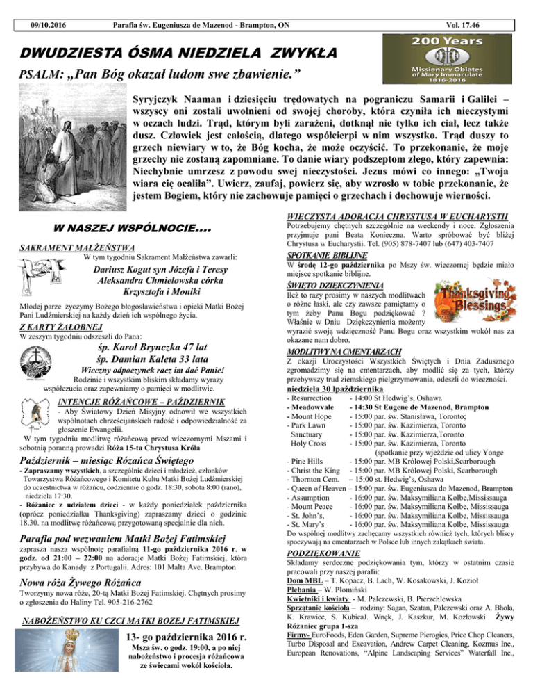 Parafia św. Eugeniusza de Mazenod - Brampton, ON 09/10.2016 Vol. 17.46 DWUDZIESTA ÓSMA NIEDZIELA ZWYKŁA PSALM: „Pan Bóg okazał ludom swe zbawienie.” Syryjczyk Naaman i dziesięciu trędowatych na pograniczu Samarii i Galilei – wszyscy oni zostali uwolnieni od swojej choroby, która czyniła ich nieczystymi w oczach ludzi. Trąd, którym byli zarażeni, dotknął nie tylko ich ciał, lecz także dusz. Człowiek jest całością, dlatego współcierpi w nim wszystko. Trąd duszy to grzech niewiary w to, że Bóg kocha, że może oczyścić. To przekonanie, że moje grzechy nie zostaną zapomniane. To danie wiary podszeptom złego, który zapewnia: Niechybnie umrzesz z powodu swej nieczystości. Jezus mówi co innego: „Twoja wiara cię ocaliła”. Uwierz, zaufaj, powierz się, aby wzrosło w tobie przekonanie, że jestem Bogiem, który nie zachowuje pamięci o grzechach i dochowuje wierności. W NASZEJ WSPÓLNOCIE.... SAKRAMENT MAŁŻEŃSTWA W tym tygodniu Sakrament Małżeństwa zawarli: Dariusz Kogut syn Józefa i Teresy Aleksandra Chmielowska córka Krzysztofa i Moniki Młodej parze życzymy Bożego błogosławieństwa i opieki Matki Bożej Pani Ludźmierskiej na każdy dzień ich wspólnego życia. Z KARTY ŻAŁOBNEJ W zeszym tygodniu odszeszli do Pana: śp. Karol Brynczka 47 lat śp. Damian Kaleta 33 lata Wieczny odpoczynek racz im dać Panie! Rodzinie i wszystkim bliskim składamy wyrazy współczucia oraz zapewniamy o pamięci w modlitwie. WIECZYSTA ADORACJA CHRYSTUSA W EUCHARYSTII Potrzebujemy chętnych szczególnie na weekendy i noce. Zgłoszenia przyjmuje pani Beata Konieczna. Warto spróbować być bliżej Chrystusa w Eucharystii. Tel. (905) 878-7407 lub (647) 403-7407 SPOTKANIE BIBLIJNE W środę 12-go października po Mszy św. wieczornej będzie miało miejsce spotkanie biblijne. ŚWIĘTO DZIĘKCZYNIENIA Ileż to razy prosimy w naszych modlitwach o różne łaski, ale czy zawsze pamiętamy o tym żeby Panu Bogu podziękować ? Właśnie w Dniu Dziękczynienia możemy wyrazić swoją wdzięczność Panu Bogu oraz wszystkim wokół nas za okazane nam dobro. MODLITWY NA CMENTARZACH Z okazji Uroczystości Wszystkich Świętych i Dnia Zadusznego zgromadzimy się na cmentarzach, aby modlić się za tych, którzy przebywszy trud ziemskiego pielgrzymowania, odeszli do wieczności. niedziela 30 lpaździernika (oprócz poniedziałku Thanksgiving) zapraszamy dzieci o godzinie 18.30. na modlitwę różańcową przygotowaną specjalnie dla nich. - 14:00 St Hedwig’s, Oshawa - 14:30 St Eugene de Mazenod, Brampton - 15:00 par. św. Stanisława, Toronto; - 15:00 par. św. Kazimierza, Toronto - 15:00 par. św. Kazimierza,Toronto - 15:00 par. św. Kazimierza, Toronto (spotkanie przy wjeździe od ulicy Yonge - Pine Hills - 15:00 par. MB Królowej Polski,Scarborough - Christ the King - 15:00 par. MB Królowej Polski, Scarborough - Thornton Cem. – 15:00 st. Hedwig’s, Oshawa - Queen of Heaven – 15:00 par. św. Eugeniusza do Mazenod, Brampton - Assumption - 16:00 par. św. Maksymiliana Kolbe,Mississauga - Mount Peace - 16:00 par. św. Maksymiliana Kolbe, Mississauga - St. John’s, - 16:00 par. św. Maksymiliana Kolbe, Mississauga - St. Mary’s - 16:00 par. św. Maksymiliana Kolbe, Mississauga Parafia pod wezwaniem Matki Bożej Fatimskiej Do wspólnej modlitwy zachęcamy wszystkich również tych, których bliscy spoczywają na cmentarzach w Polsce lub innych zakątkach świata. INTENCJE RÓŻAŃCOWE – PAŹDZIERNIK - Aby Światowy Dzień Misyjny odnowił we wszystkich wspólnotach chrześcijańskich radość i odpowiedzialność za głoszenie Ewangelii. W tym tygodniu modlitwę różańcową przed wieczornymi Mszami i sobotnią poranną prowadzi Róża 15-ta Chrystusa Króla Październik – miesiąc Rózańca Świętego - Zapraszamy wszystkich, a szczególnie dzieci i młodzież, członków Towarzystwa Różańcowego i Komitetu Kultu Matki Bożej Ludźmierskiej do uczestnictwa w różańcu, codziennie o godz. 18:30, sobota 8:00 (rano), niedziela 17:30. - Różaniec z udziałem dzieci - w każdy poniedziałek października zaprasza nasza wspólnotę parafialną 11-go października 2016 r. w godz. od 21:00 – 22:00 na adoracje Matki Bożej Fatimskiej, która przybywa do Kanady z Portugalii. Adres: 101 Malta Ave. Brampton Nowa róża Żywego Różańca Tworzymy nowa róże, 20-tą Matki Bożej Fatimskiej. Chętnych prosimy o zgłoszenia do Haliny Tel. 905-216-2762 NABOŻEŃSTWO KU CZCI MATKI BOZEJ FATIMSKIEJ 13- go października 2016 r. Msza św. o godz. 19:00, a po niej nabożeństwo i procesja różańcowa ze świecami wokół kościoła. - Resurrection - Meadowvale - Mount Hope - Park Lawn Sanctuary Holy Cross PODZIĘKOWANIE Składamy serdeczne podziękowania tym, którzy w ostatnim czasie pracowali przy naszej parafii: Dom MBL – T. Kopacz, B. Lach, W. Kosakowski, J. Kozioł Plebania – W. Płomiński Kwietniki i kwiaty - M. Palczewski, B. Pierzchlewska Sprzątanie kościoła – rodziny: Sagan, Szatan, Palczewski oraz A. Bhola, K. Krawiec, S. KubicaJ. Wnęk, J. Kaszkur, M. Kozłowski Żywy Różaniec grupa 1-sza Firmy- EuroFoods, Eden Garden, Supreme Pierogies, Price Chop Cleaners, Turbo Disposal and Excavation, Andrew Carpet Cleaning, Kozmus Inc., European Renovations, “Alpine Landscaping Services” Waterfall Inc., Brampton Marble and Granite Corp., M. Matkowski, B. Zub za stałą pomo cw utrzymaniu naszej parafii. - Serdeczne dziękujemy pani Halinie Paliga z Parafii św. Maksymiliana Kolbe w Mississaudze za ufundowanie dla naszej wspólnoty transparentu w obronie życia dzieci nienarodzonych. Niech Bóg błogosławi pani i rodzinie. SPRZĄTANIE KOŚCIOŁA ODBYWA SIĘ W PIĄTKI Piątek 14-go października – Lektorzy, Szafarze i wszyscy chętni. Serdeczne Bóg zapłać! KATECHEZA W JĘZYKU ANGIELSKIM Zapisy na katechezę w j. angielskim odbywają się dzisiaj (ostatni dzień) przed i po Mszy św. o godz. 9:30 SPOTKANIE MŁODZIEŻY Zapraszamy młodzież , która uc
