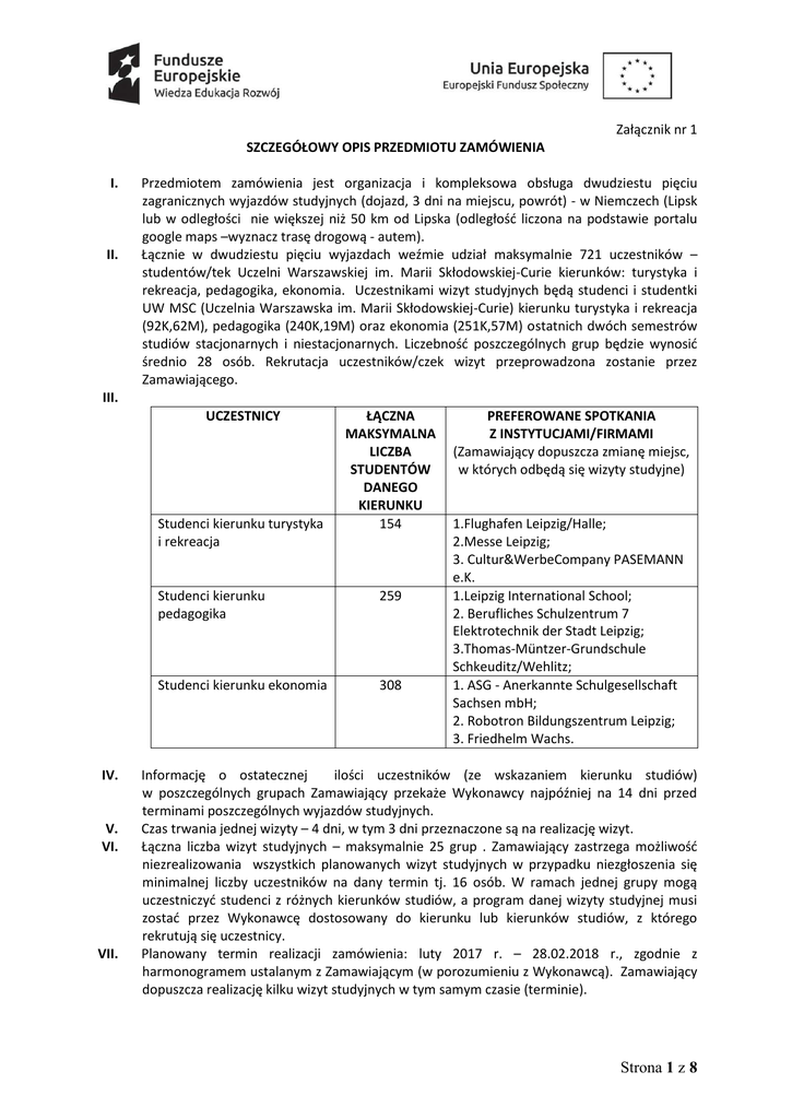 Załącznik nr 1 SZCZEGÓŁOWY OPIS PRZEDMIOTU ZAMÓWIENIA I. II. Przedmiotem zamówienia jest organizacja i kompleksowa obsługa dwudziestu pięciu zagranicznych wyjazdów studyjnych (dojazd, 3 dni na miejscu, powrót) - w Niemczech (Lipsk lub w odległości nie większej niż 50 km od Lipska (odległość liczona na podstawie portalu google maps –wyznacz trasę drogową - autem). Łącznie w dwudziestu pięciu wyjazdach weźmie udział maksymalnie 721 uczestników – studentów/tek Uczelni Warszawskiej im. Marii Skłodowskiej-Curie kierunków: turystyka i rekreacja, pedagogika, ekonomia. Uczestnikami wizyt studyjnych będą studenci i studentki UW MSC (Uczelnia Warszawska im. Marii Skłodowskiej-Curie) kierunku turystyka i rekreacja (92K,62M), pedagogika (240K,19M) oraz ekonomia (251K,57M) ostatnich dwóch semestrów studiów stacjonarnych i niestacjonarnych. Liczebność poszczególnych grup będzie wynosić średnio 28 osób. Rekrutacja uczestników/czek wizyt przeprowadzona zostanie przez Zamawiającego. III. UCZESTNICY Studenci kierunku turystyka i rekreacja IV. V. VI. VII. ŁĄCZNA MAKSYMALNA LICZBA STUDENTÓW DANEGO KIERUNKU 154 Studenci kierunku pedagogika 259 Studenci kierunku ekonomia 308 PREFEROWANE SPOTKANIA Z INSTYTUCJAMI/FIRMAMI (Zamawiający dopuszcza zmianę miejsc, w których odbędą się wizyty studyjne) 1.Flughafen Leipzig/Halle; 2.Messe Leipzig; 3. Cultur&WerbeCompany PASEMANN e.K. 1.Leipzig International School; 2. Berufliches Schulzentrum 7 Elektrotechnik der Stadt Leipzig; 3.Thomas-Müntzer-Grundschule Schkeuditz/Wehlitz; 1. ASG - Anerkannte Schulgesellschaft Sachsen mbH; 2. Robotron Bildungszentrum Leipzig; 3. Friedhelm Wachs. Informację o ostatecznej ilości uczestników (ze wskazaniem kierunku studiów) w poszczególnych grupach Zamawiający przekaże Wykonawcy najpóźniej na 14 dni przed terminami poszczególnych wyjazdów studyjnych. Czas trwania jednej wizyty – 4 dni, w tym 3 dni przeznaczone są na realizację wizyt. Łączna liczba wizyt studyjnych – maksymalnie 25 grup . Zamawiający zastrzega możliwość niezrealizowania wszystkich planowanych wizyt studyjnych w przypadku niezgłoszenia się minimalnej liczby uczestników na dany termin tj. 16 osób. W ramach jednej grupy mogą uczestniczyć studenci z różnych kierunków studiów, a program danej wizyty studyjnej musi zostać przez Wykonawcę dostosowany do kierunku lub kierunków studiów, z którego rekrutują się uczestnicy. Planowany termin realizacji zamówienia: luty 2017 r. – 28.02.2018 r., zgodnie z harmonogramem ustalanym z Zamawiającym (w porozumieniu z Wykonawcą). Zamawiający dopuszcza realizację kilku wizyt studyjnych w tym samym czasie (terminie). Strona 1 z 8 VIII. Każda z wizyt studyjnych zostanie zorganizowana w dni robocze tj. od poniedziałku do piątku. Zamawiający dopuszcza aby transfer – wyjazd uczestników odbywał się w niedzielę. Wizyty studyjne odbywać się będą w instytucjach wskazanych przez Wykonawcę w uzgodnieniu z Zamawiającym. Wykonawca zobowiązany jest uwzględnić w propozycjach miejsca preferowane przez Zamawiającego lub/i wskazane przez Zamawiającego podczas realizacji przedmiotu zamówienia. a. Celem wizyt studyjnych jest zdobycie teoretycznej i praktycznej wiedzy z obszaru społecznego, w szczególności : UCZESTNICY CEL WIZYTY STUDYJNEJ Studenci kierunku turystyka i rekreacja. Studenci kierunku pedagogika. Studenci kierunku ekonomia. Wzmocnienie kompetencji zawodowych, komunikacyjnych i przedsiębiorczych, wymiana dobrych praktyk w zakresie najskuteczniejszych sposobów wzmacniania kompetencji i budowania efektywnych ścieżek rozwoju zawodowego wśród studentów danego kierunku studiów z wykorzystaniem doświadczeń międzynarodowych. Podczas wizyty studenci/tki będą wykorzystywać i rozwijać w praktyce posiadane umiejętności zawodowe, komunikacyjne i przedsiębiorcze oraz rozwijać kompetencje umożliwiające pracę w zespołach międzykulturowych. W trakcie wizyty planuje się wykorzystanie metody job shadowing oraz pracy warsztatowej z wykorzystaniem case study. b. Tematyka organizowanych wizyt obejmuje następujące zagadnienia: UCZESTNICY TEMATYKA WIZYTY STUDYJNEJ Studenci kierunku turystyka i rekreacja. Studenci kierunku pedagogika. Studenci kierunku ekonomia. wymiana dobrych praktyk w zakresie najskuteczniejszych sposobów wzmacniania kompetencji i budowania efektywnych ścieżek rozwoju zawodowego wśród studentów kierunku turystyka i rekreacja, pedagogika oraz ekonomia z wykorzystaniem doświadczeń międzynarodowych; - praca w zespołach międzykulturowych ; - job shadowing; - praca warsztatowa z wykorzystaniem case study w obszarze danego kierunku studiów, właściwego dla uczestników wizyty studyjnej; - aktualna problematyka zatrudnieniowa w branży turystyczno-rekreacyjnej, pedagogicznej, ekonomicznej; trendy i oczekiwania rynkowe oraz wyzwania stojące przed studentami i absolwentami jako przyszłymi pracownikami; - prezentacja wizytowanego podmiotu, w tym geneza utworzenia, obszar działalności, struktura zarządzania, przedmiot działalności; Strona 2 z 8 - analiza barier i trudności w procesie rozwoju wizytowanego podmiotu (w tym: początek działalności, pozyskiwanie klientów, wyznaczanie kierunków rozwoju, porażki i niepowodzenia, perspektywy rozwoju, konkurencyjność i innowacja). c. Ramowy program wizyt studyjnych: 1 dzień - około godz. 12:00 wyjazd spod siedziby Zamawiającego, - 12:00 -20:00 podróż uczestników z Warszawy do Niemiec (miejsca zakwaterowania uczestników) - około godziny 20:00 przyjazd do miejsca zakwaterowania, zakwaterowanie uczestników - spotkanie organizacyjne w miejscu zakwaterowania - kolacja 2 dzień (wizyta studyjna planowana w godz. 9:00-17:00) - śniadanie - wizyta studyjna w podmiocie zagranicznym nr. 1 specyficznym dla kierunku kształcenia cz. 1/2 - obiad - wizyta studyjna w podmiocie zagranicznym nr. 1 specyficznym dla kierunku kształcenia cz. 2/2 - kolacj